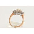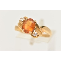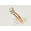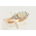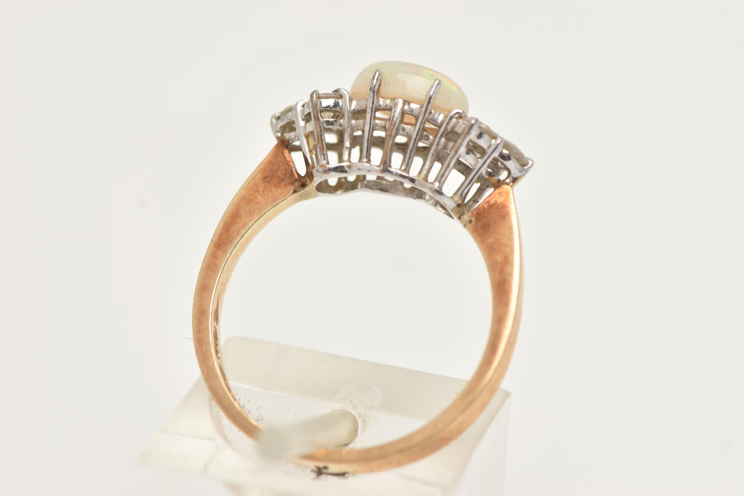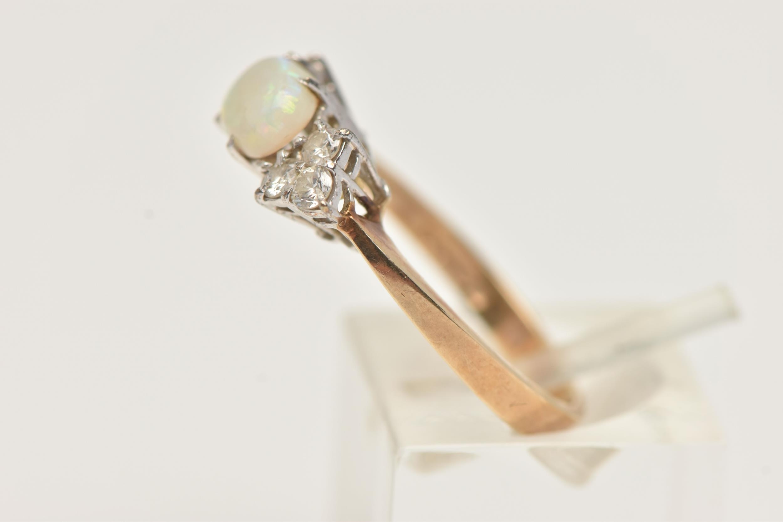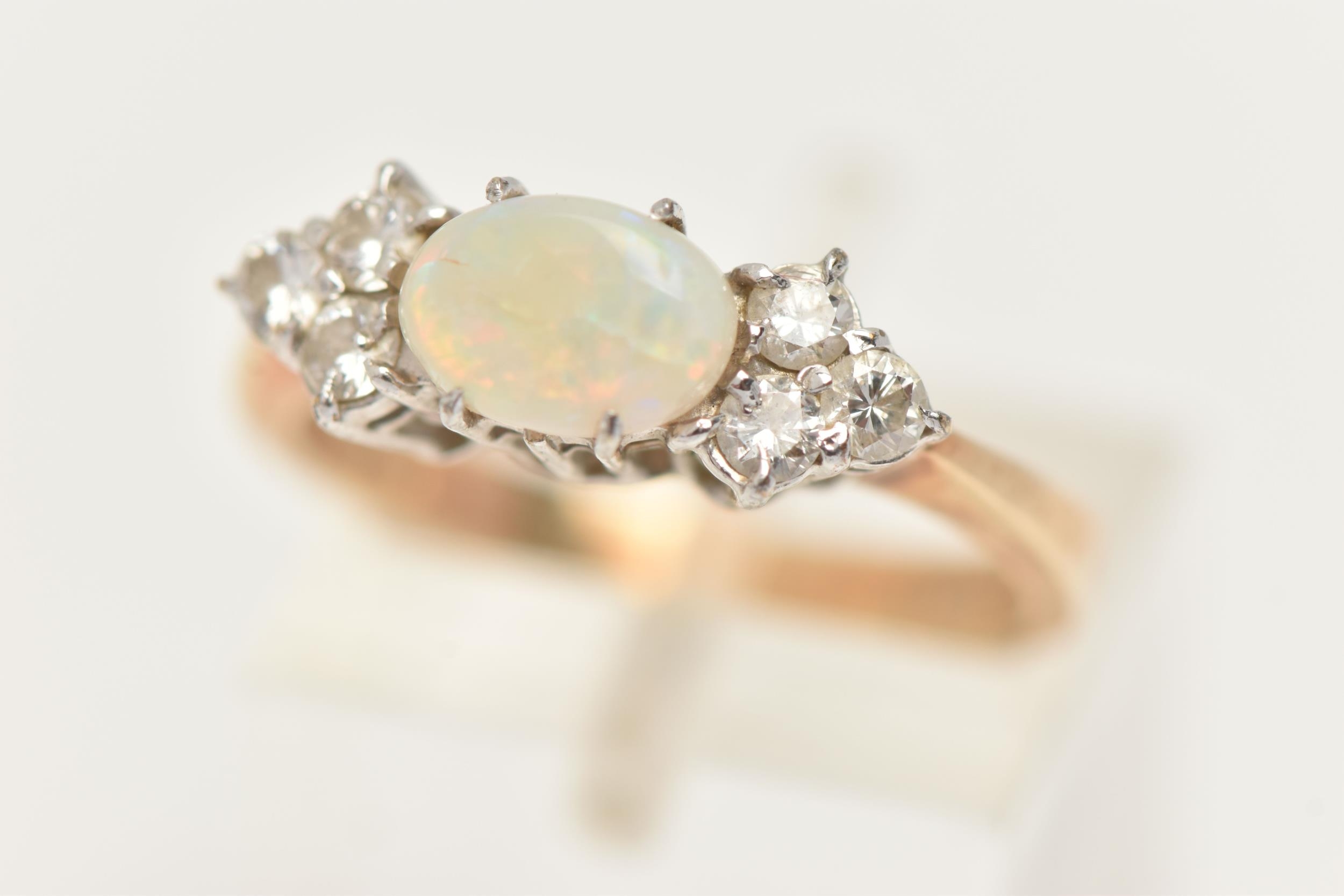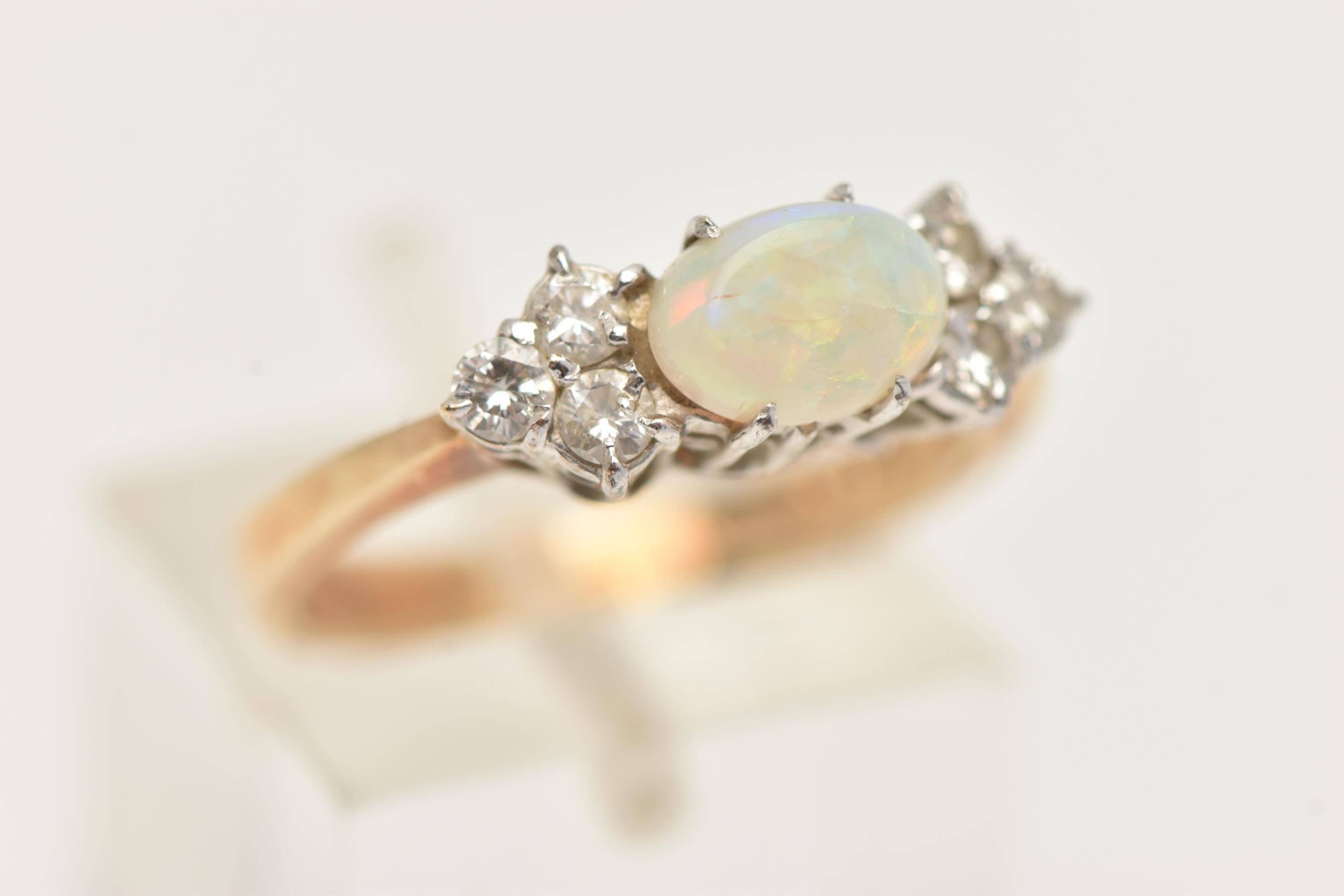 A 9CT GOLD OPAL AND DIAMOND RING, set with a central oval cut opal cabochon, four claw set and flanked with six round brilliant cut diamonds, estimated total diamond weight 0.30ct, in a white metal mount, leading onto a pinched shoulder and polished yellow gold band, hallmarked 9ct London, ring size M 1/2, approximate gross weight 2.9 grams (condition report: general light wear, stones secure, would benefit from a gentle clean)
