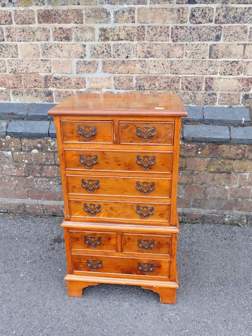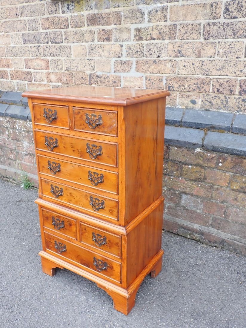 A REPRODUCTION YEW-WOOD FINISH MINIATURE TALLBOY of Georgian design, 76cm high, 44cm wide