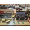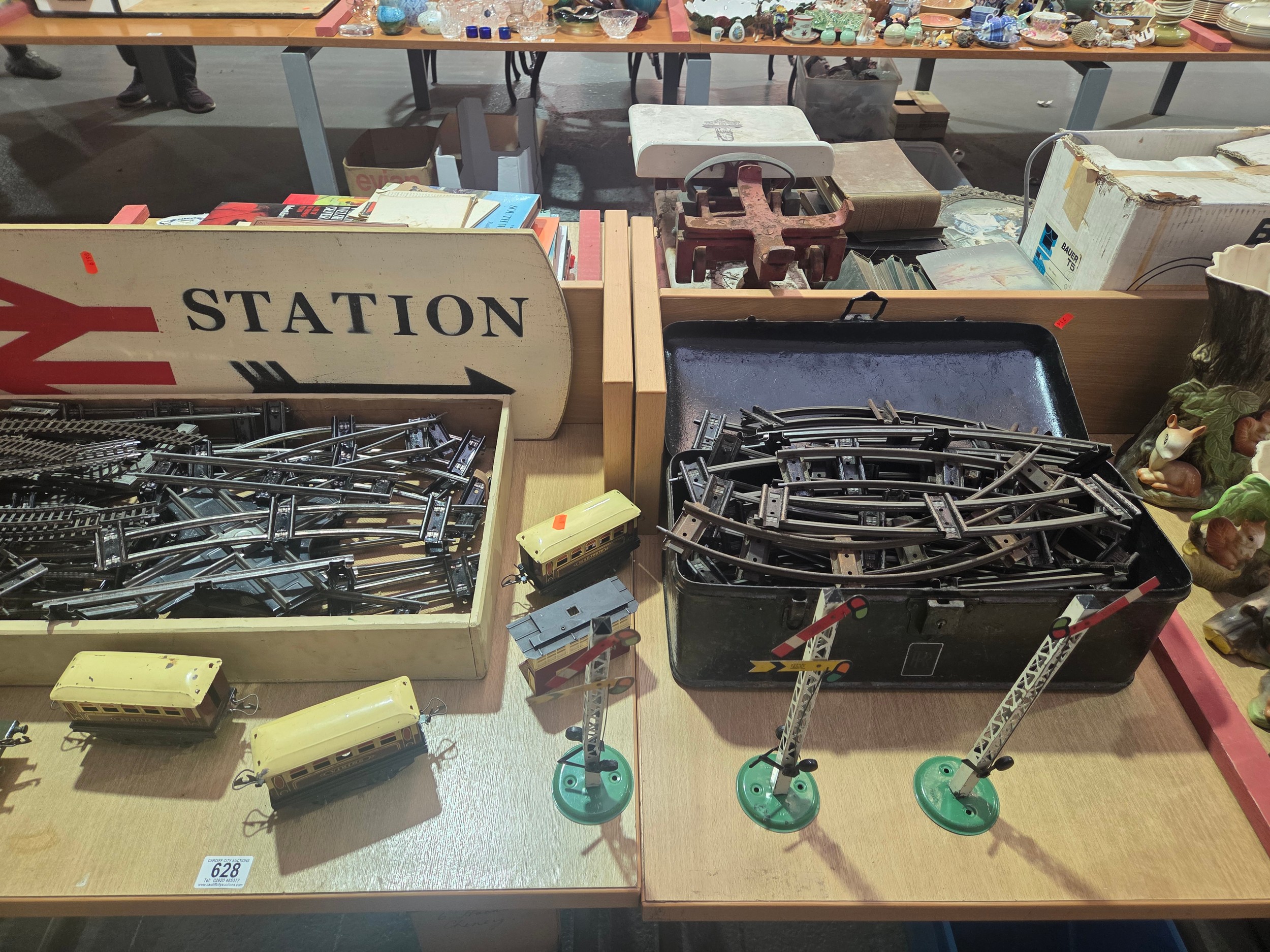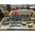 A selection of Hornby O gauge wagons, track and accessories, Triang trucks and a wooden "Station" sign