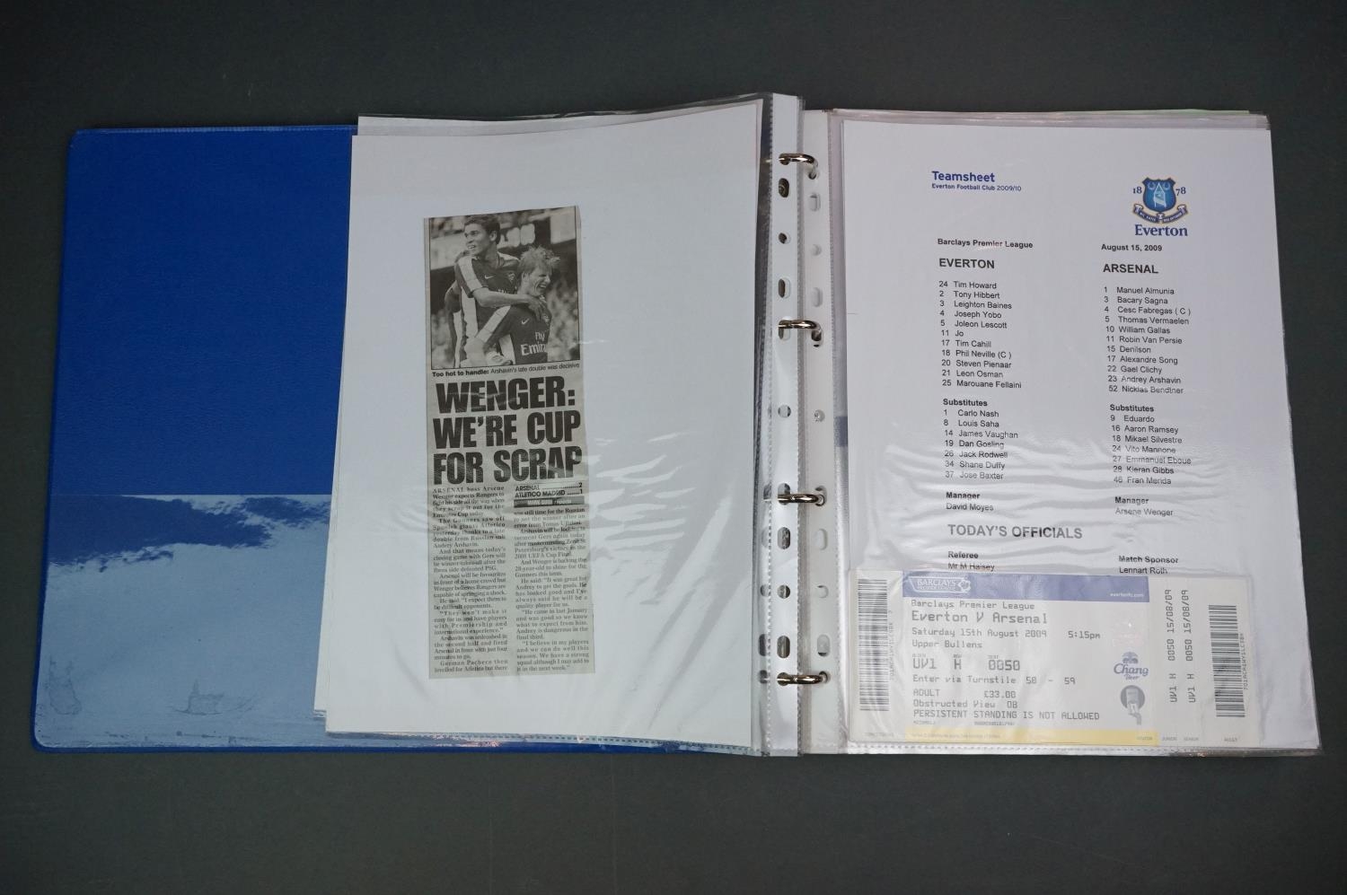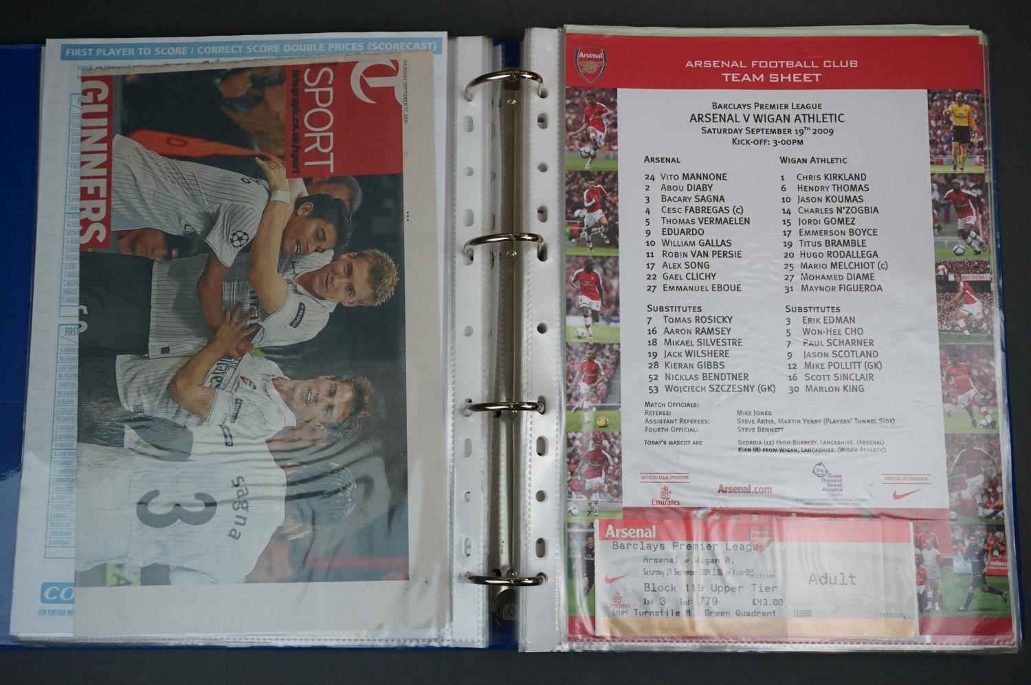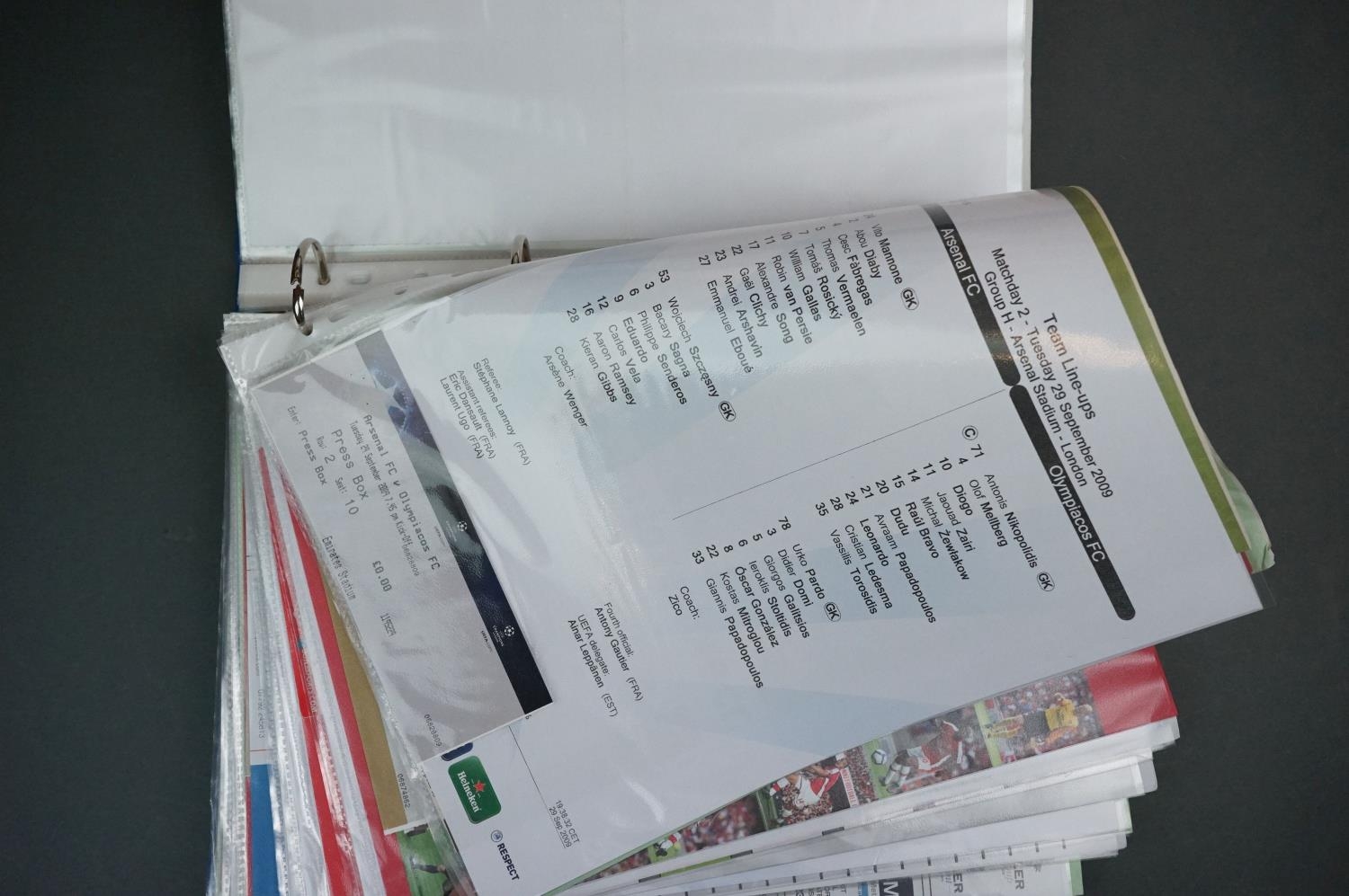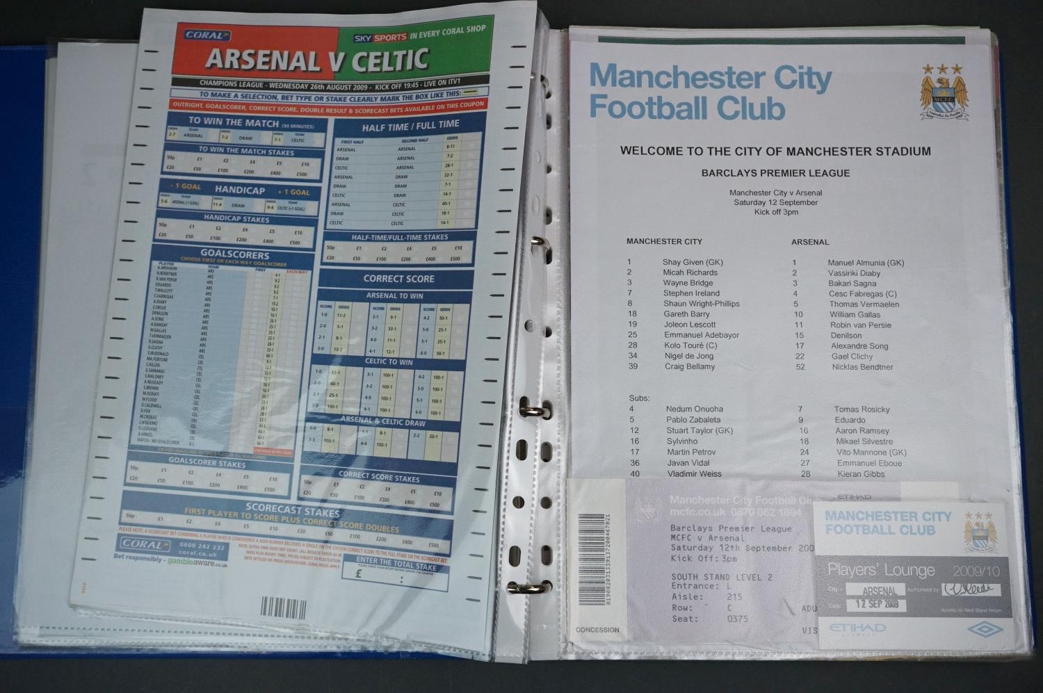 Football - Arsenal fc 2009/10, a binder containing a collection of teamsheets, tickets, menus etc, to include League, Cup, Champions League etc, gen vg (100+ items)