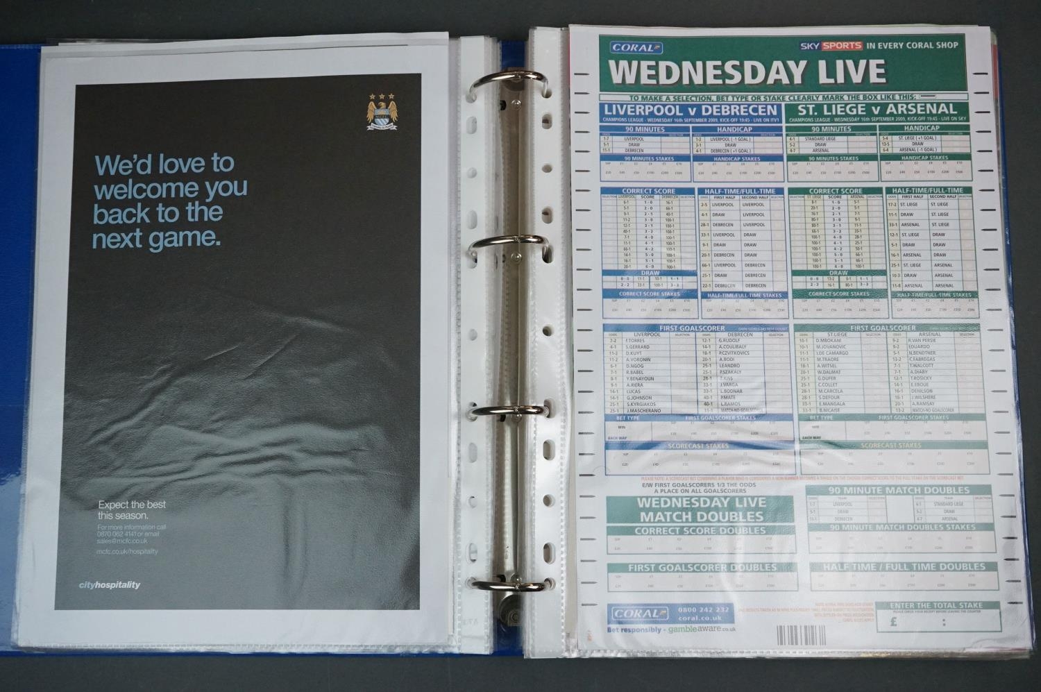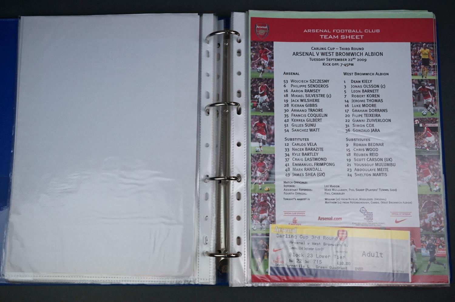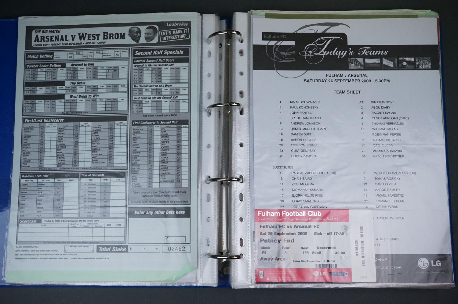 Football - Arsenal fc 2009/10, a binder containing a collection of teamsheets, tickets, menus etc, to include League, Cup, Champions League etc, gen vg (100+ items)