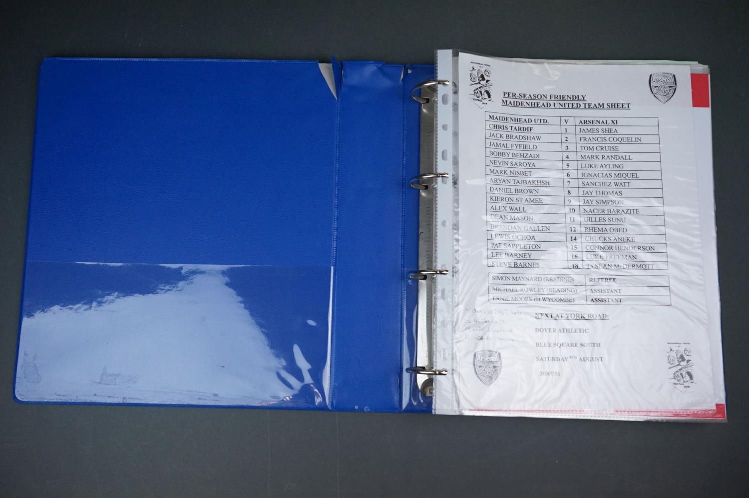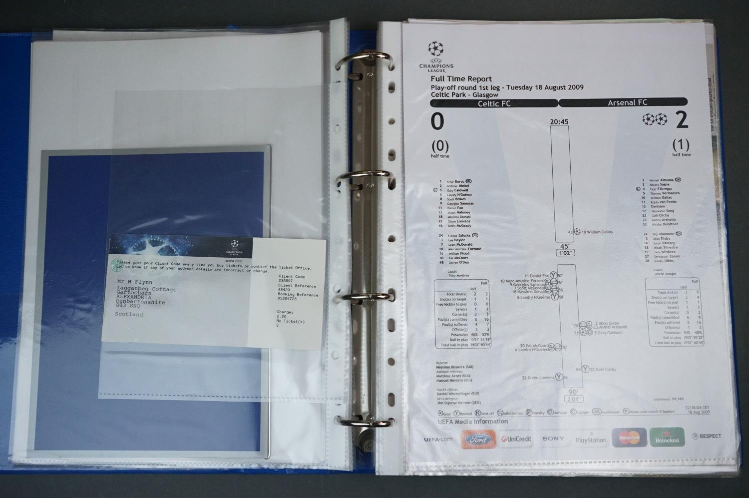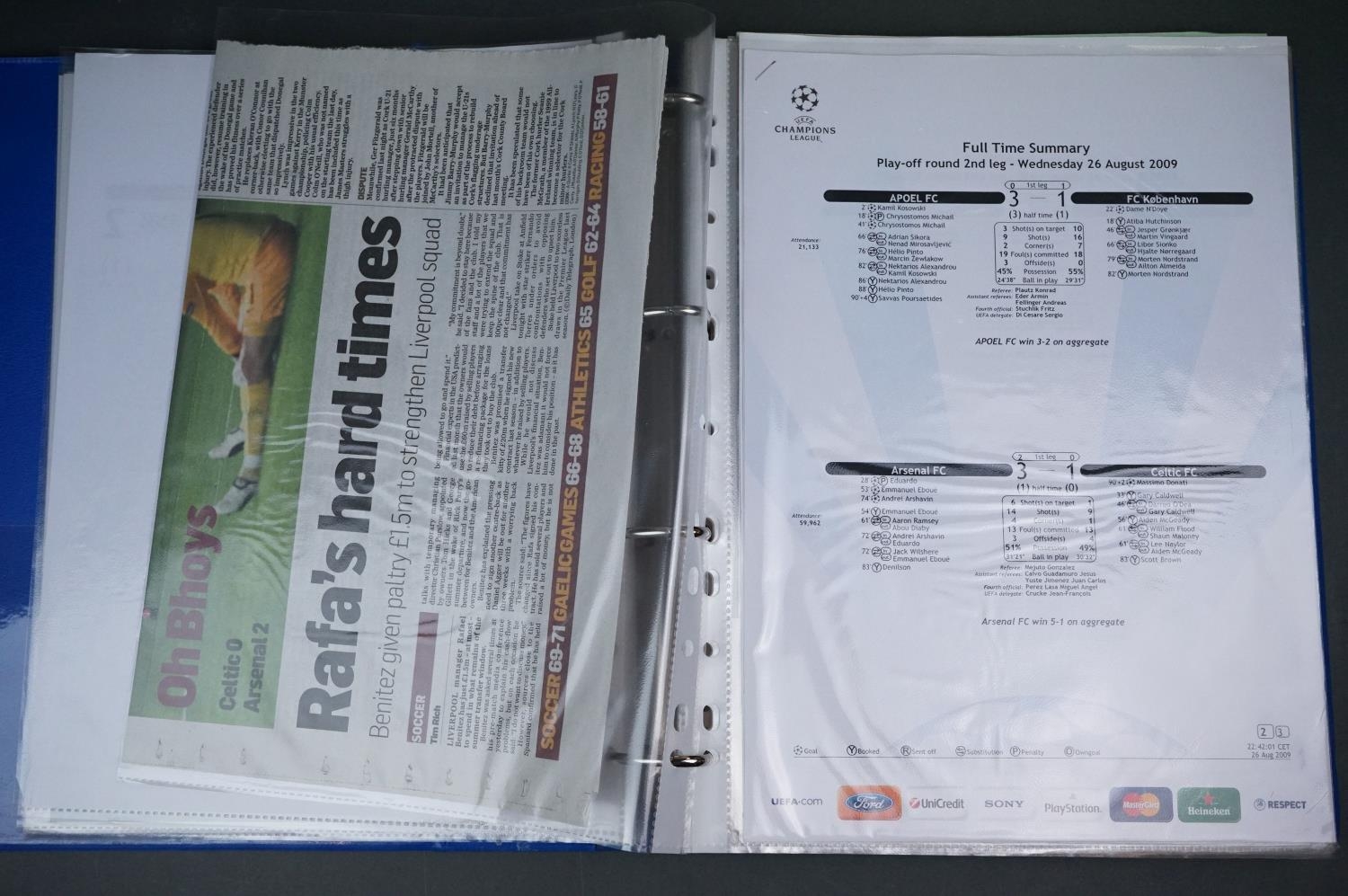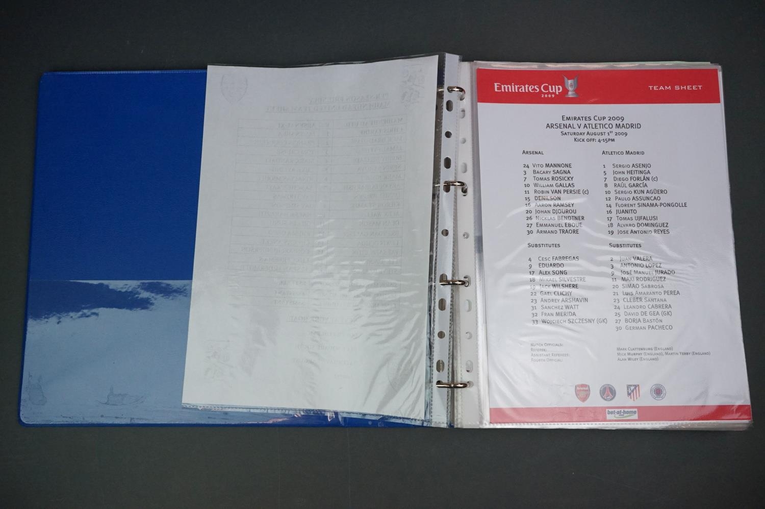 Football - Arsenal fc 2009/10, a binder containing a collection of teamsheets, tickets, menus etc, to include League, Cup, Champions League etc, gen vg (100+ items)