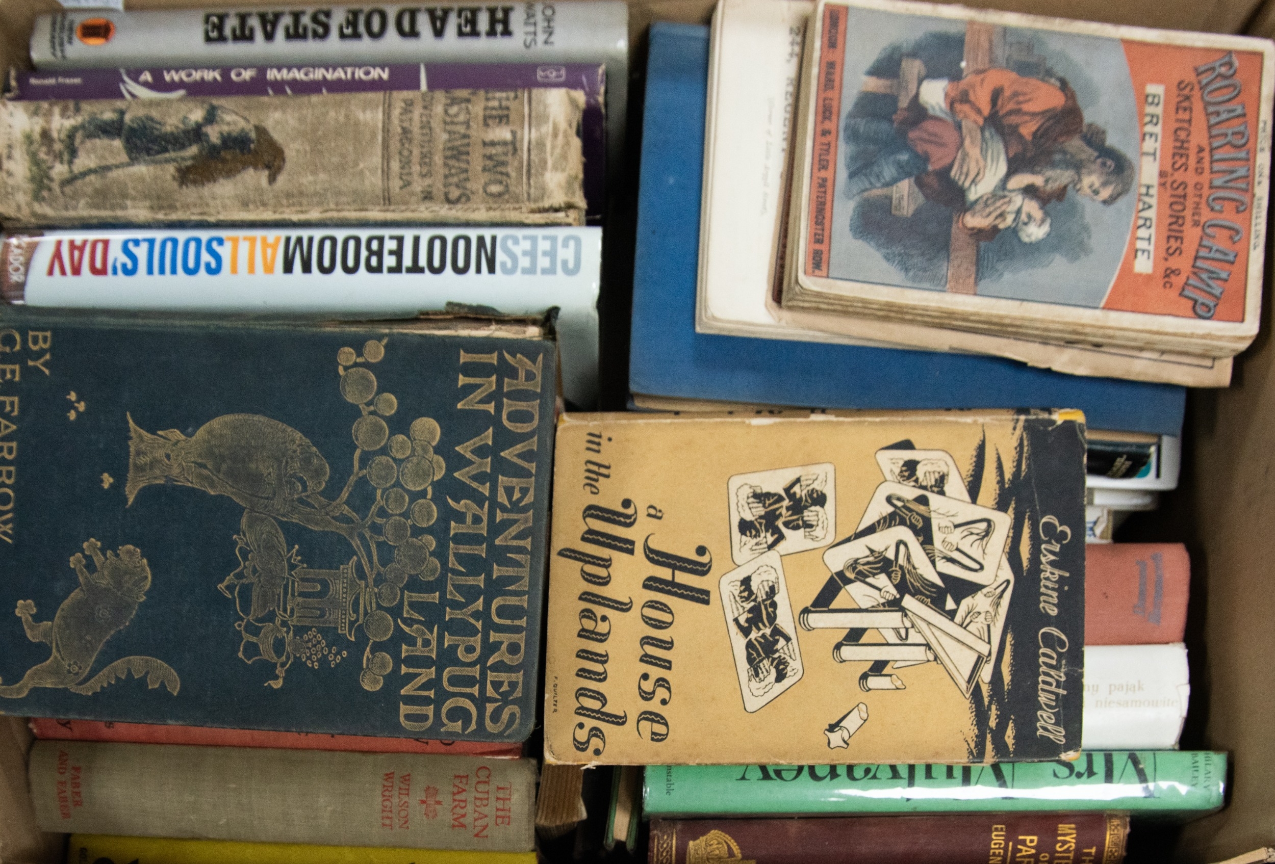Bret Harte - Roaring Camp and other Sketches Stories, pub Ward Lock n.d. pb. Erskine Caldwell - A House in the Uplands, pub Falcon Press, 1947 1st ed, dj. G E Farrow - Adventures in Wallypug Land, pub Methuen, 1898, boards present but loose, poor. Together with a small quantity of MIXED GENRE FICTION, contents of one box