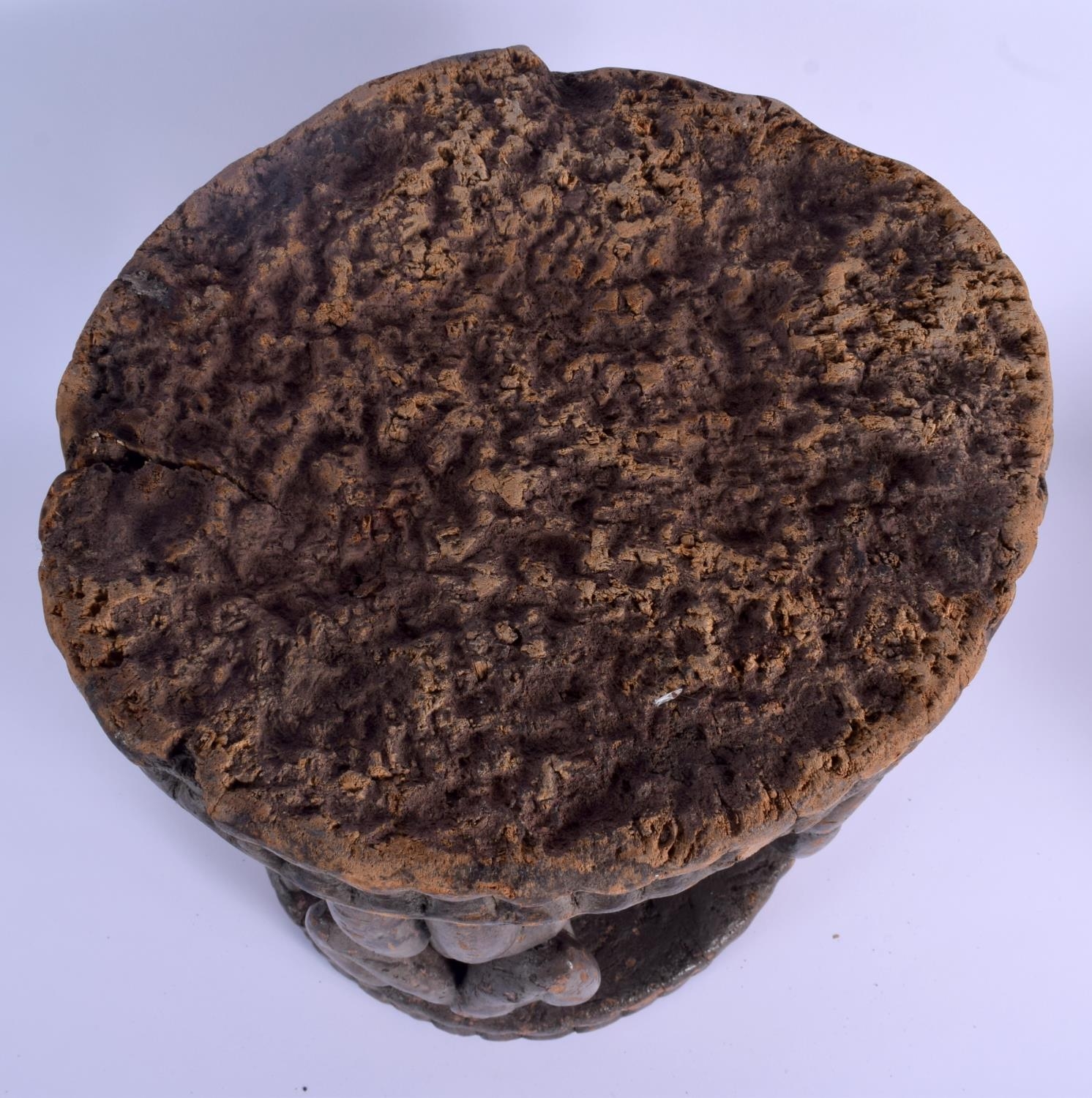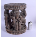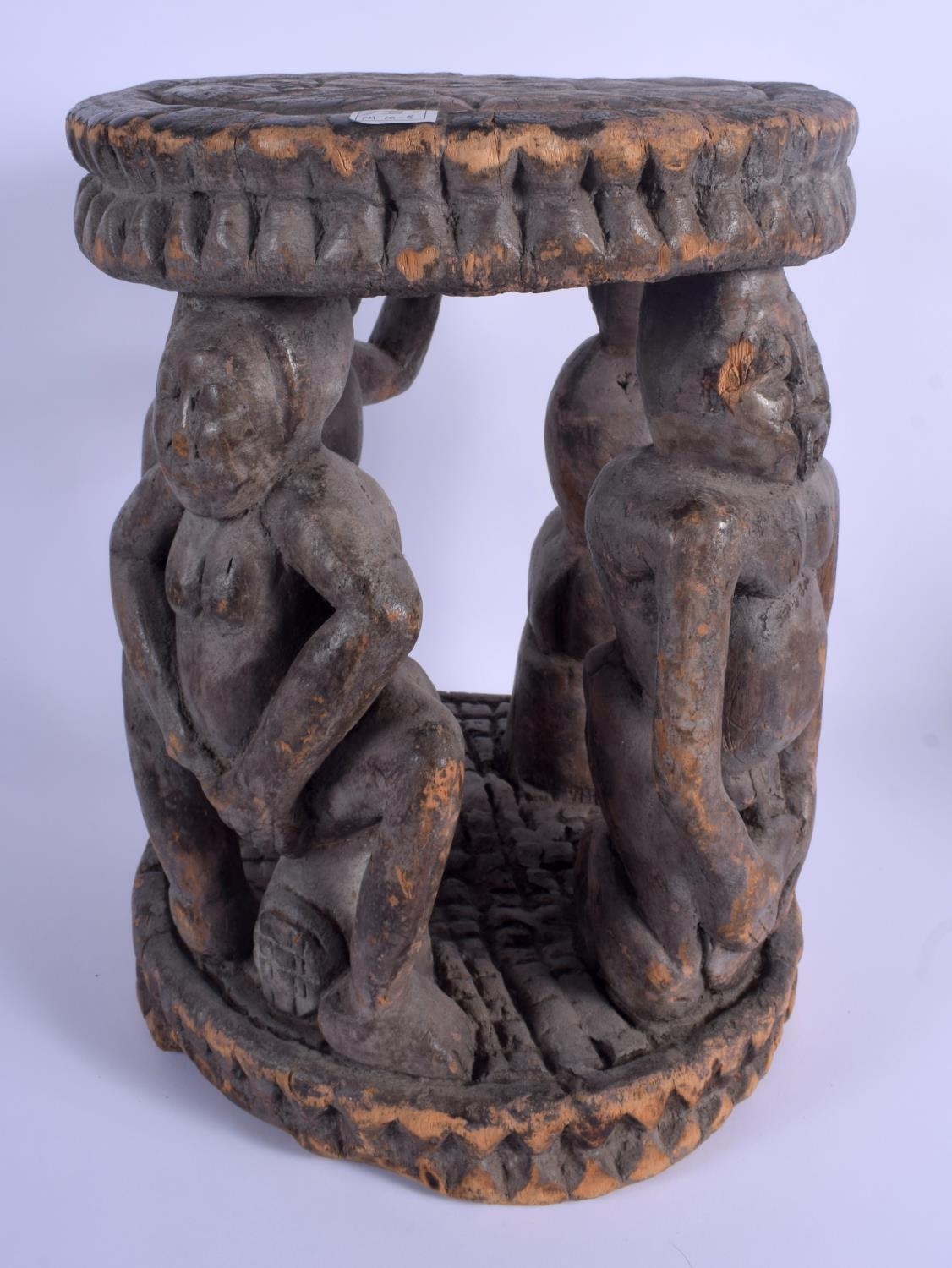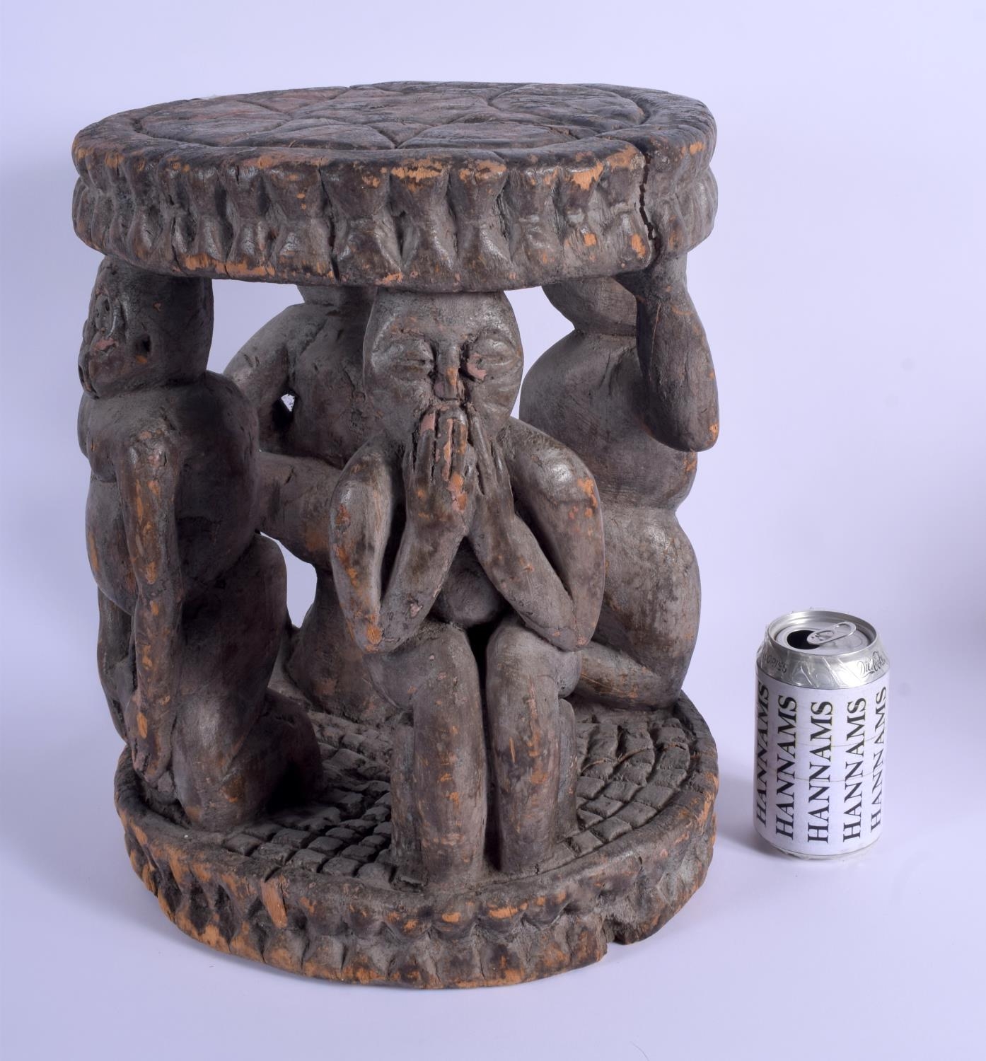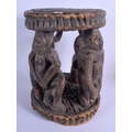 AN EARLY 20TH CENTURY AFRICAN YORUBA TRIBAL STOOL formed with four opposing figures. 38 cm x 26 cm.
