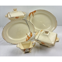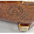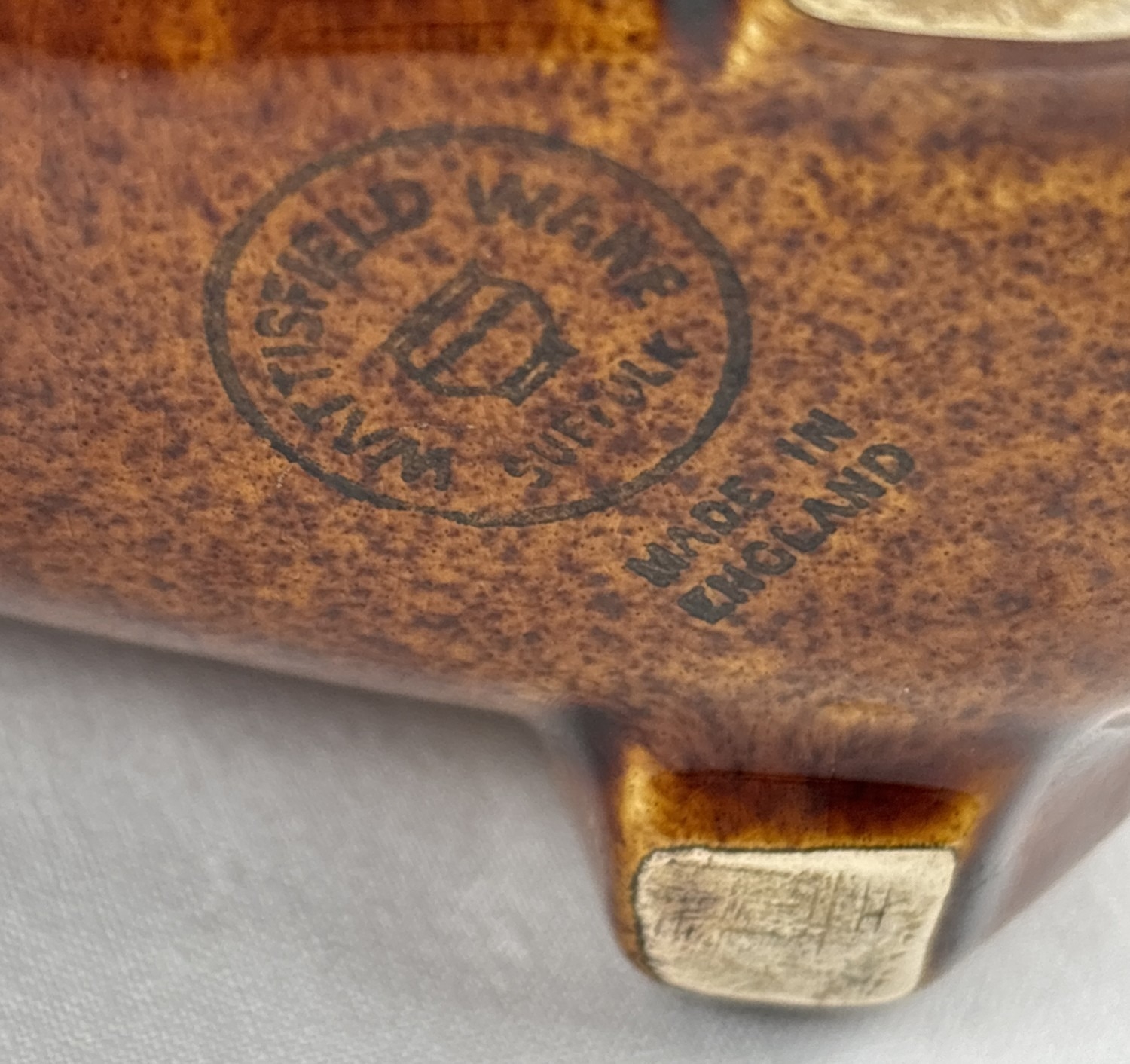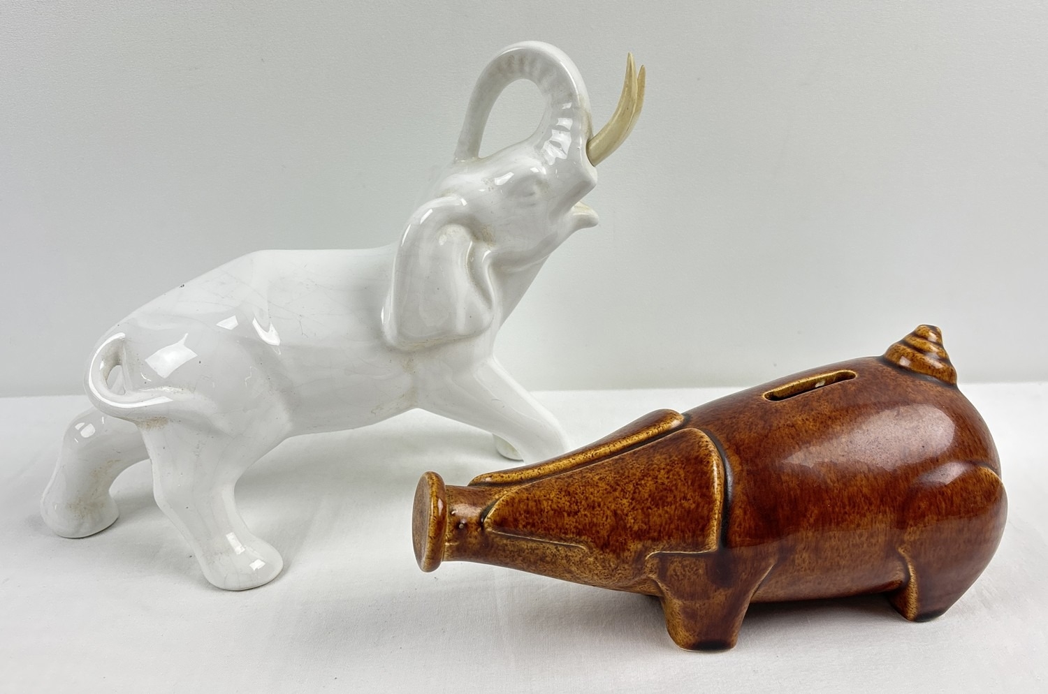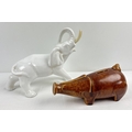 A vintage Wattisfield Ware brown glaze pottery piggy bank together with a Portuguese white ceramic elephant figure. Largest approx. 20.5cm tall.