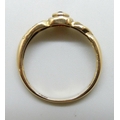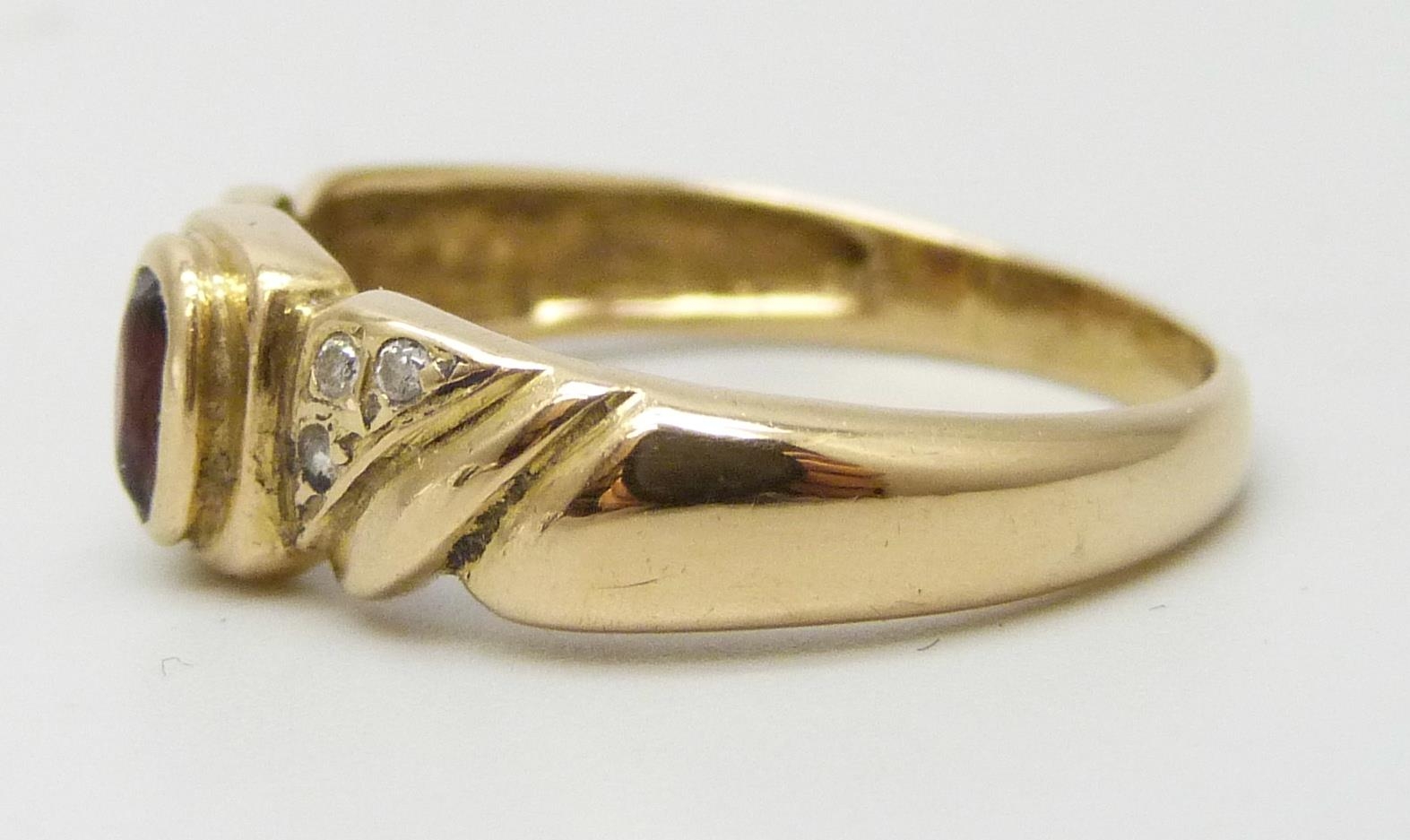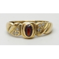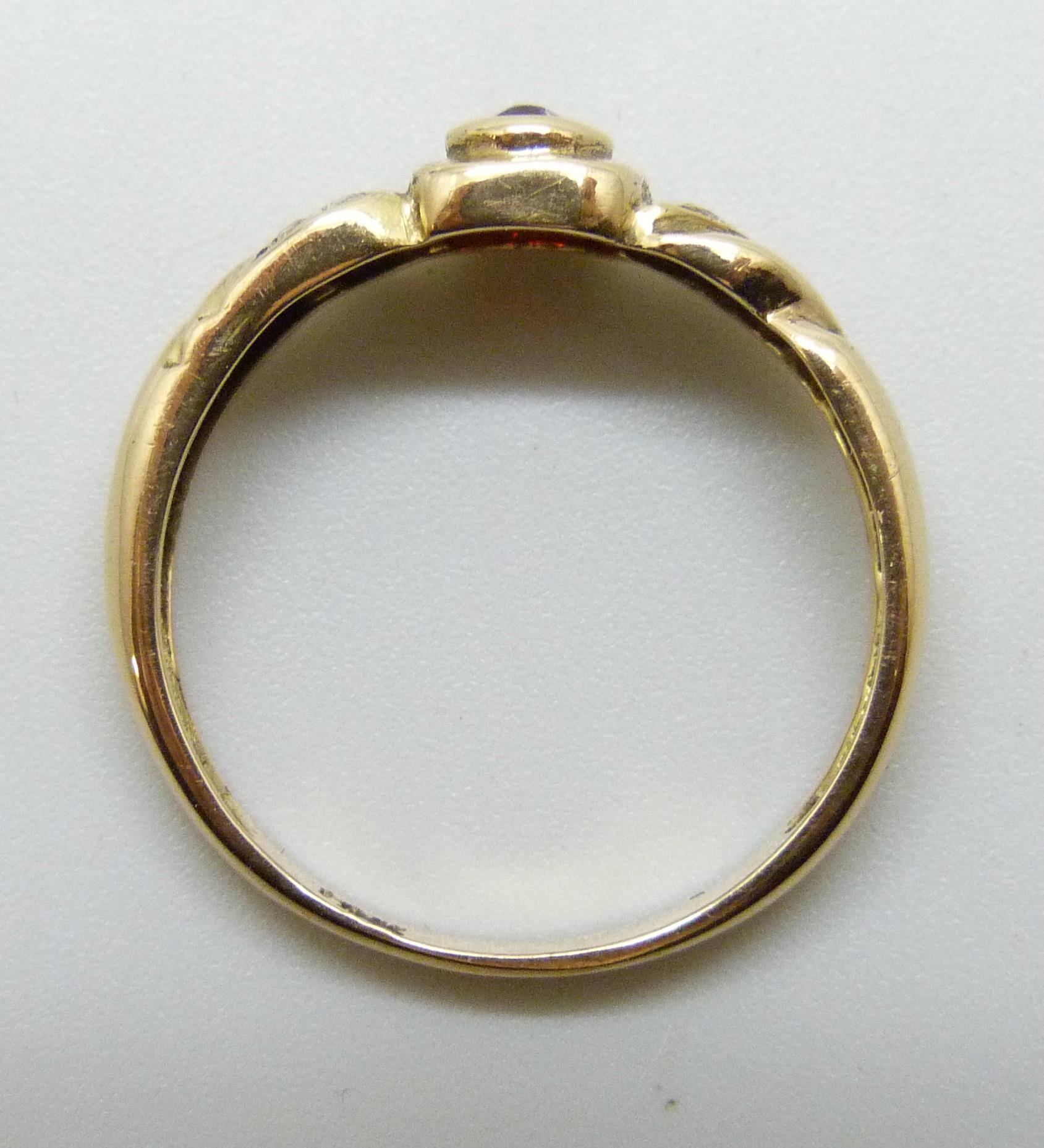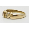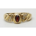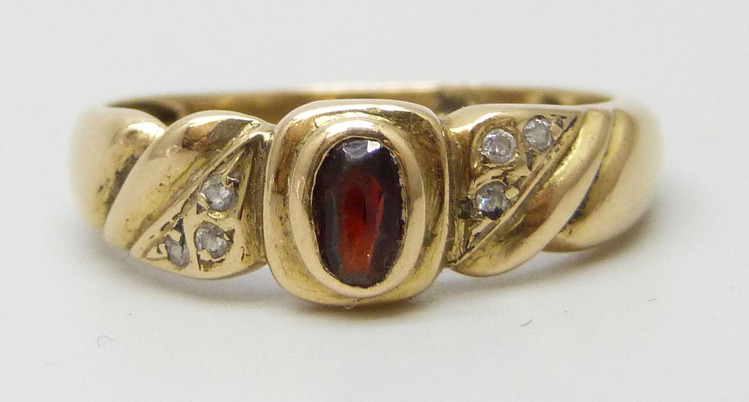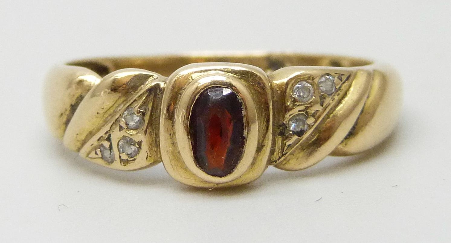 A yellow metal, garnet and white stone ring with control marks to outer shank, 3.1g, Q