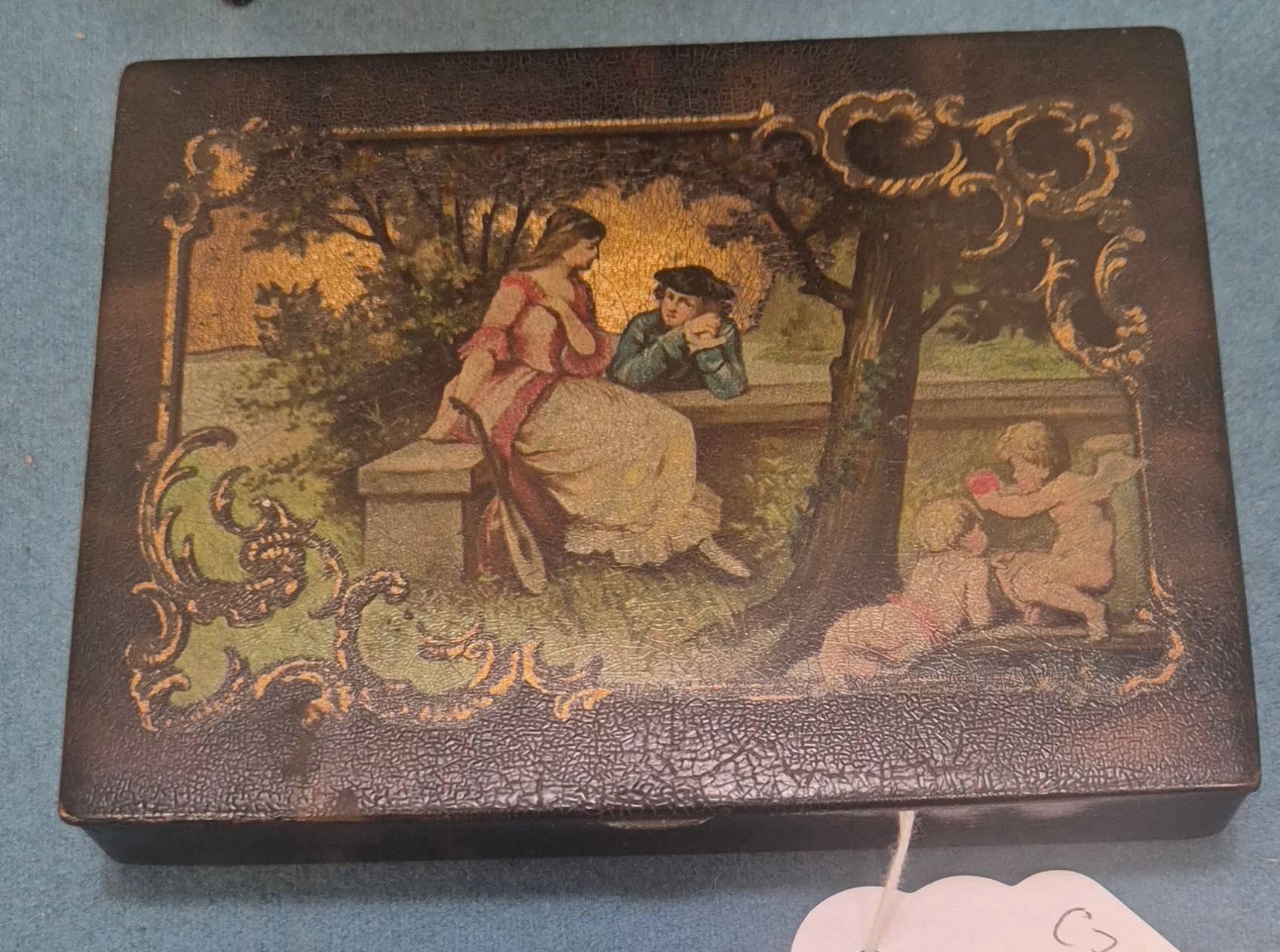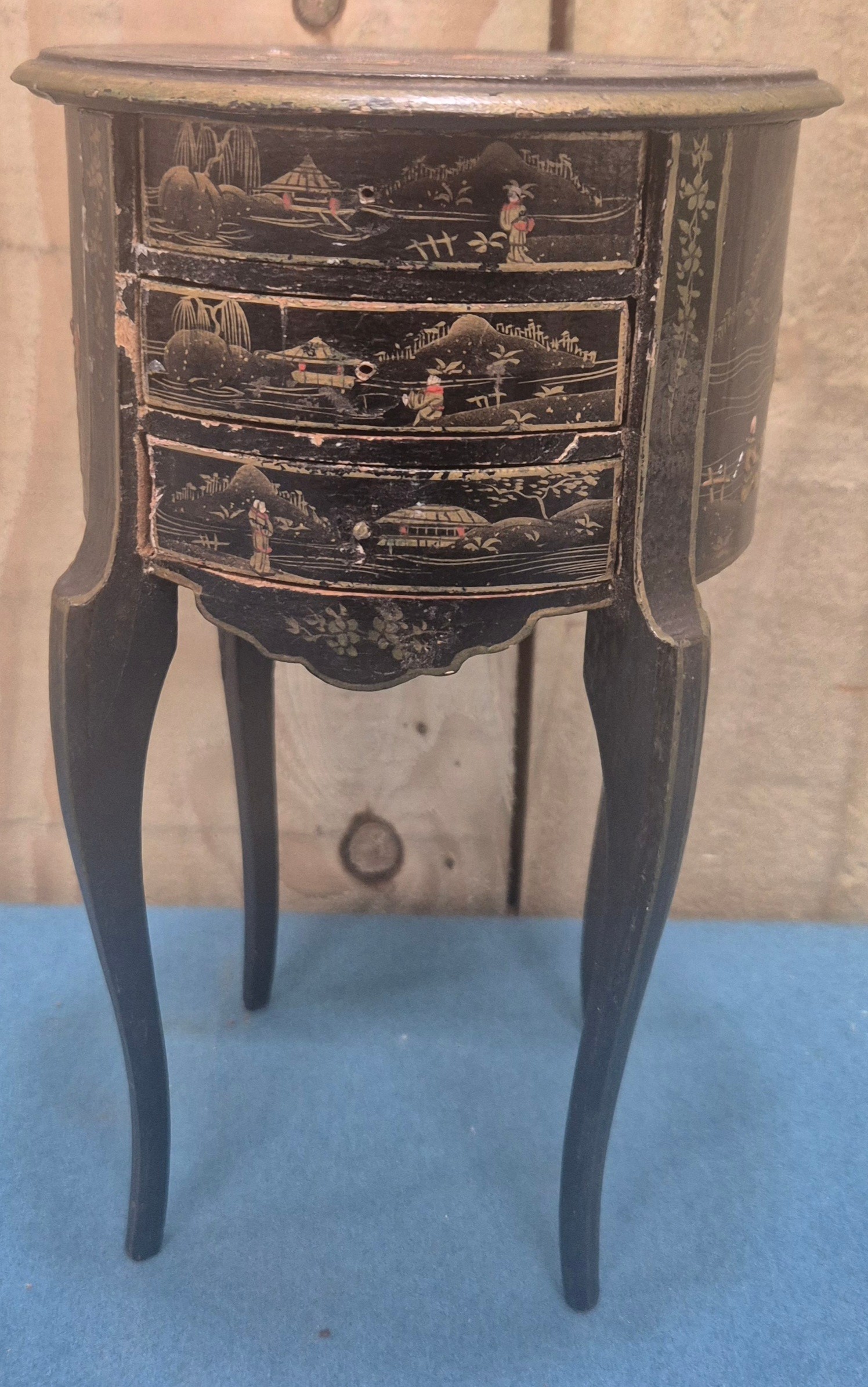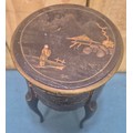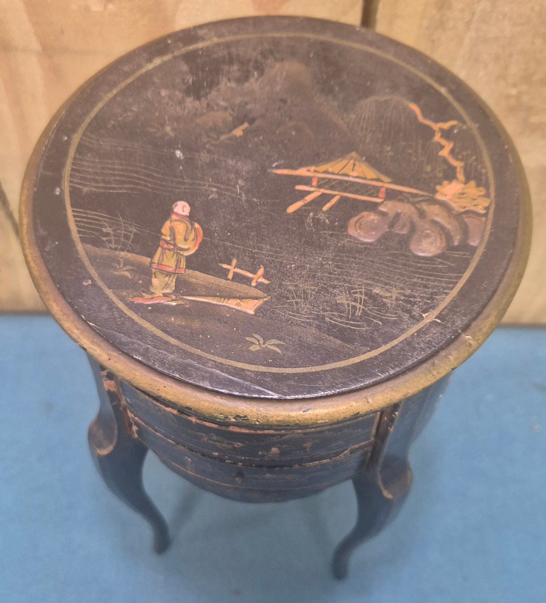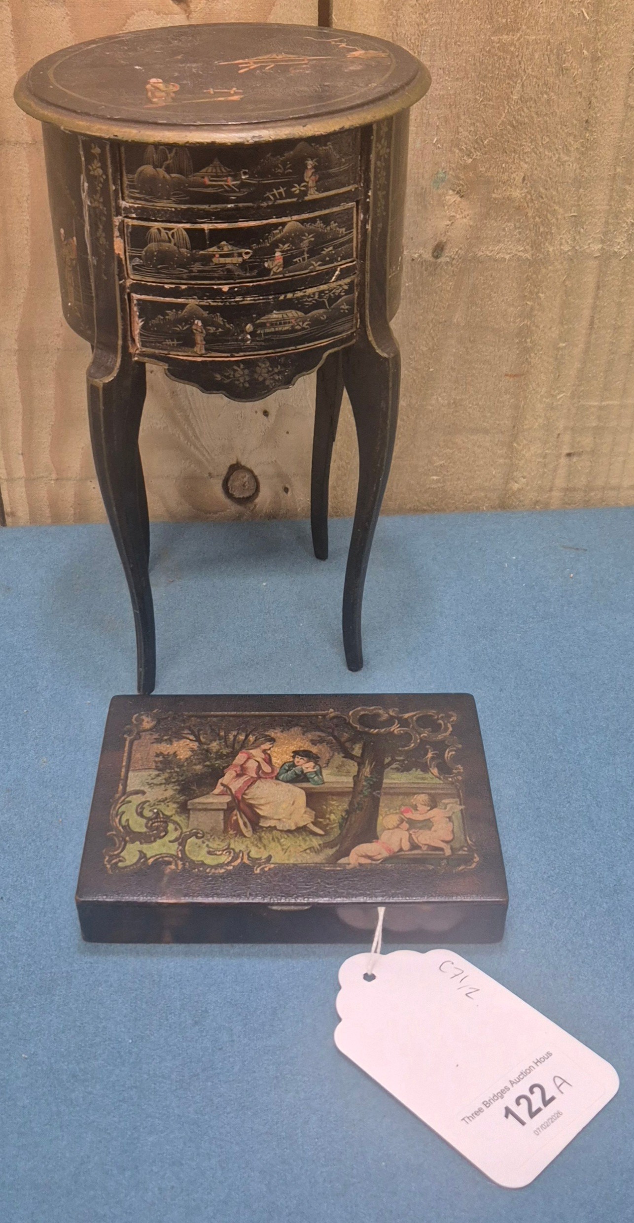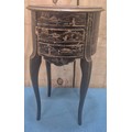 Regency Paper Mache trinket box together with an oriental miniature side table with three drawers fitted.