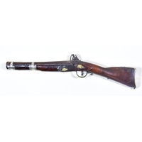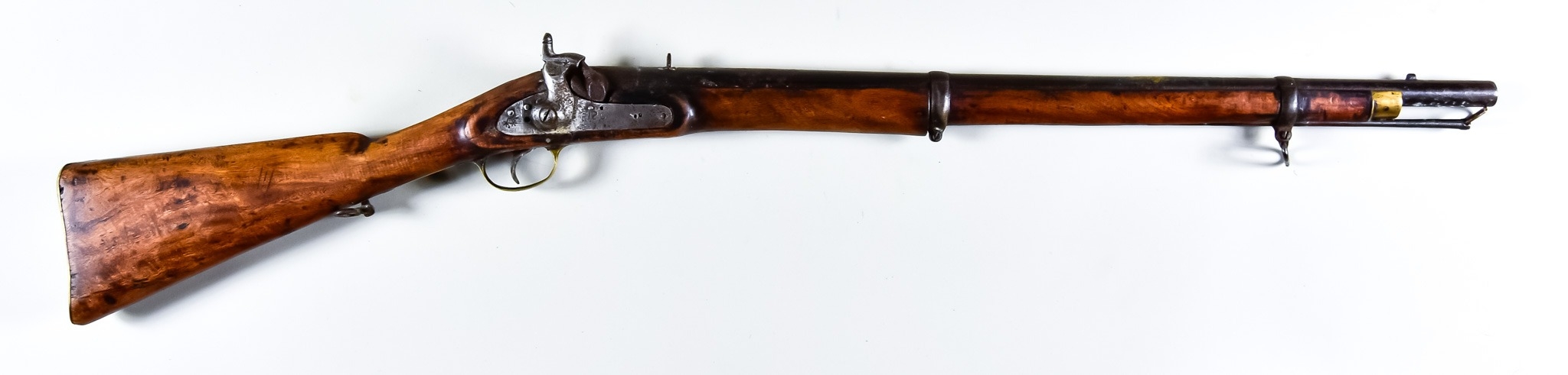 A Late 19th Century .70 Calibre Indian Percussion Musket, 28ins patinated barrel fitted with V and leaf sights, and marked "Jaipur Armoury", plain steel lock stamped "12 C" and three stars, hardwood stock and fore end, brass butt plate and trigger guard, 43ins overall