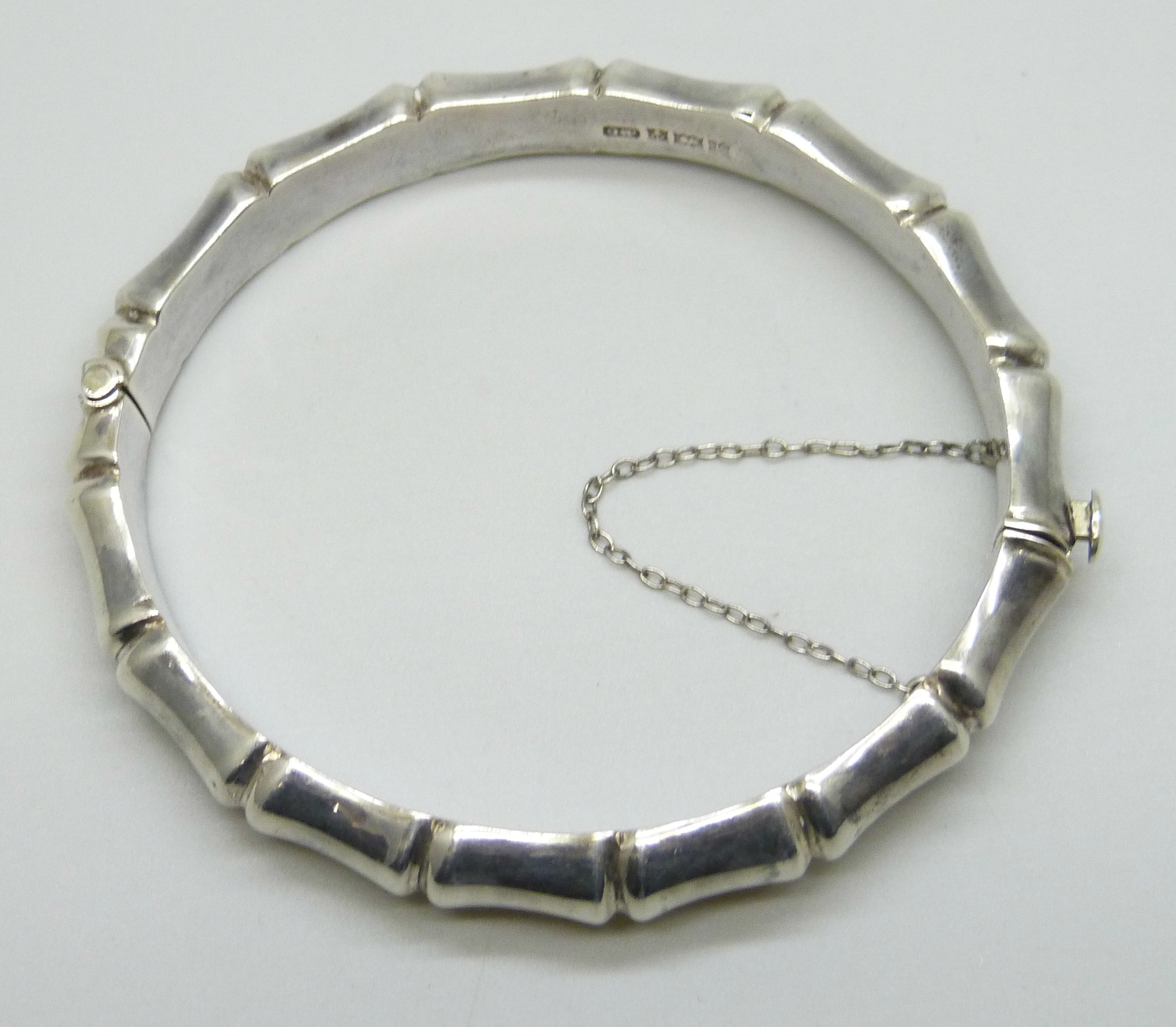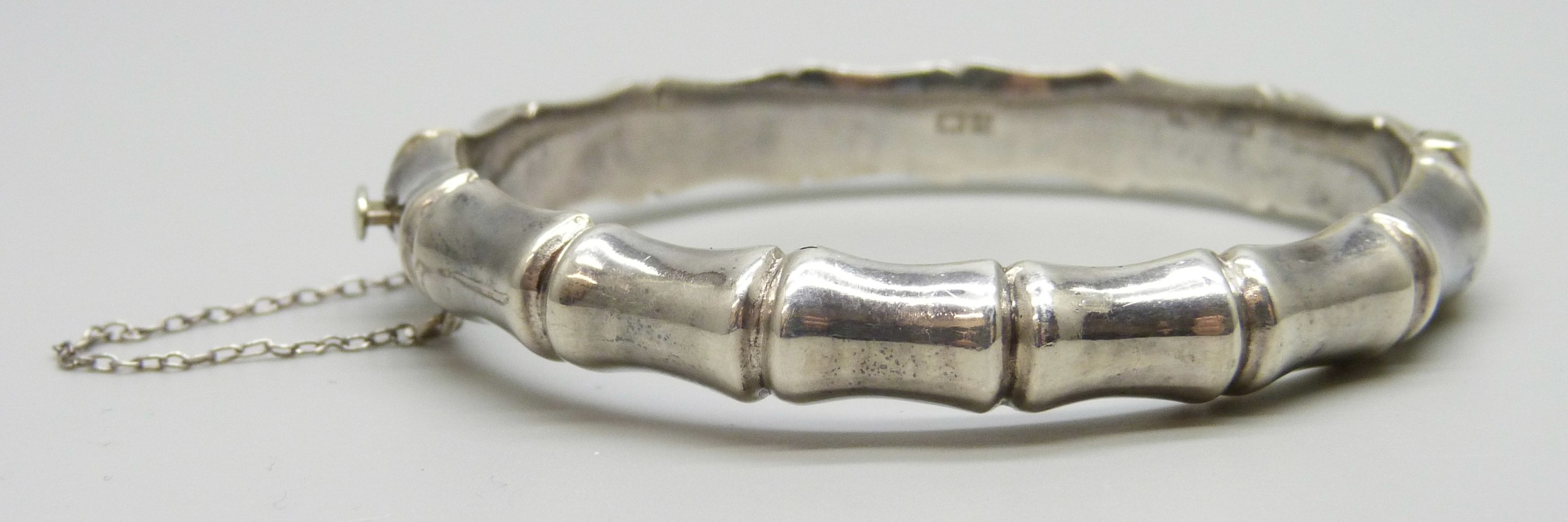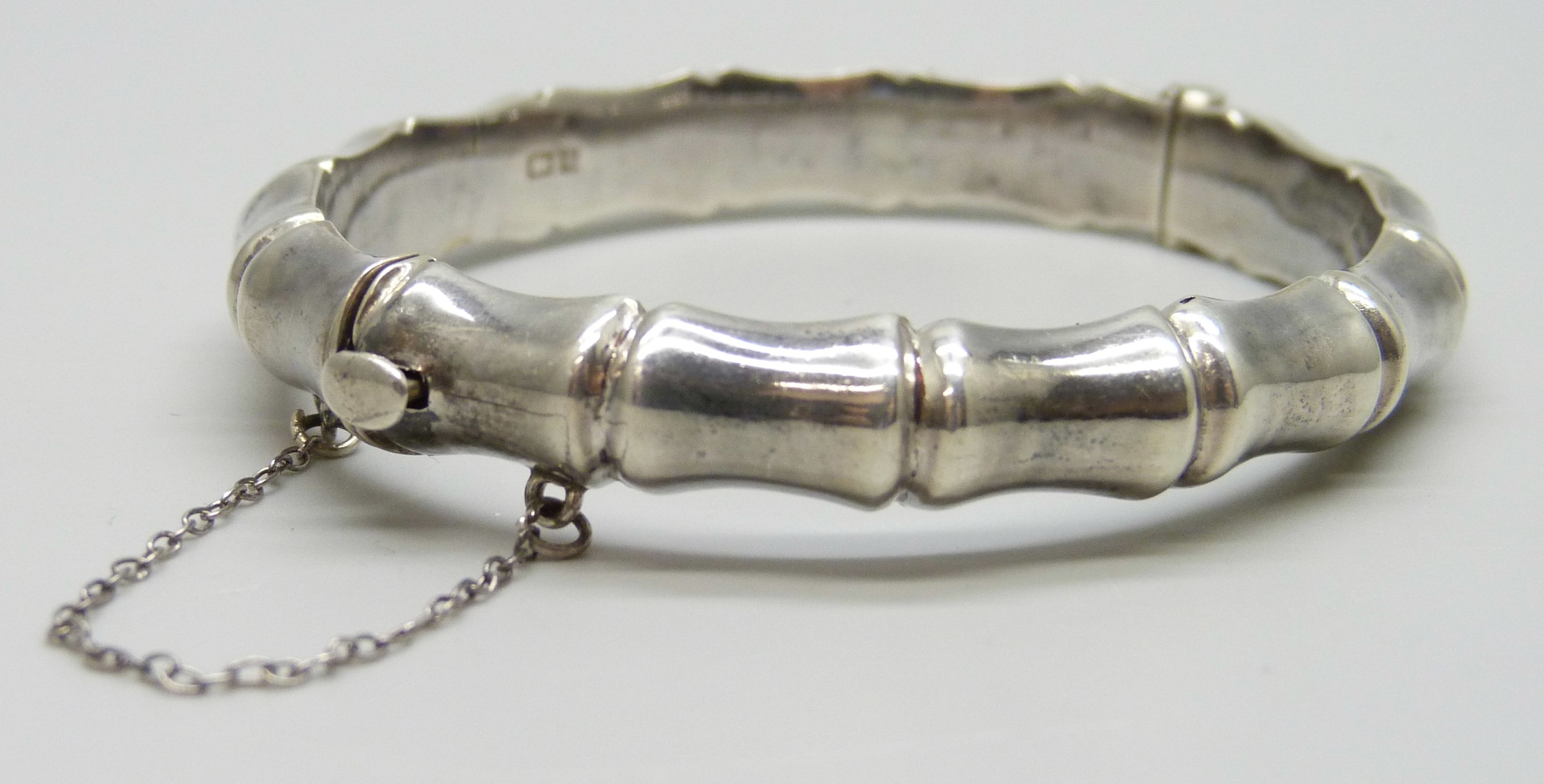 A silver bamboo design bangle, hallmarked, 13.9g, 5.9 x 5.2cm