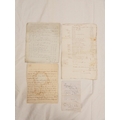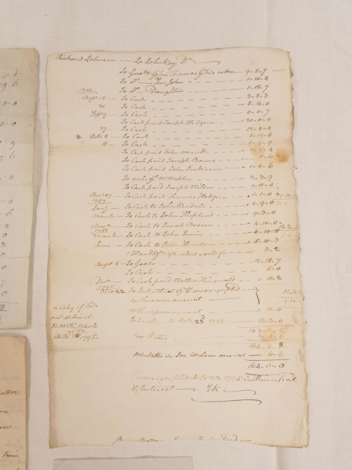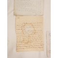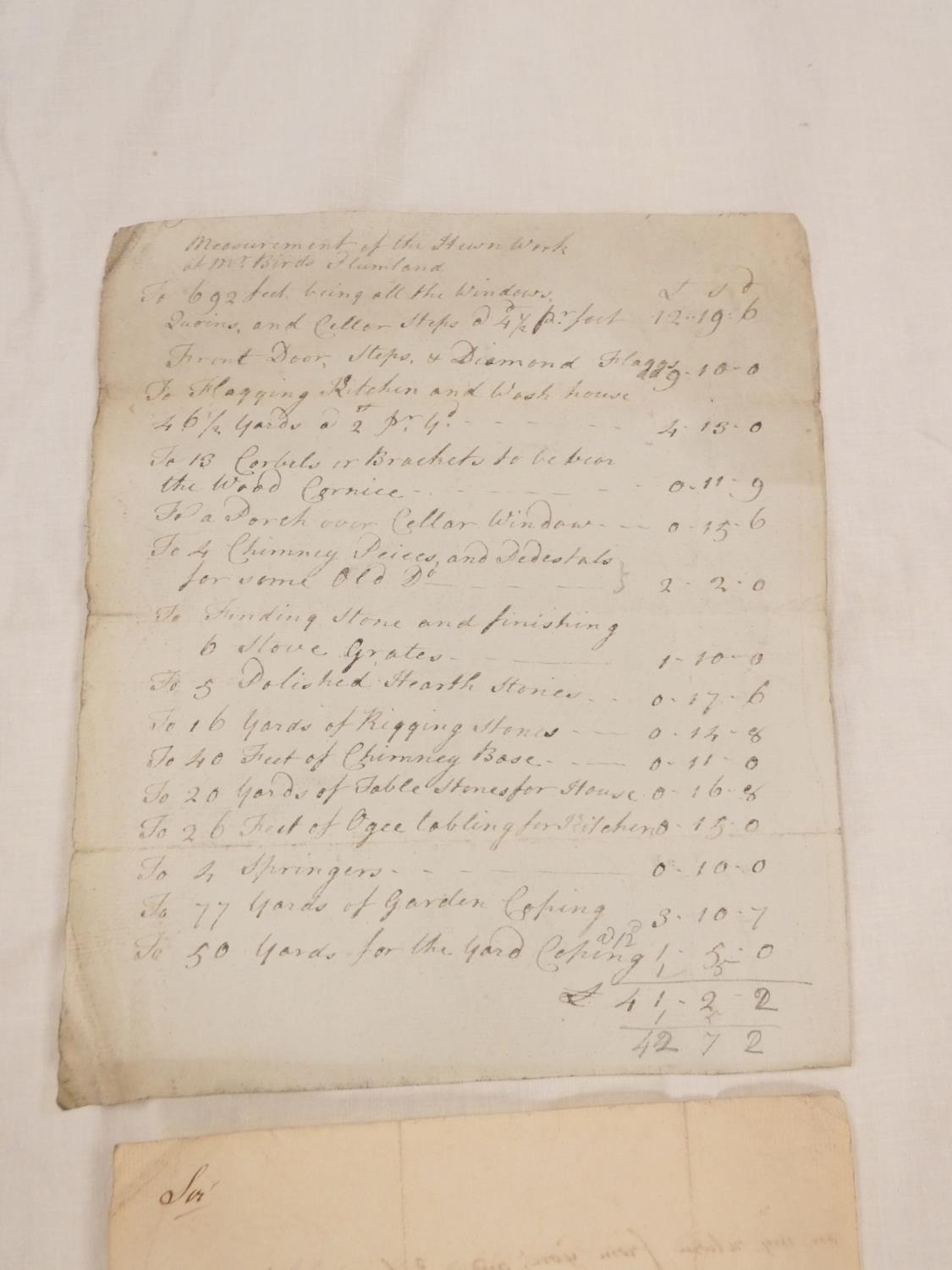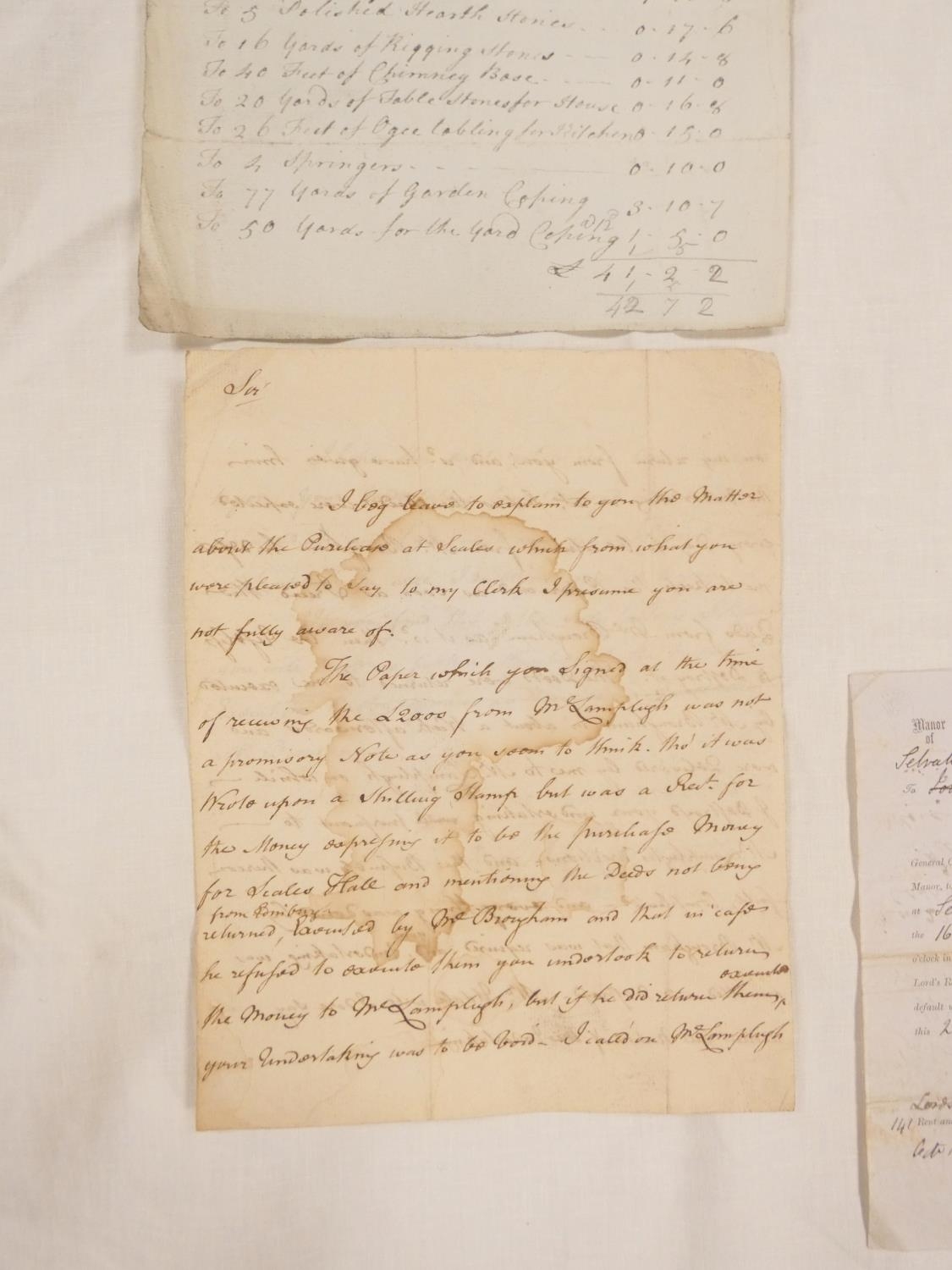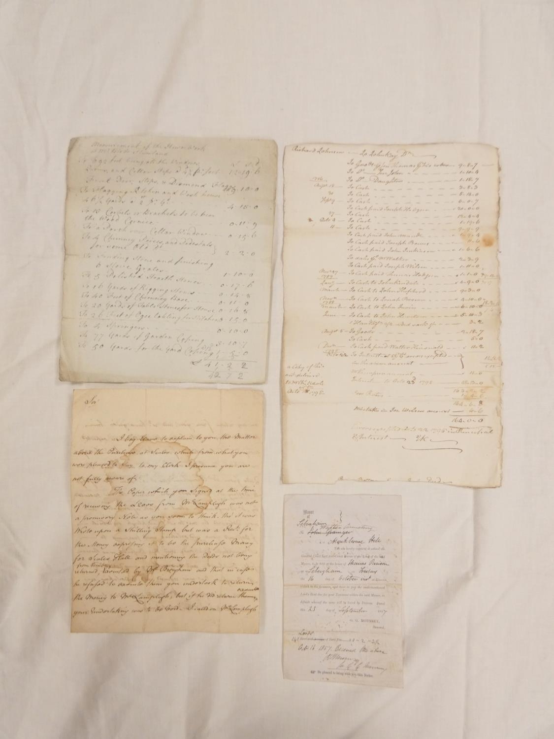 Plumbland, Cumberland. Single manuscript leaf, Measurements of the Hewn Work at Mr. Birds with prices & account of stone & door & window surrounds used in the construction. Late 18th/early 19th cent.; also Walter Armstrong, Monkhouse Hill, Sebergham Estate, demand for rent, 1857, & a detailed folio leaf of accounts, Richard Johnson to John Kay, estate unknown but may refer to Ewanrigg as a copy of this account was delivered to Mr. Charles Udale, 1795, & manuscript letter from Tho. Benson (to Mr. Christian) re. the aborted purchase of Scales Hall involving a Mr. Lamplugh & Mr Brougham, 1787. (4).