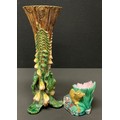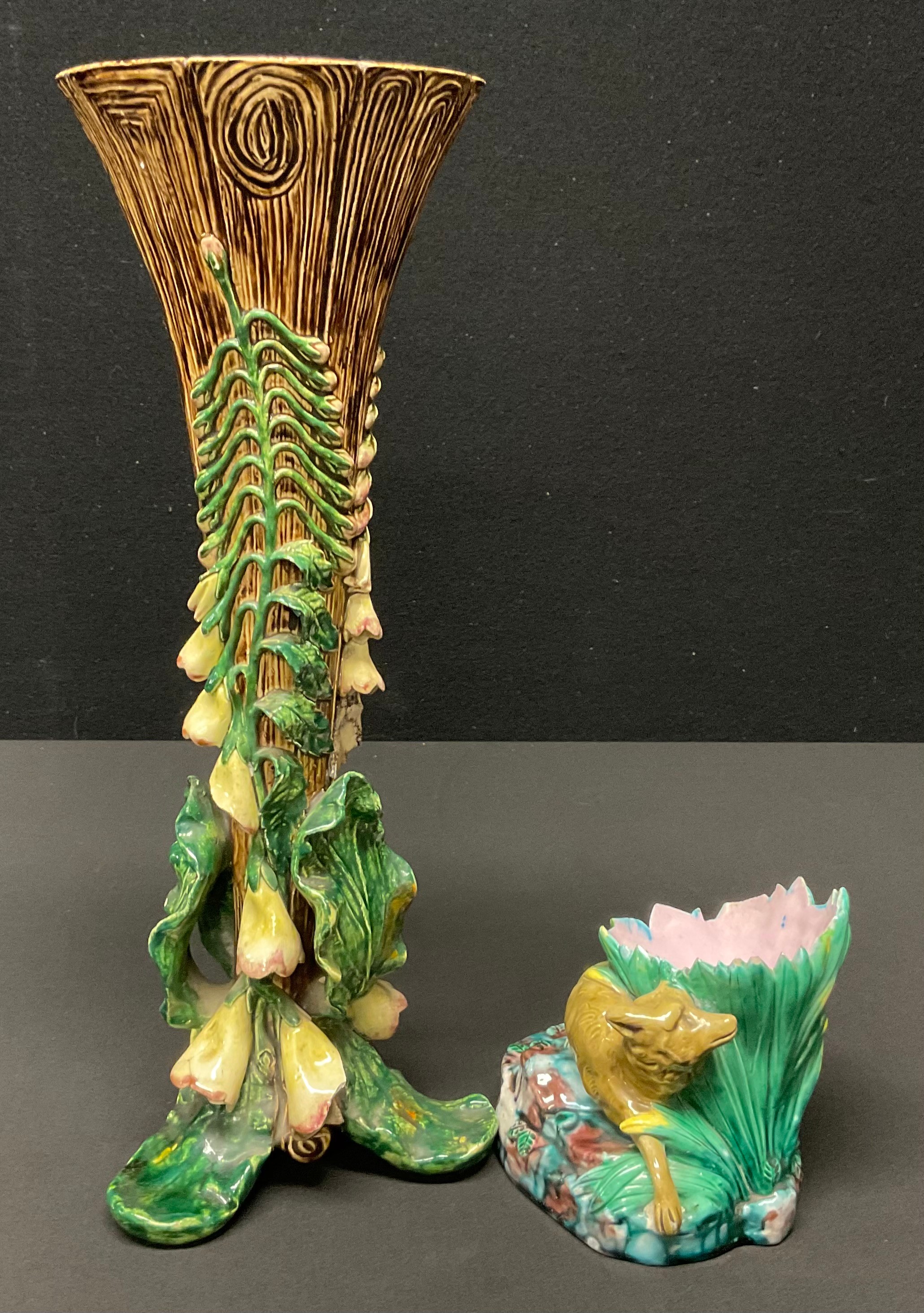 A Menton Majolica Foxglove pattern vase, mark to base, 32.5cm high; another, a Worcester Majolica figural bowl as a fox hiding in foliage, 10cm high (2)