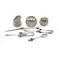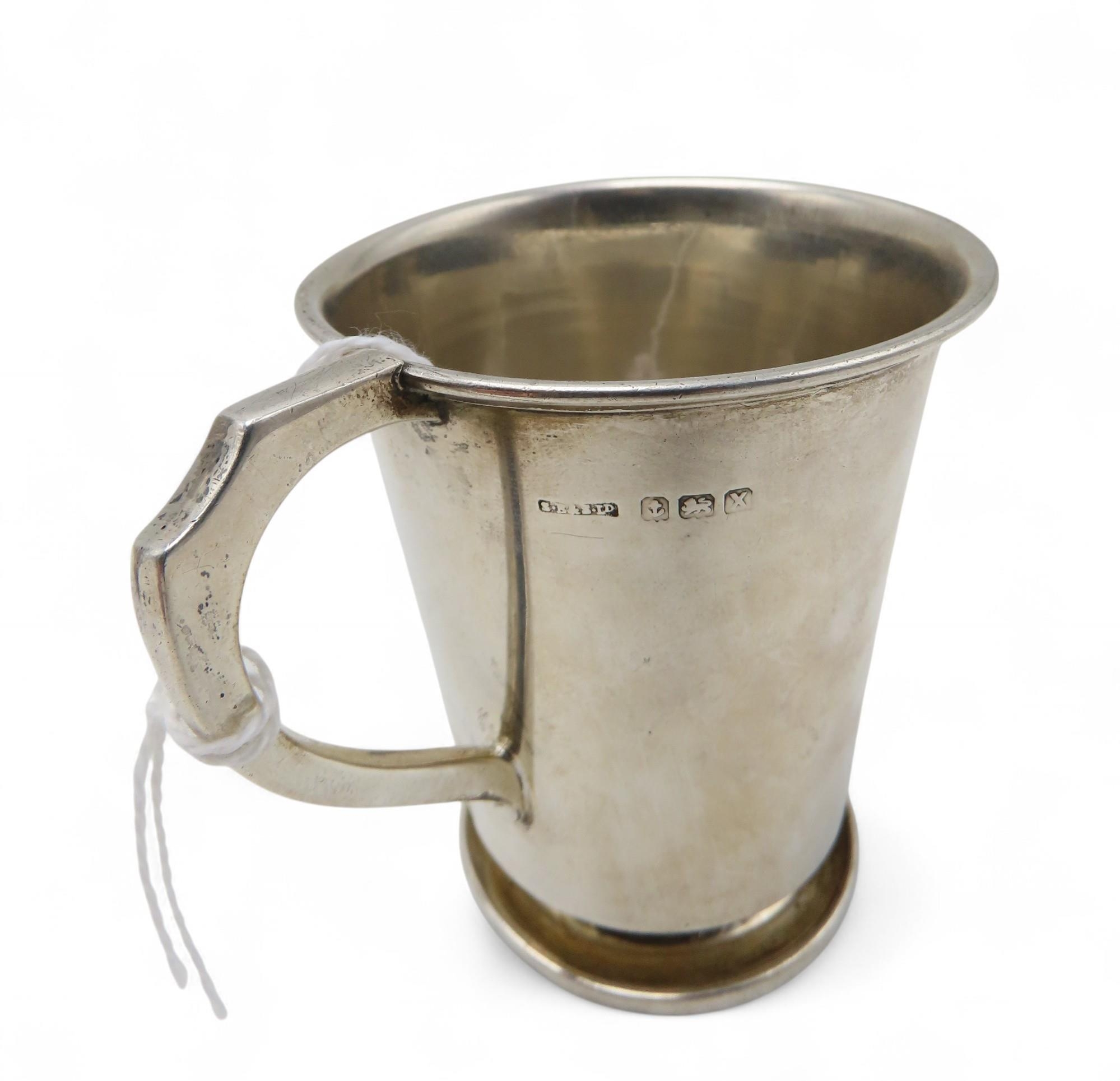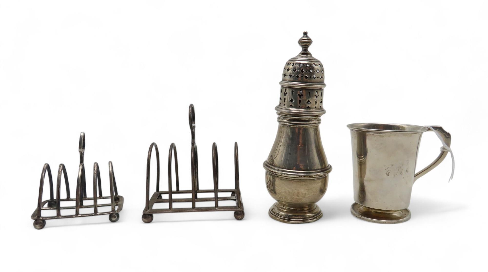 A silver christening mug, by S. Blanckensee & Sons, Birmingham 1947, a silver caster by Elkington & Co, Birmingham 1925, a four division silver toast rack, by William Hutton & Sons, Sheffield, another smaller by Goldsmiths & Silversmiths Co, 310gms (4)