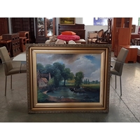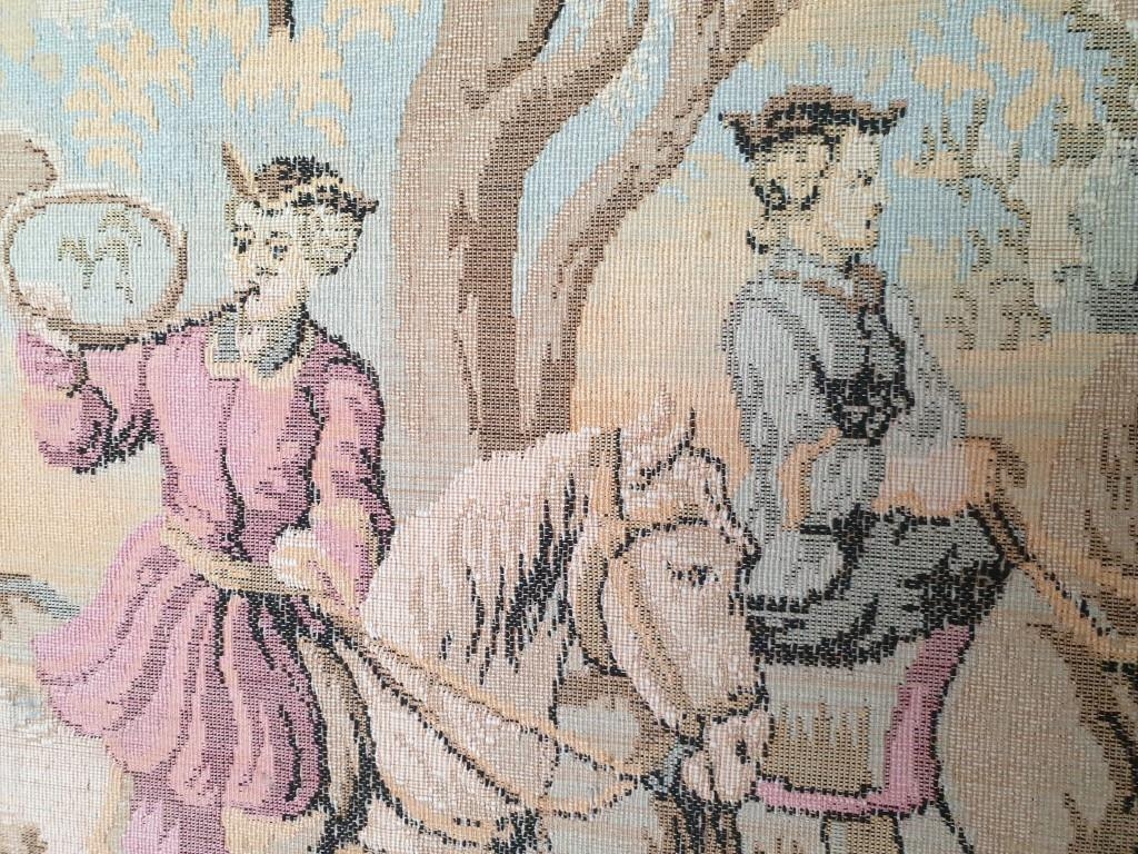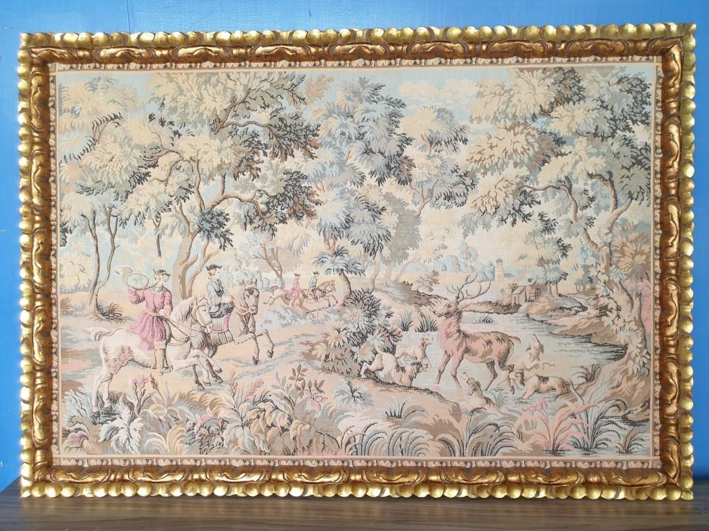 Huge Framed Embroidery of Victorian Style Hunting Scene in Gold Colour Carved Wooden Frame (Overall 168cm x 117cm)