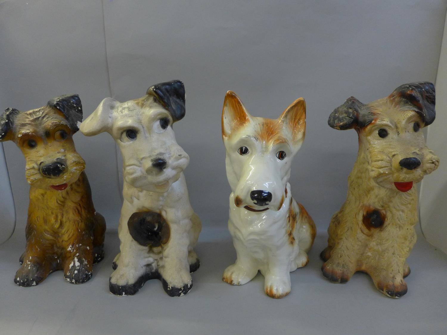 A large Sylvac dog, ear a/f and three other Sylvac style terriers