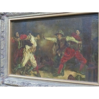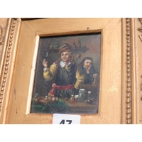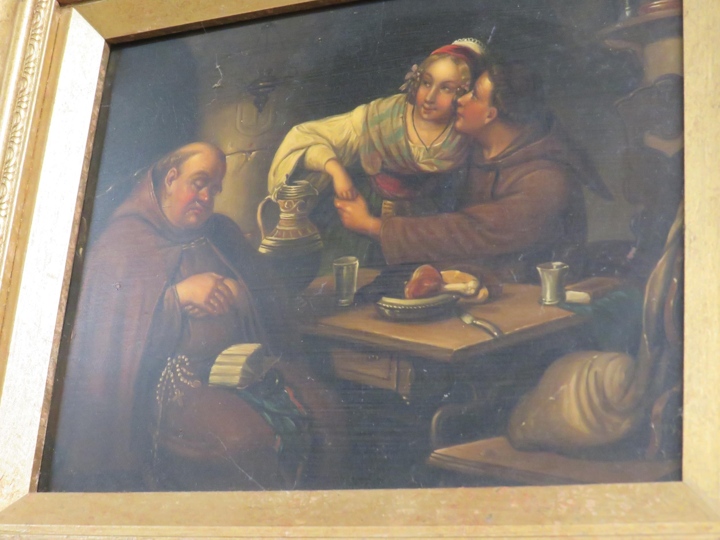 Oil on tin couple & a monk in pub interior,old label to reverse 6" x 8"