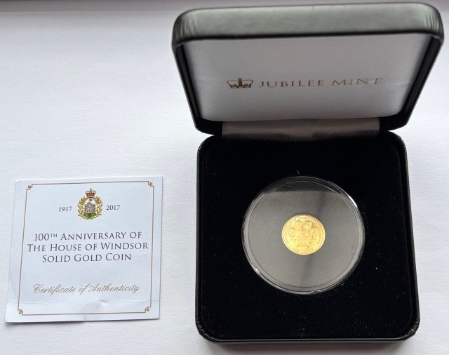 2017 9-carat Gold Proof One Crown Coin, 100th Anniversary of the House of Windsor, Diameter 16mm, Weight 1g, COA, Presentation box