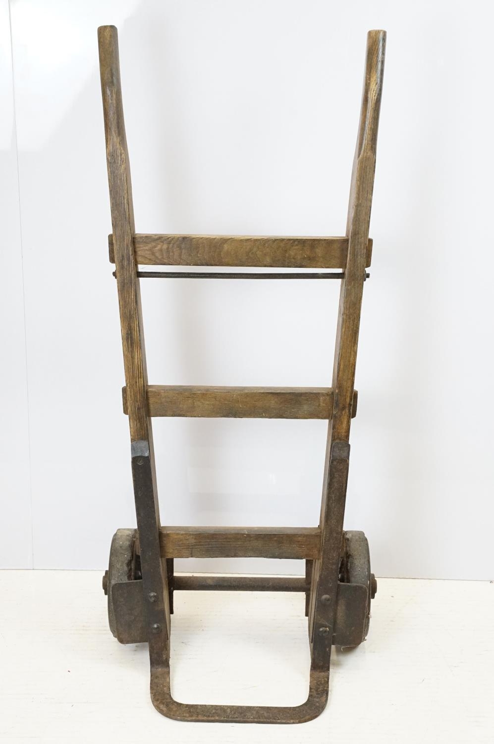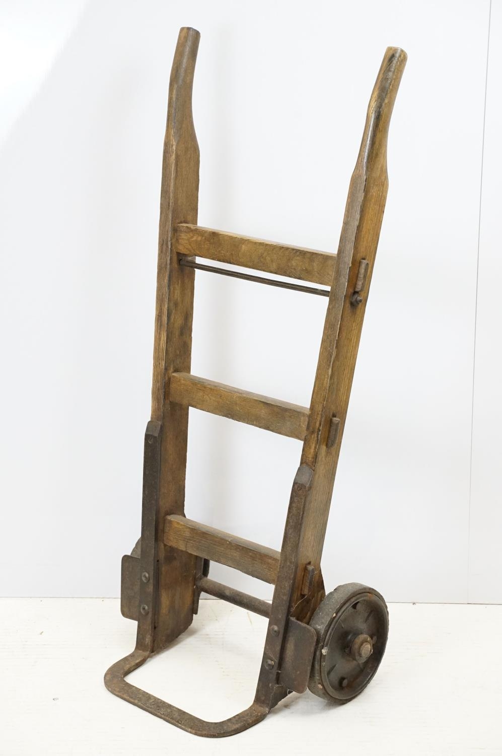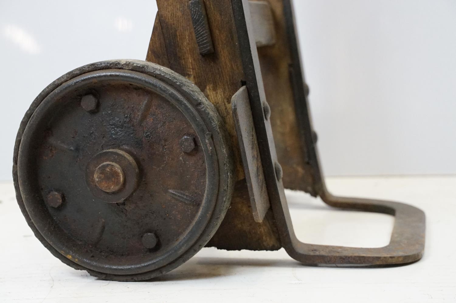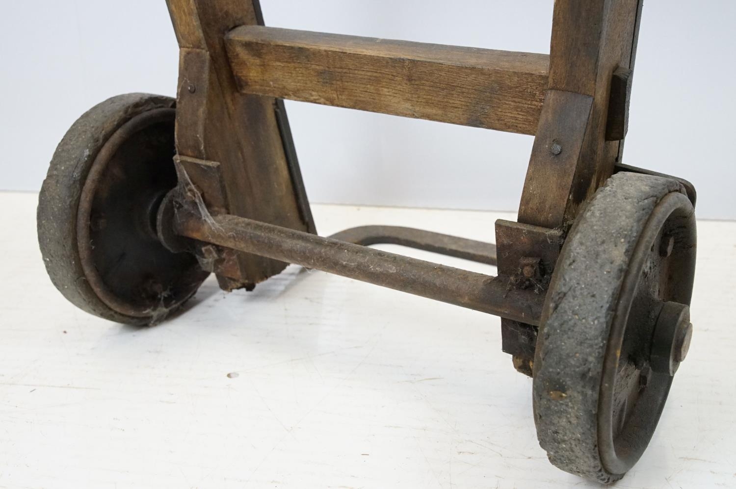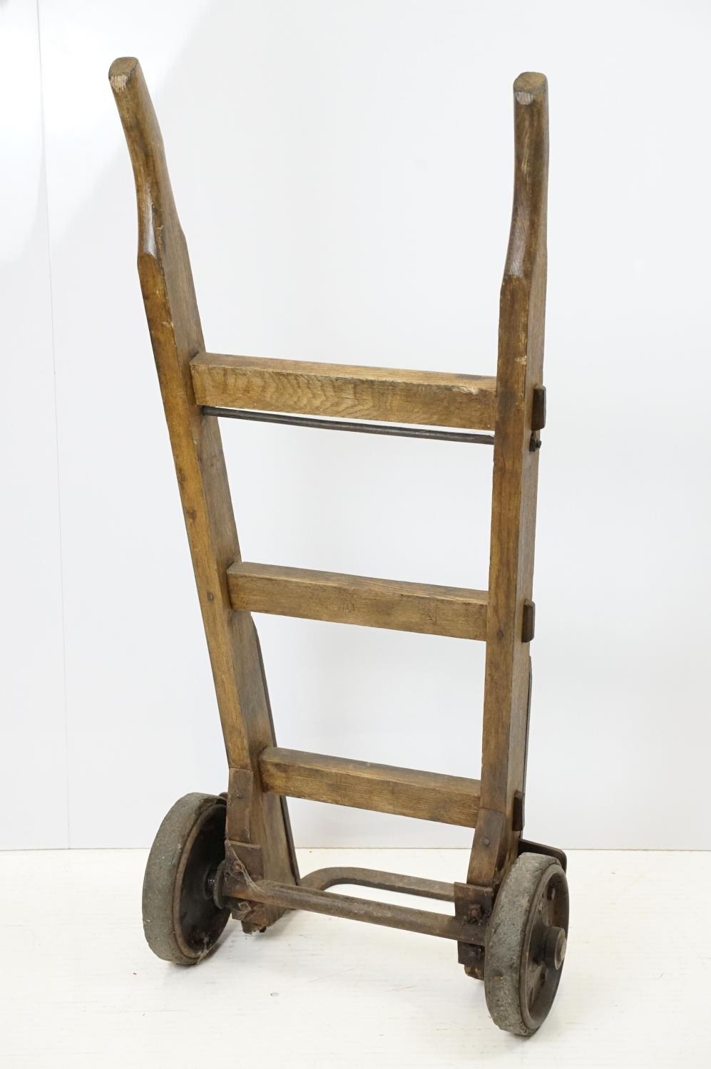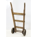 Vintage sack trolley, pine with iron mounts, 105.5cm high