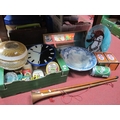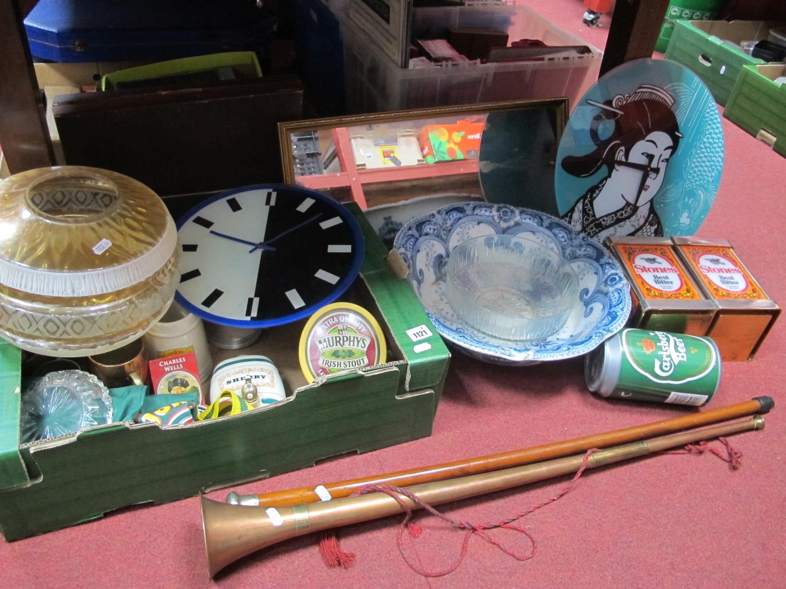 Wall Clocks, Breweryanna, etc:- One Box. Early XX Century silver topped cane, copper coaching horn, mirror, bowl, lamp shade.