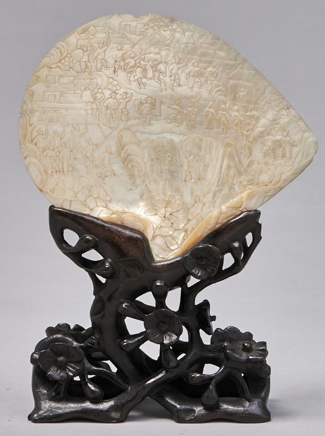 A Chinese export mother of pearl shell carving, 19th c, with a procession winding through a landscape, 26cm h overall and a wood stand (2)