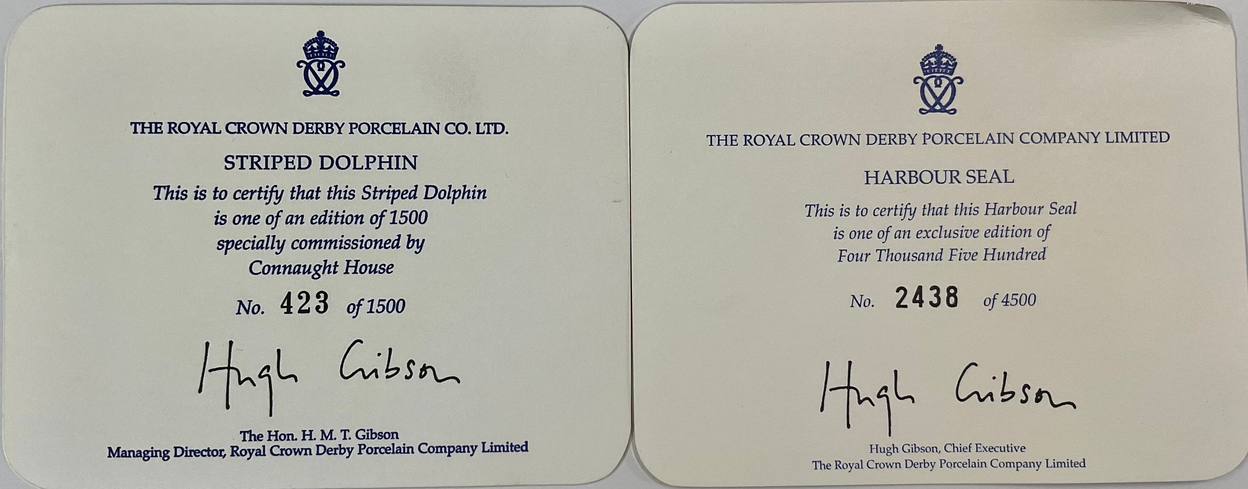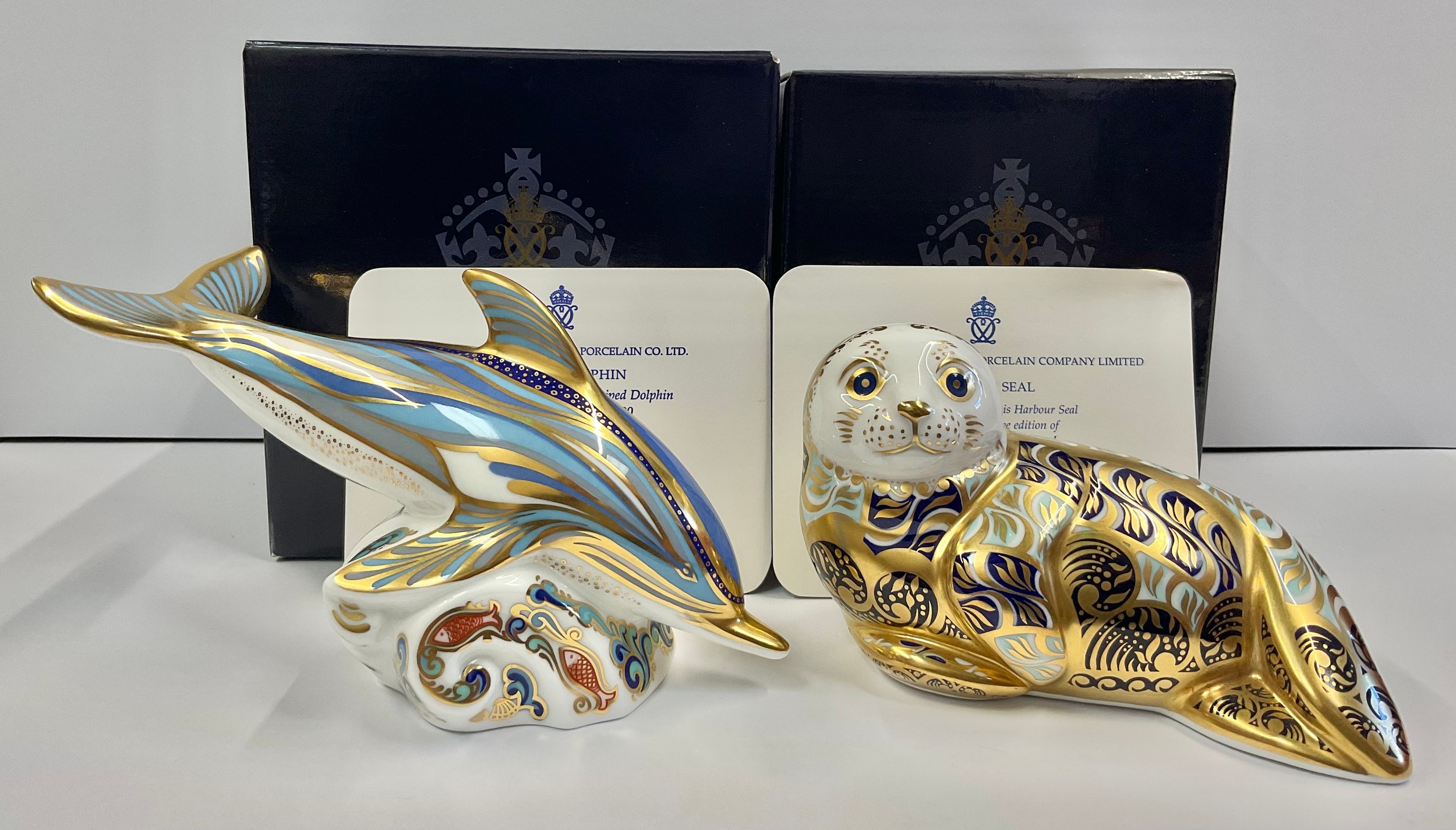 A Royal Crown Derby paperweight, Striped Dolphin, specially commissioned by Connaught House, limited edition 423/1,500, gold stopper, 15cm long, printed mark in red, certificate, boxed; another, Harbour Seal, exclusive limited edition 2,438/4,500, gold stopper, 13cm long, printed mark, certificate, boxed (2)