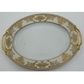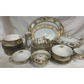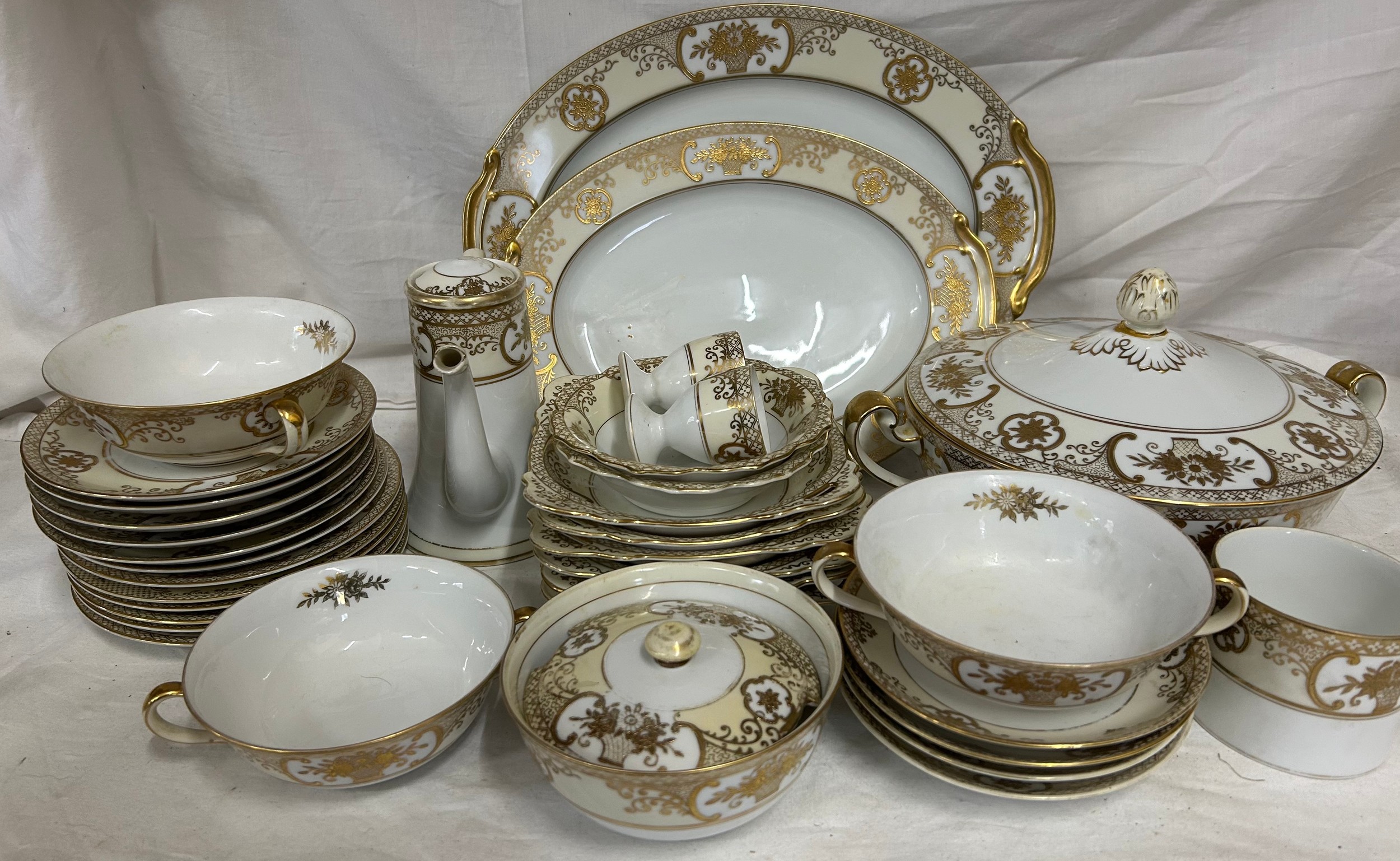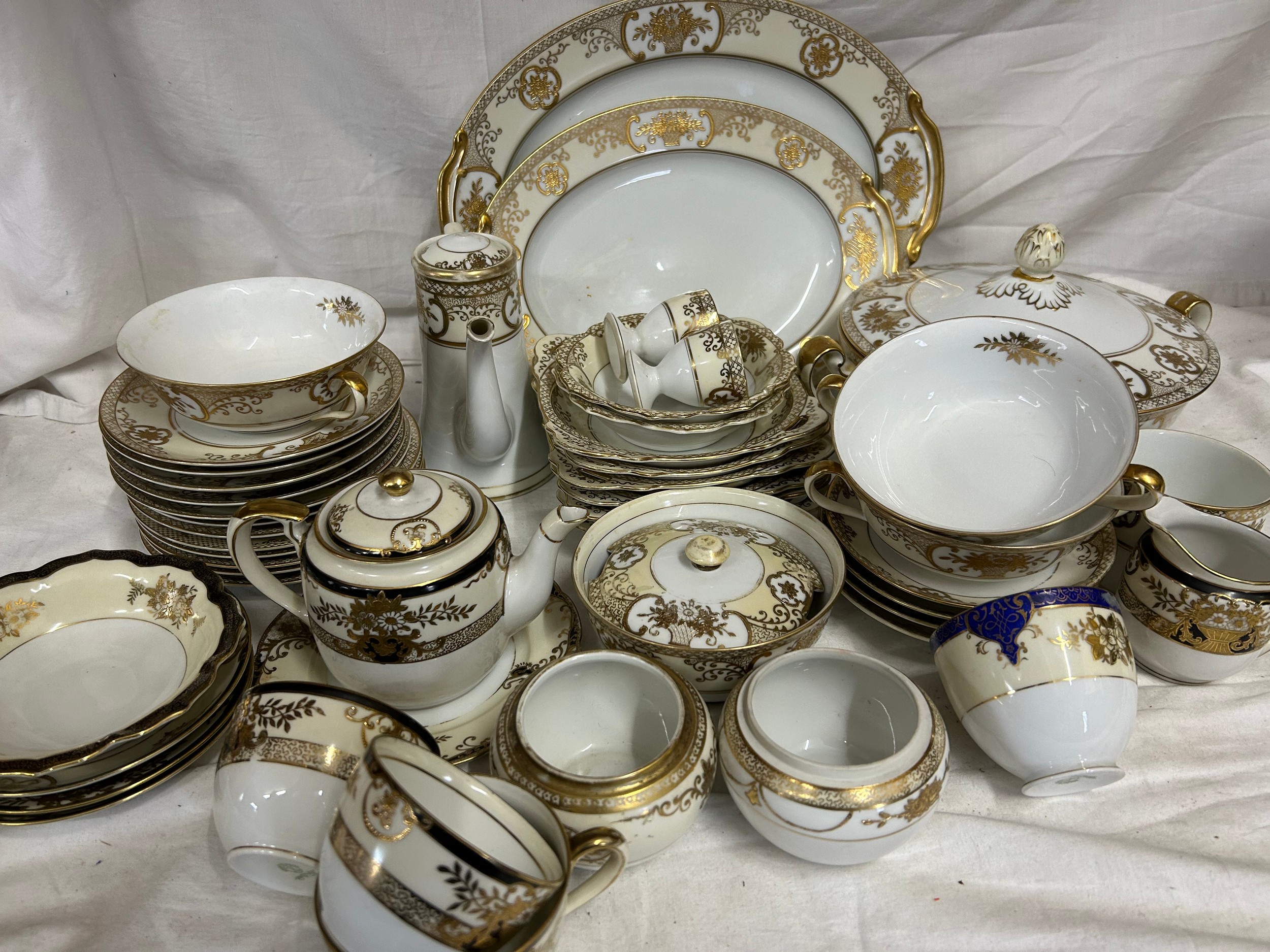 A Noritake part dinner service pattern 44318 to include 2 x serving plates largest 35cm, lidded tureen, 10 x saucers, 6 x side plates, 2 x soup bowls, 6 x square dessert dishes, coffee pot, 2 x egg cups, together with Noritake black and gold floral design cups and saucers etc.