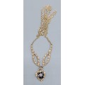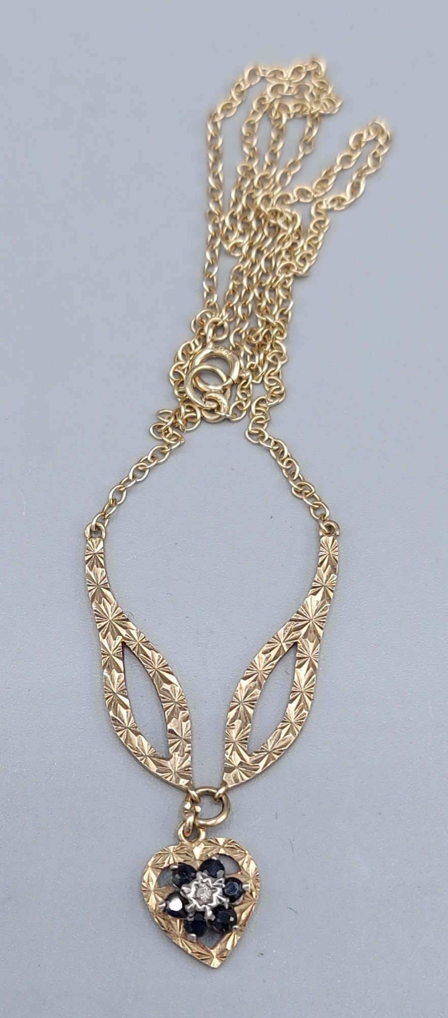 A 9ct gold necklace, the heart form pendant set with Diamonds and Sapphires with fine link chain, 4.1gms