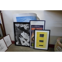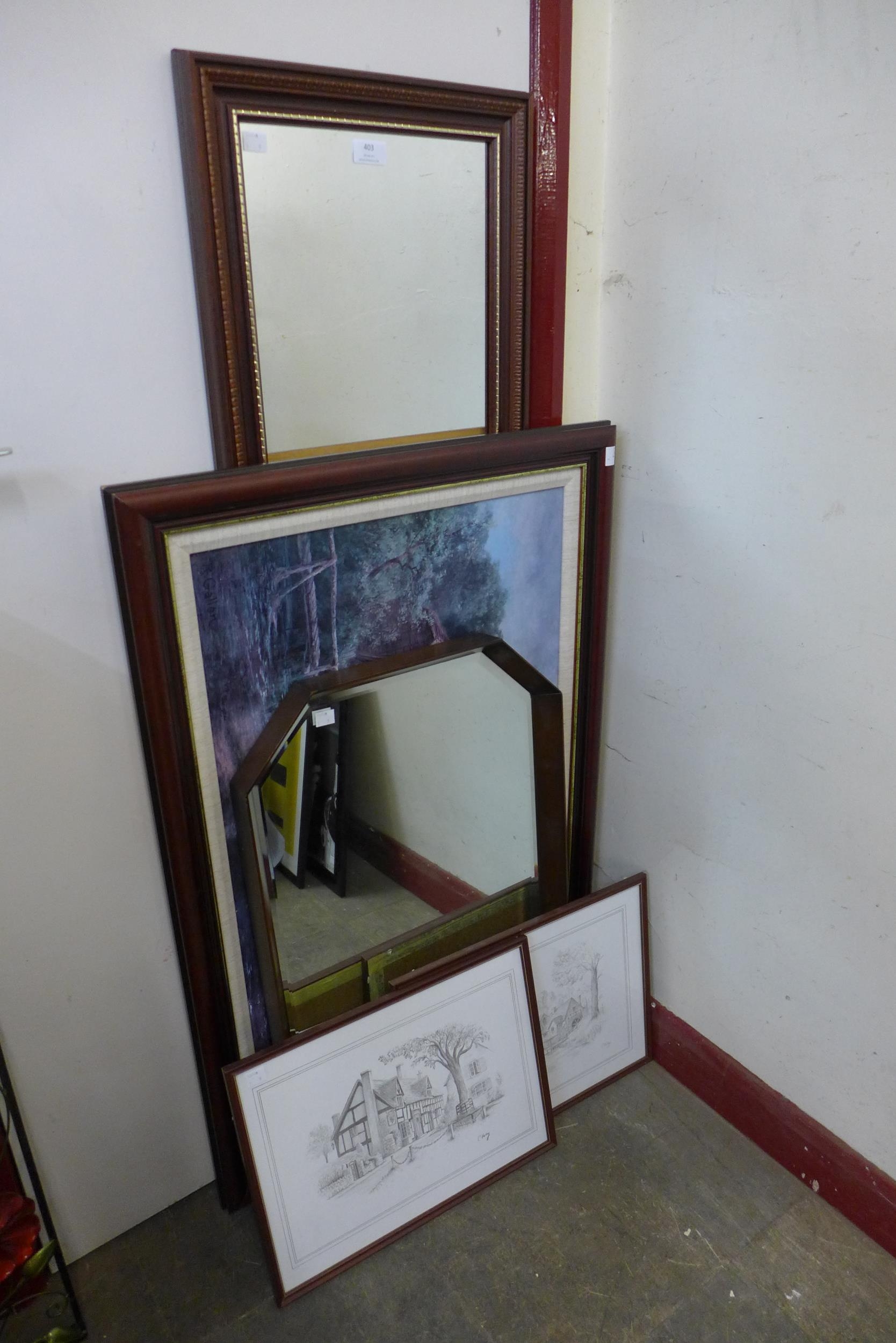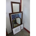 A bevelled edge mirror, another mirror, a modern oil on board and two signed C. Varley prints