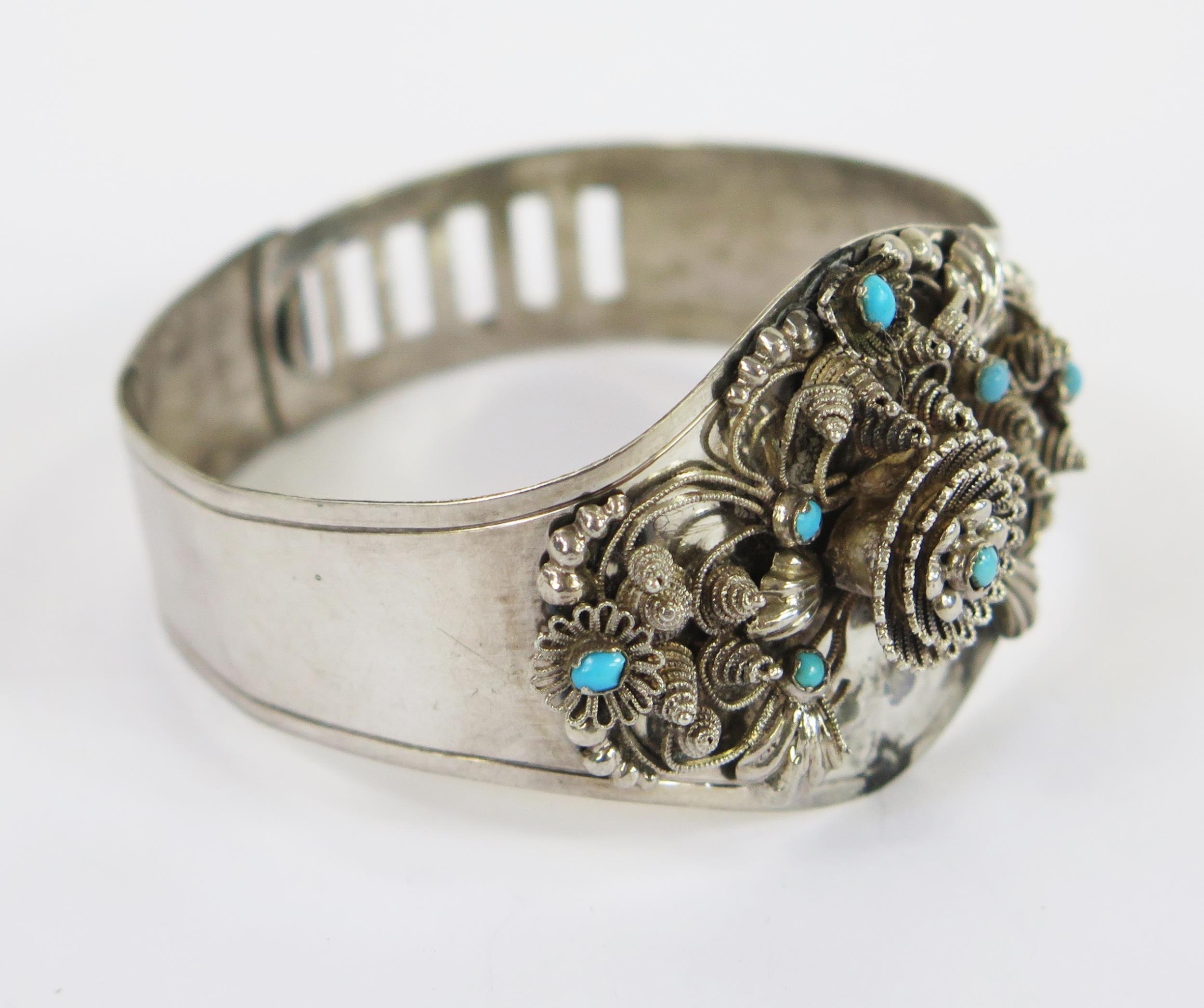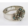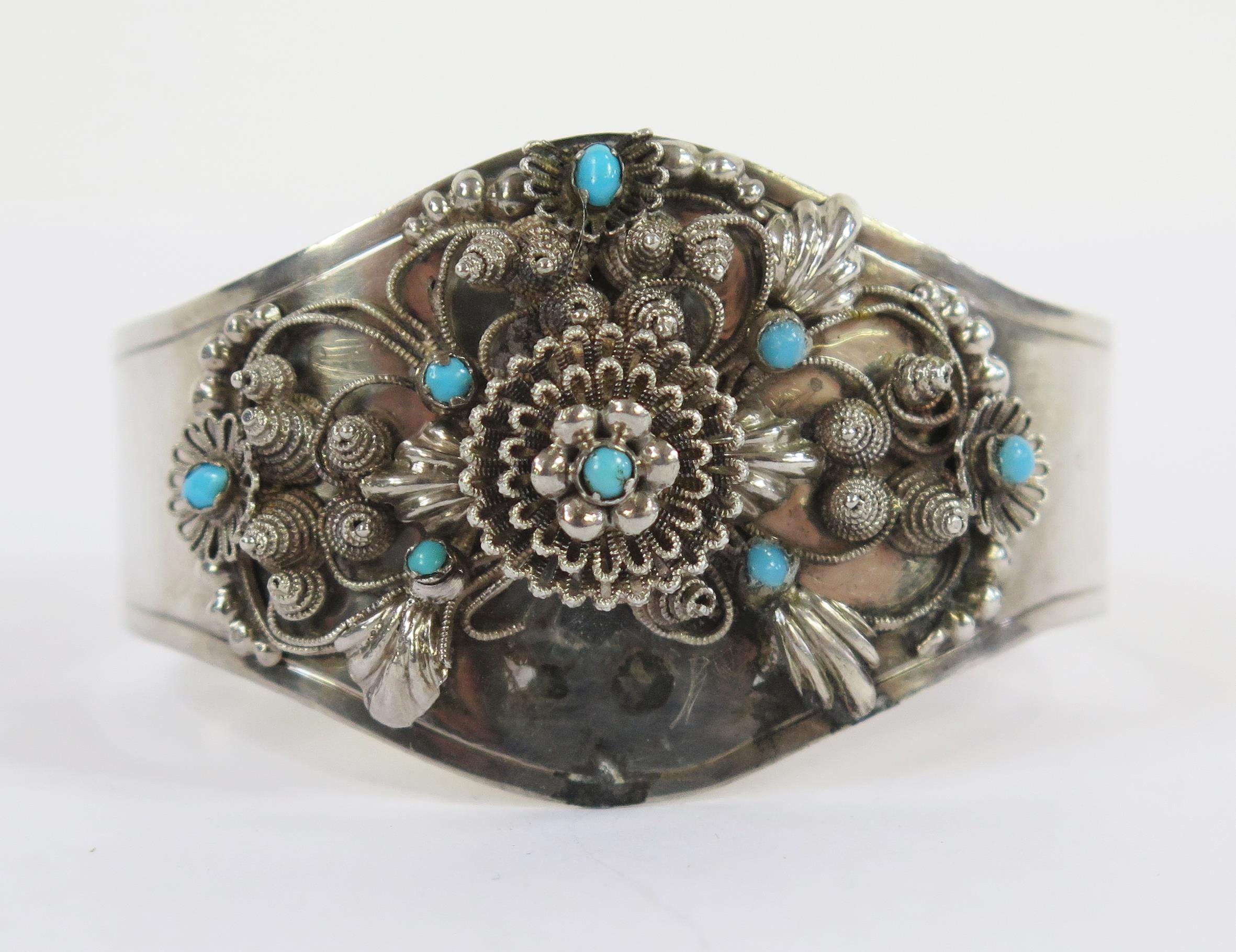 A Georgian Silver Filigree and Turquoise Adjustable Bangle, lion passant and date letter n, 25.68g