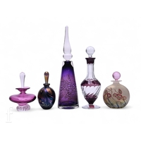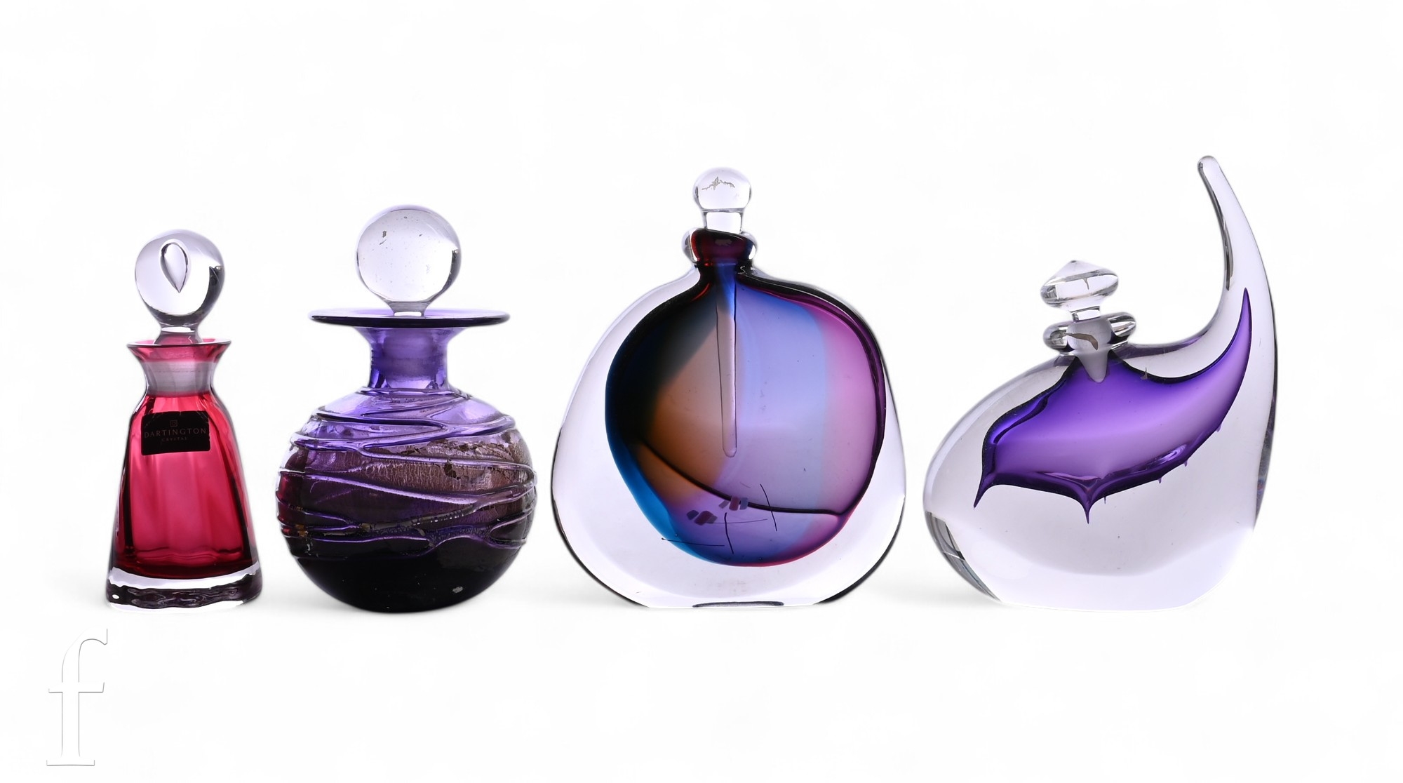 Chris Comins, a studio glass scent flask, compressed ovoid form, clear over purple and teal core, with long stemmed stopper, signed to base, height 14cm, together with a Stuart Akroyd 'Topfin Bottle Spike' scent flask, clear over abstract purple spiked core, engraved signature to base, a Topglass scent flask by Stuart Fletcher and a Dartington scent flask, clear over ruby, of conical form with bubble included clear glass stopper, height 12cm. (4)