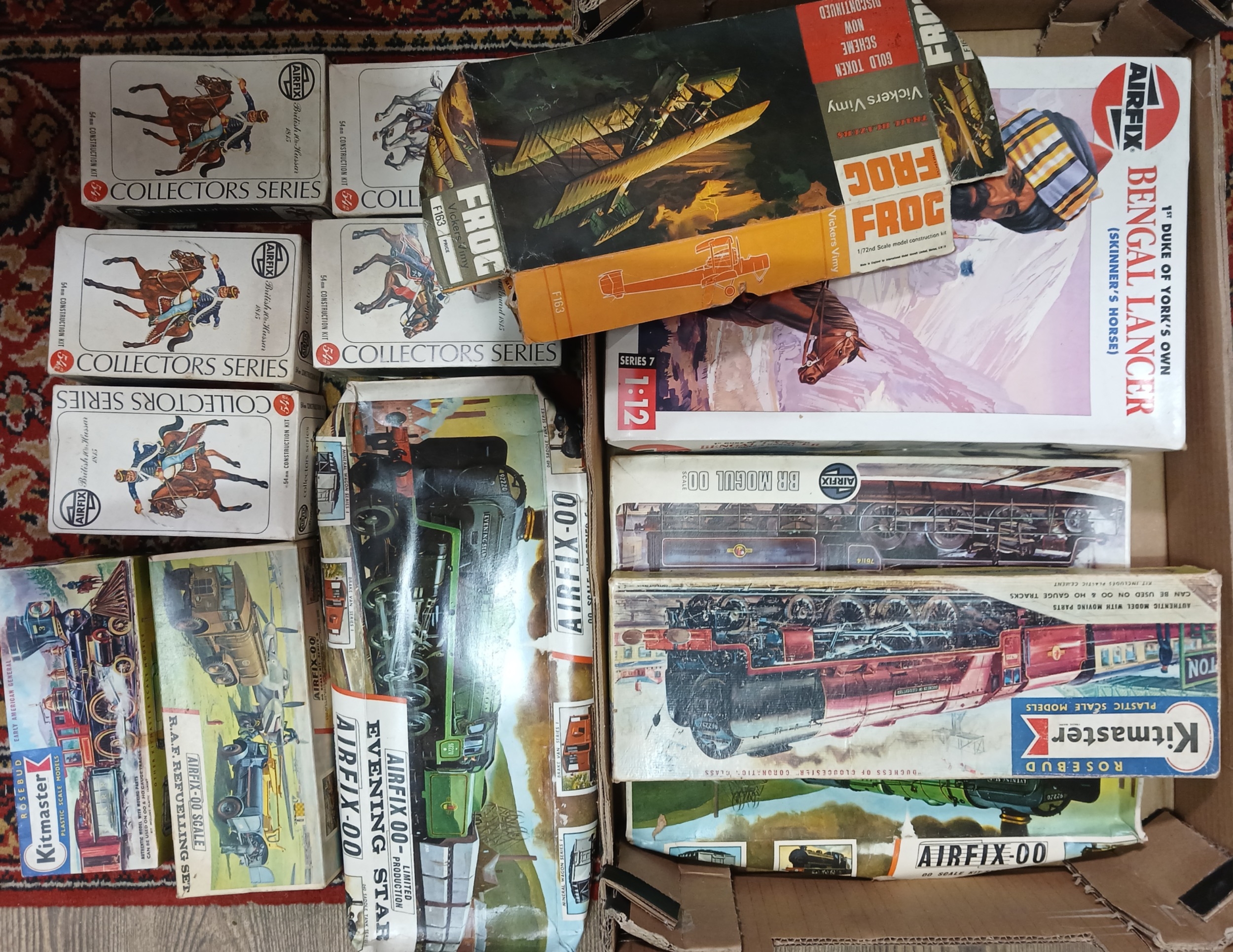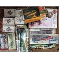 A box of unbuilt model kits including Airfix, Kitmaster, Frog etc.