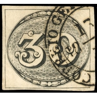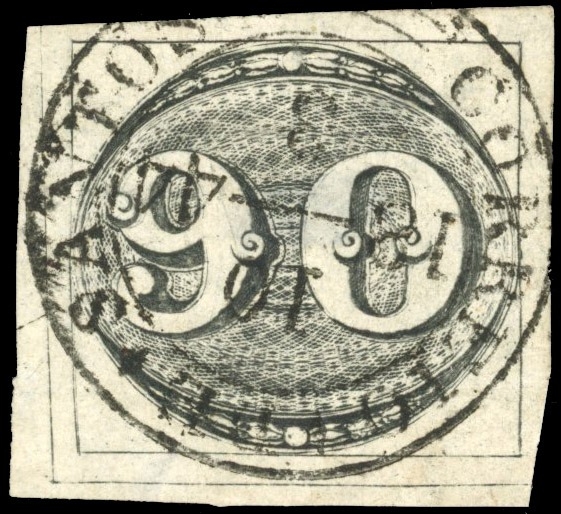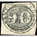 Bull's Eye: 1843 Worn Impression 90r four good to large margins, those at left and base with full extra dividing line, used with large part Santos datestamp, some paper thinning, good appearance