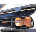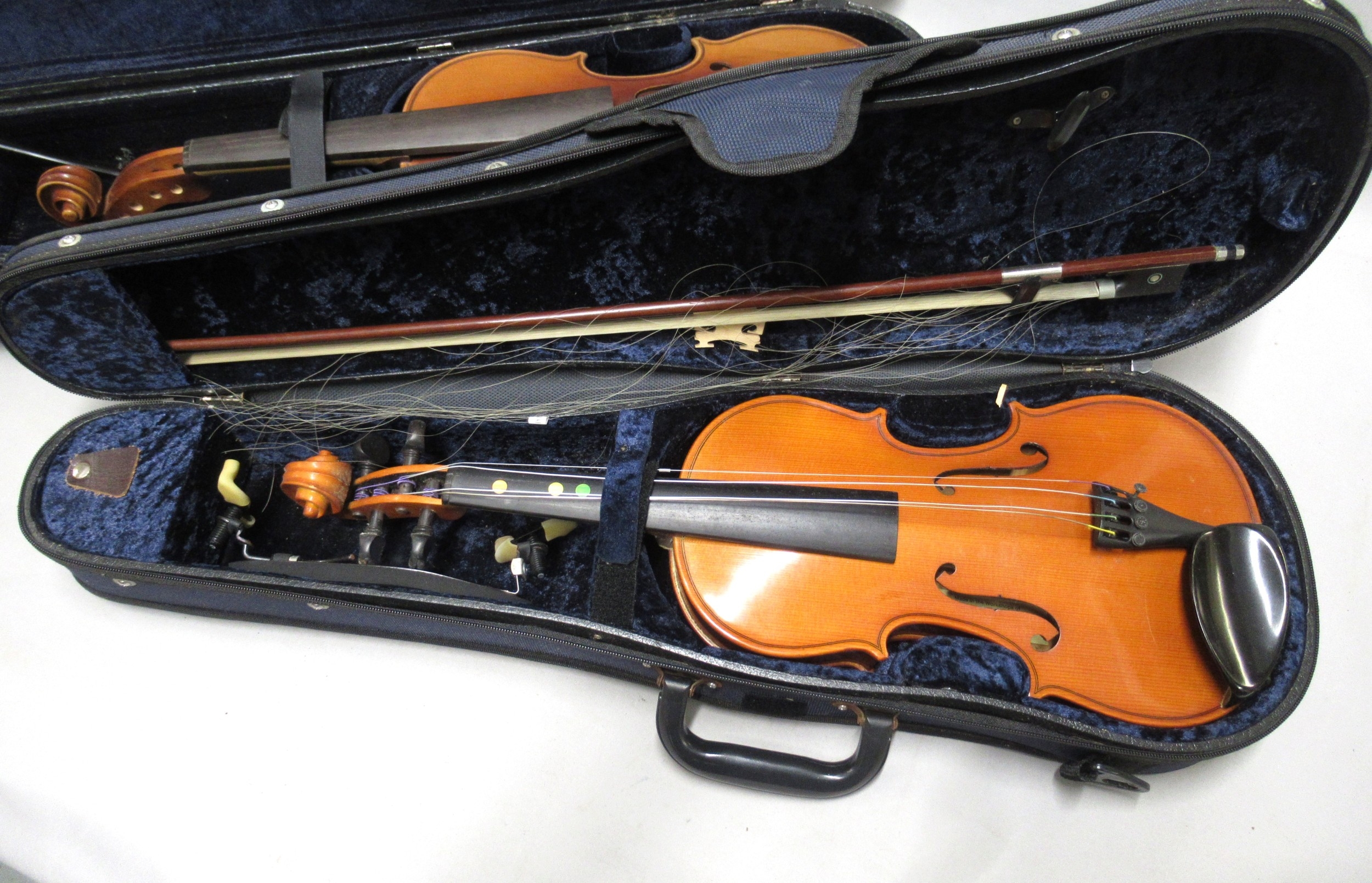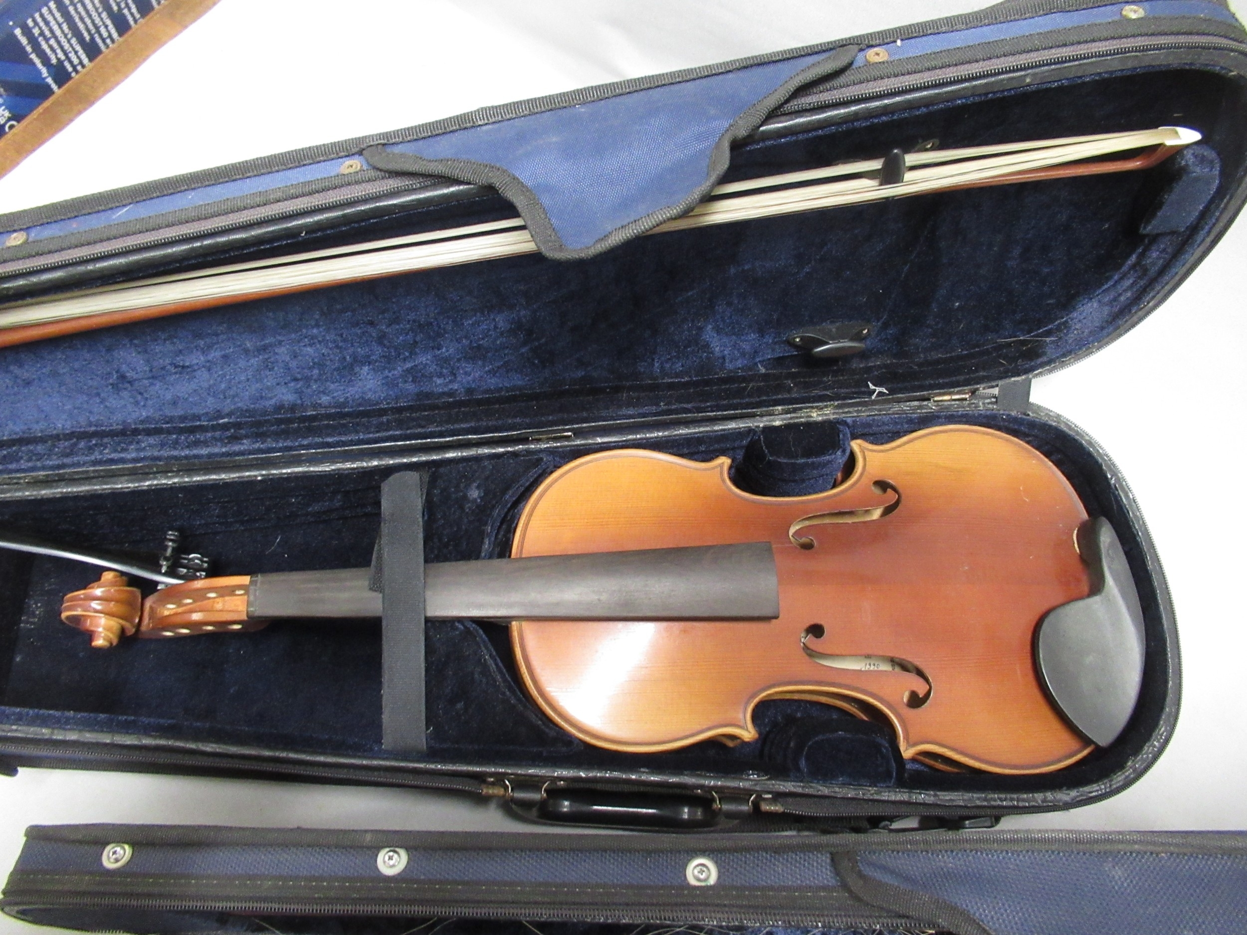 Two modern violins in cases, together with a Bundy cased clarinet