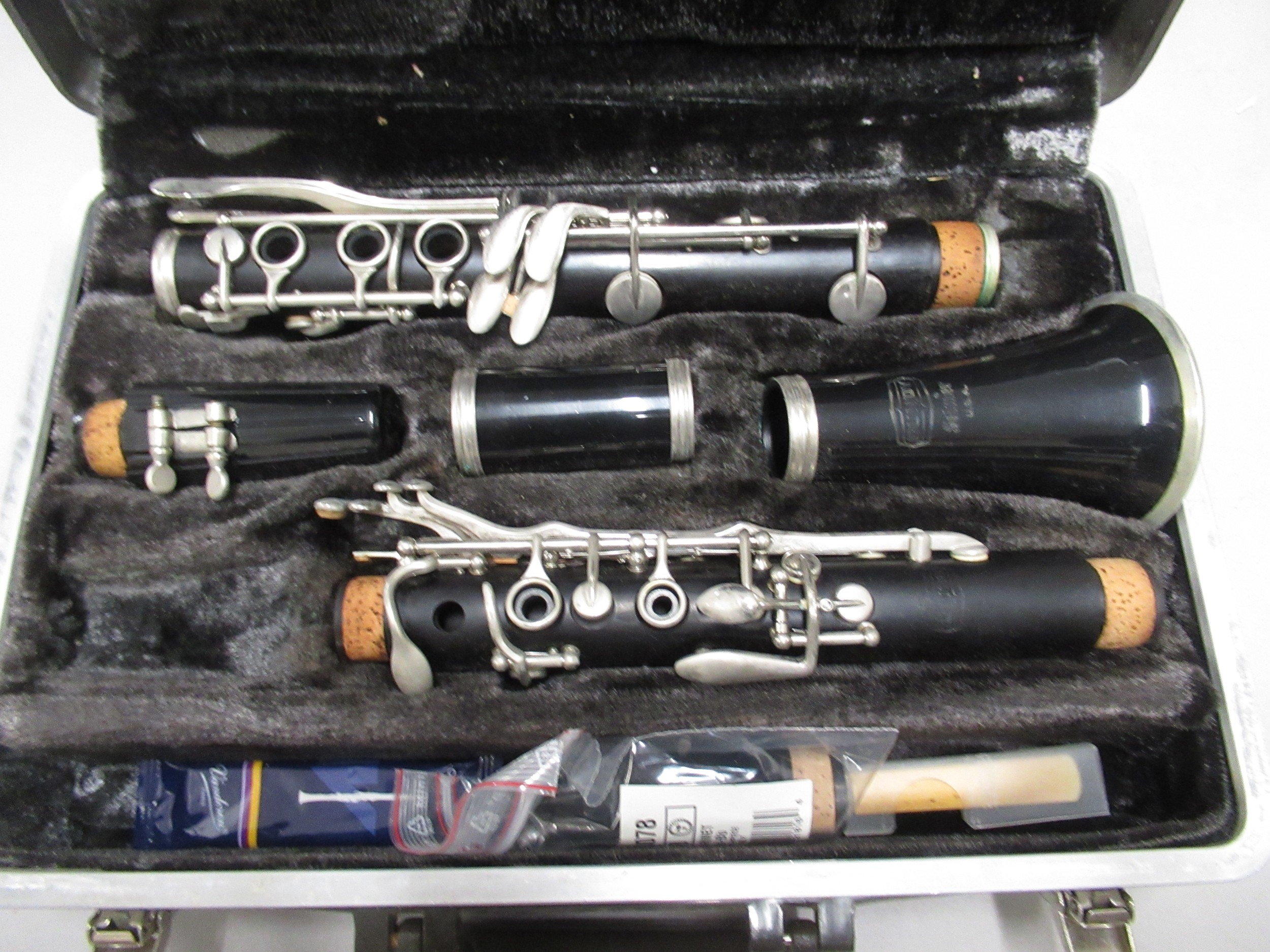 Two modern violins in cases, together with a Bundy cased cla...