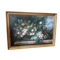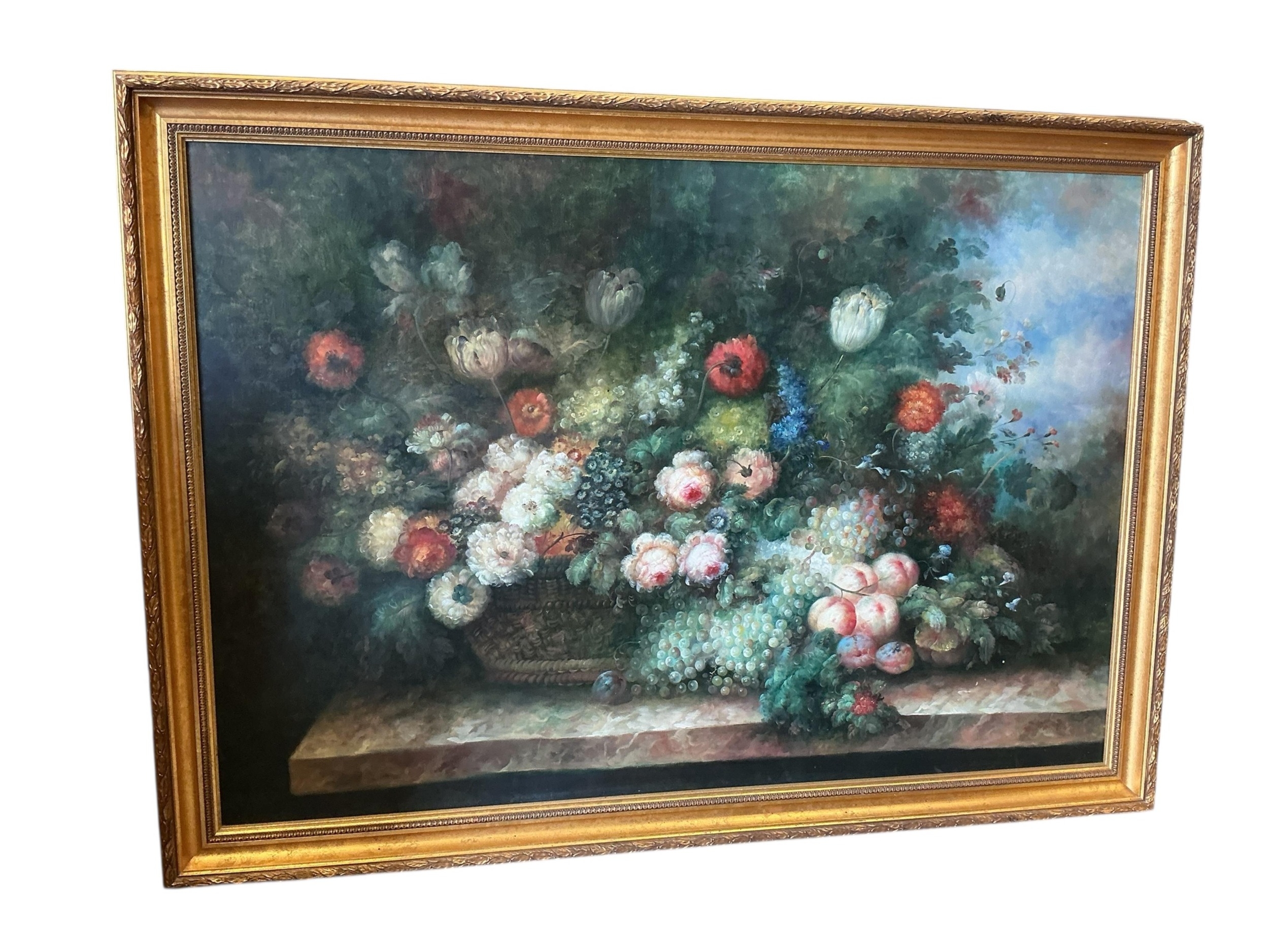 A large Dutch style canvas, still life of roses, peony and fruit. 196cm x 142cm
