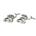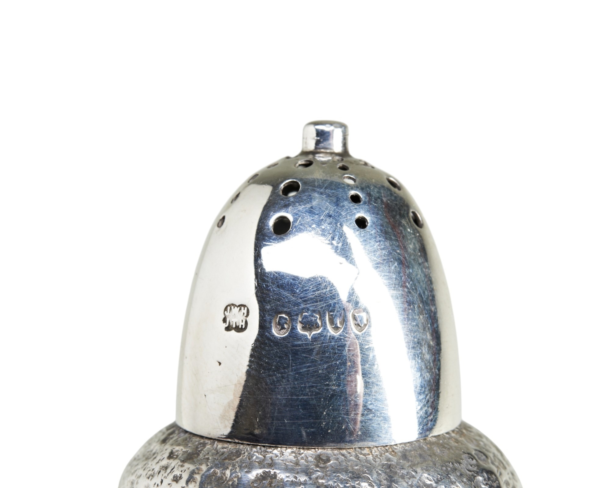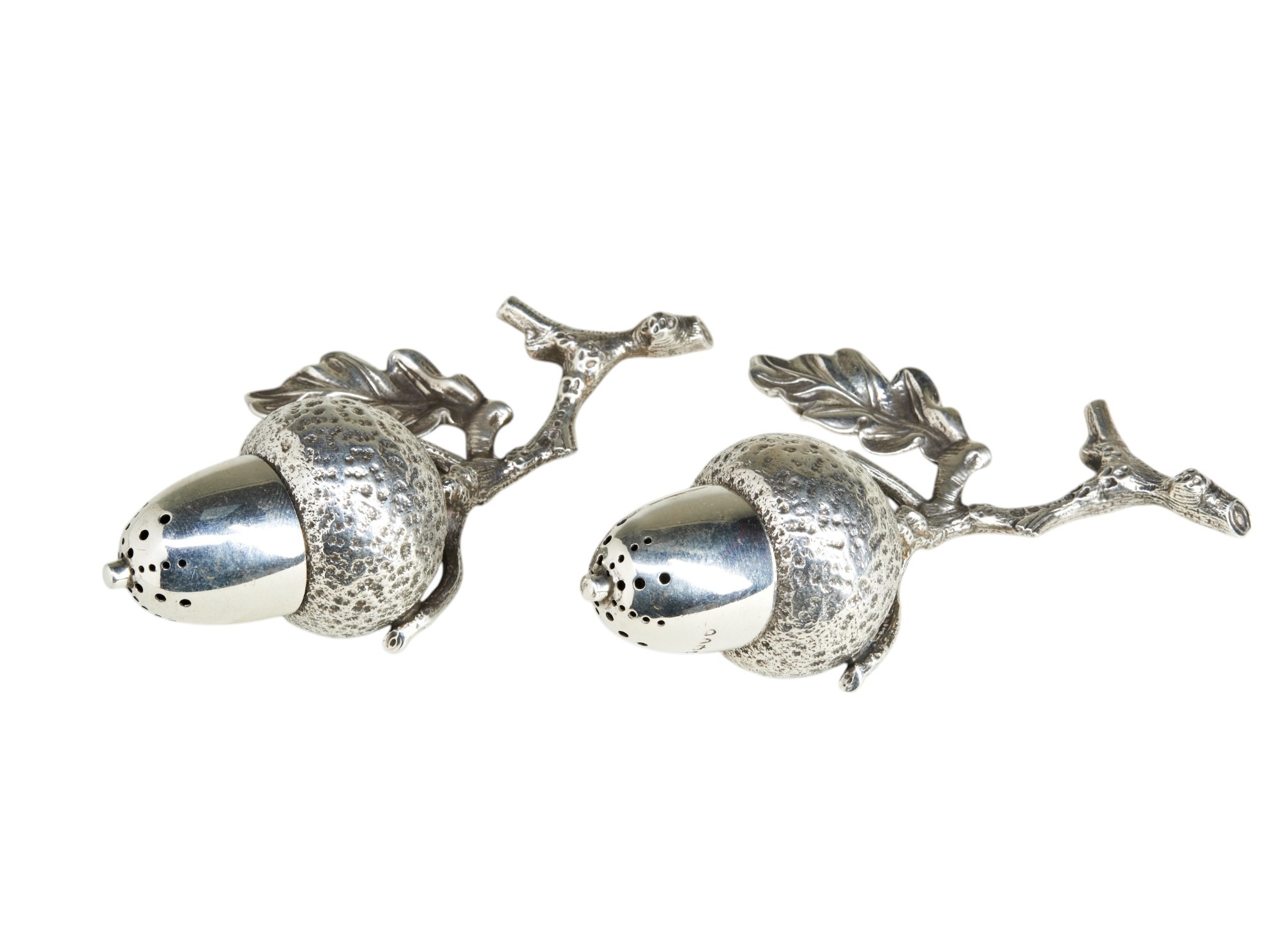 A pair of peppers each cast in the form of an acorn on a sprig of oak, the top part of the acorn unscrews for filling. Made in London in 1884 by Hukin & Heath.