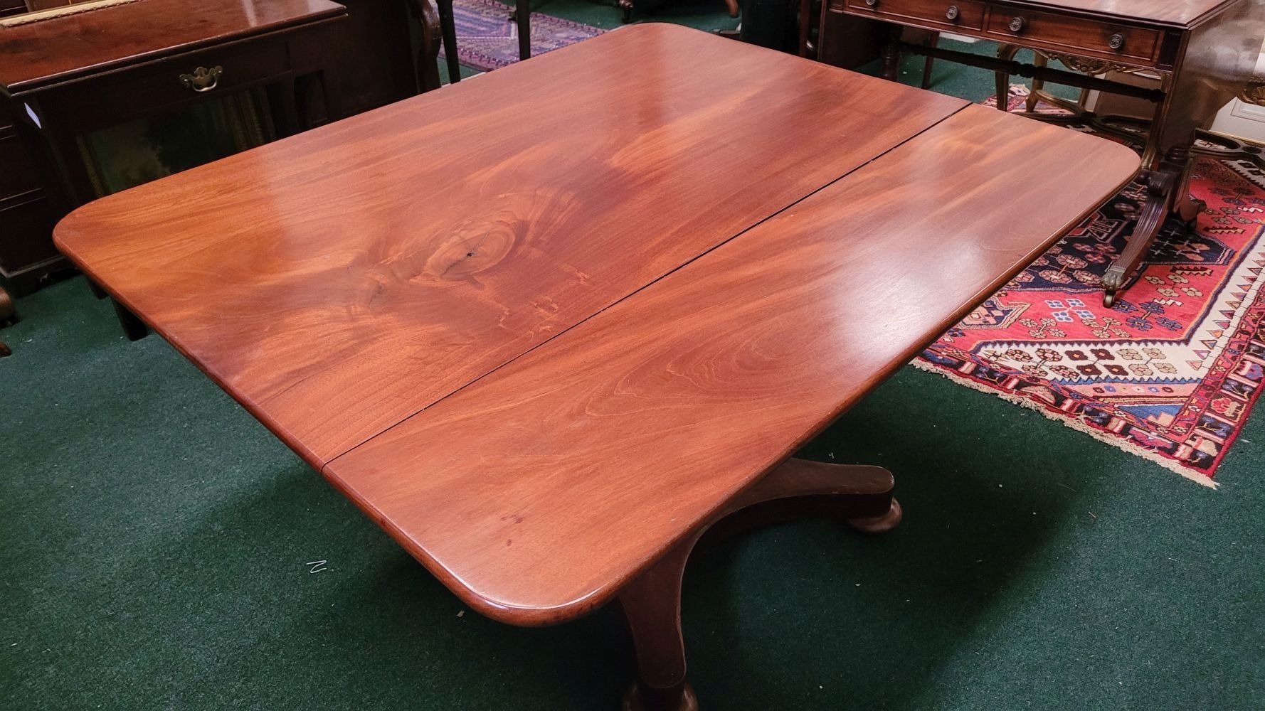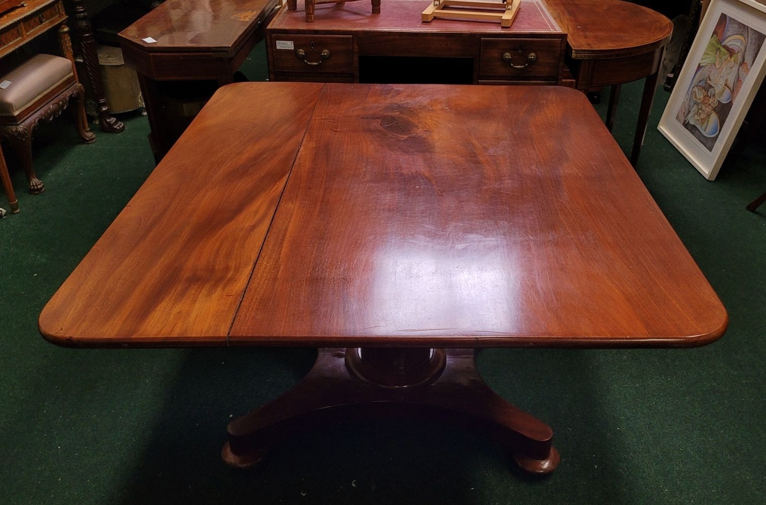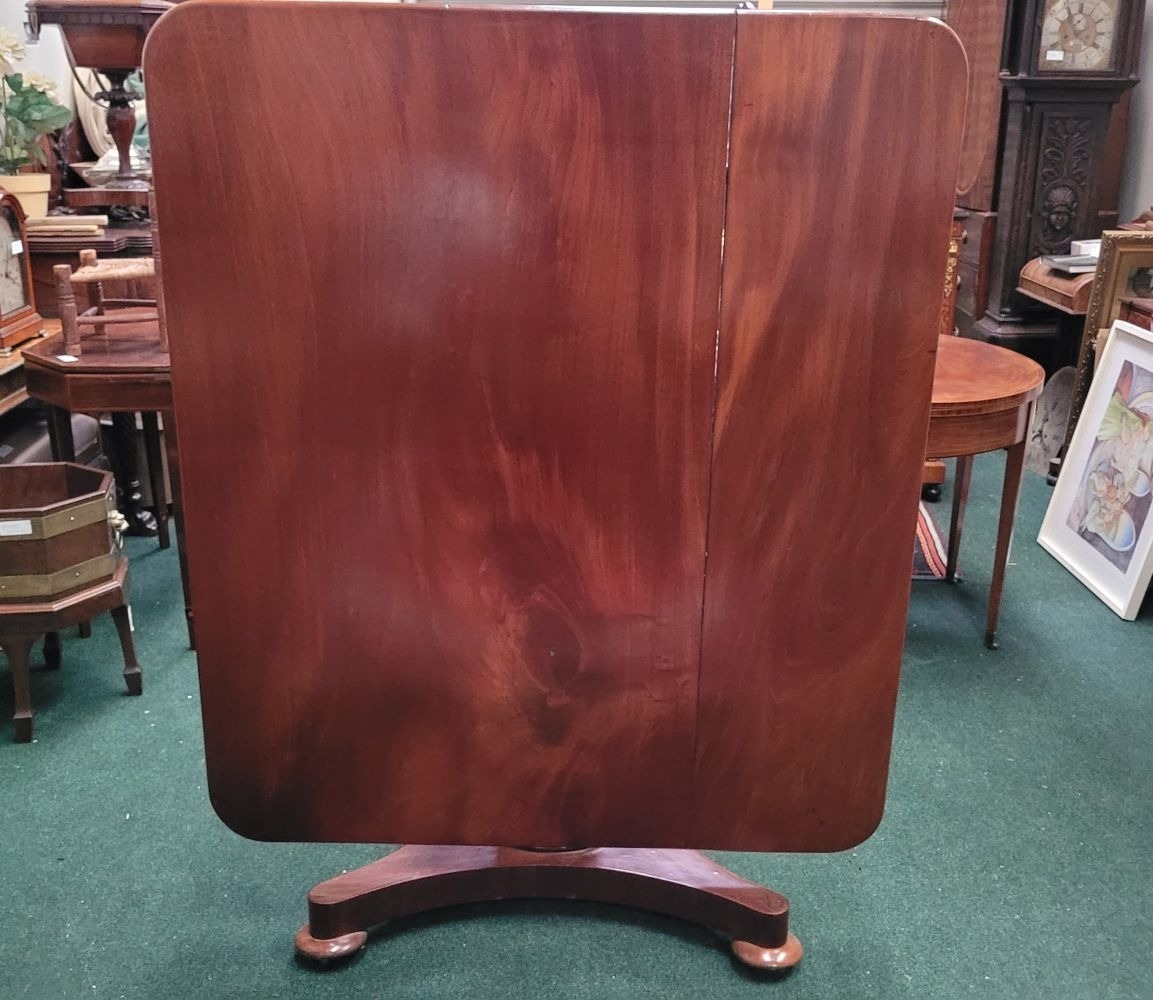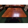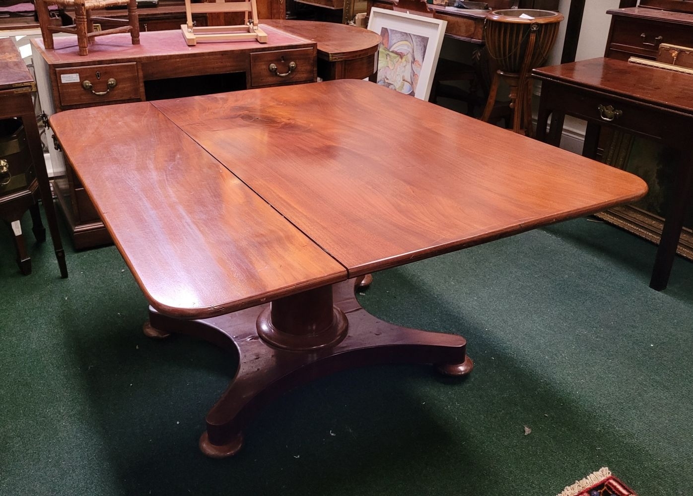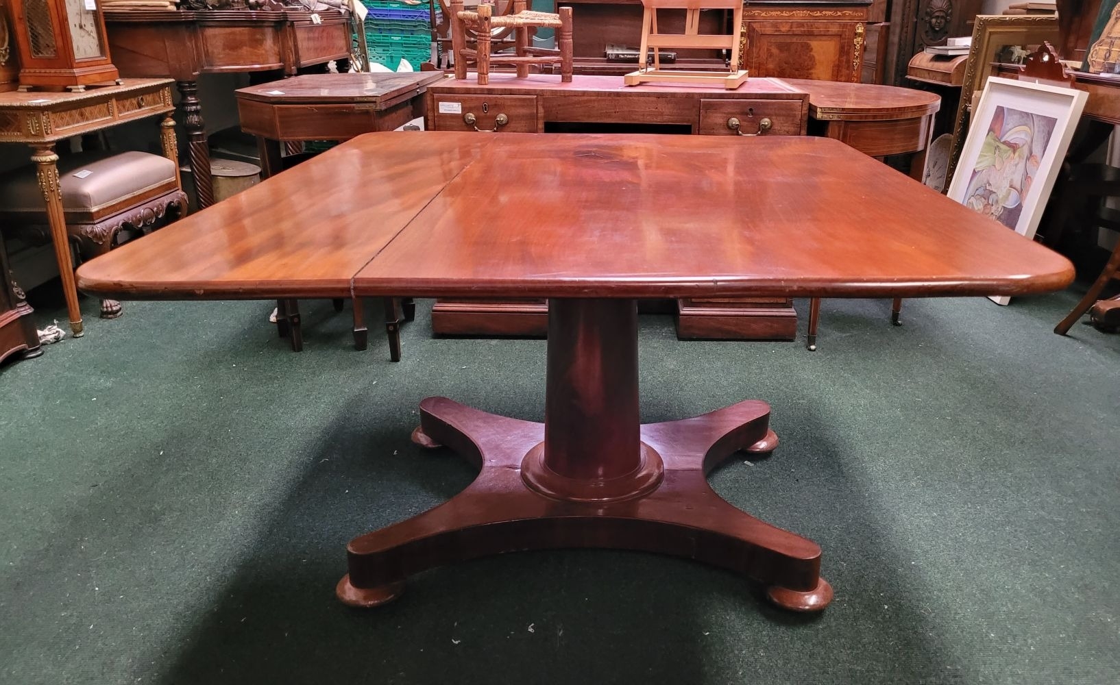 A LARGE IRISH REGENCY MAHOGANY TIP-UP DINING TABLE, the table top made from two pieces of stunning mahogany has a wrought iron handle beneath that allows you to tip the table top on two brass twist fittings. This makes the table easy to store while not in use and so takes up less space in the home. This finely crafted Irish mahogany dining table can sit 10. The base has an impressive canon shaped upright support on a quadra form base with bun feet on castors. Condition: in over all very good condition; the joining of the two table surface pieces does need attention, and there is a old surface damage as photographed. The base veneer has a little lifting that needs mending. Dimensions when down: 138 x 118 x 72cm (W x D x H). Dimensions when up: 118 x 71 x 157cm (W x D x H).