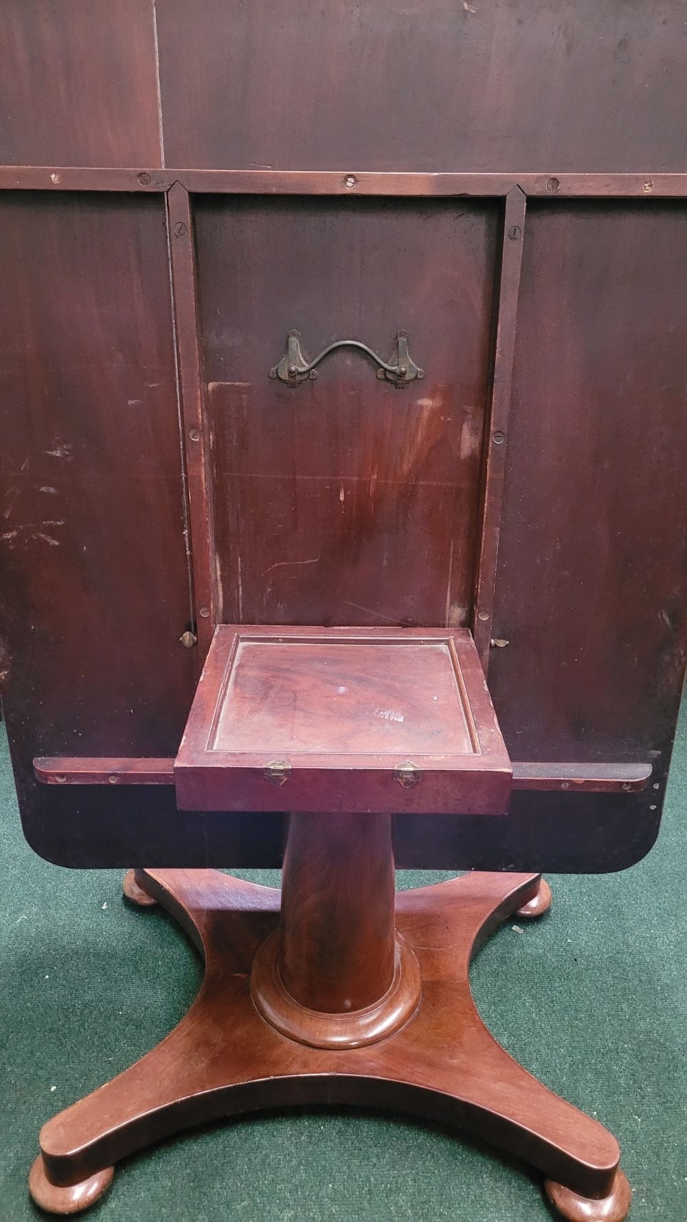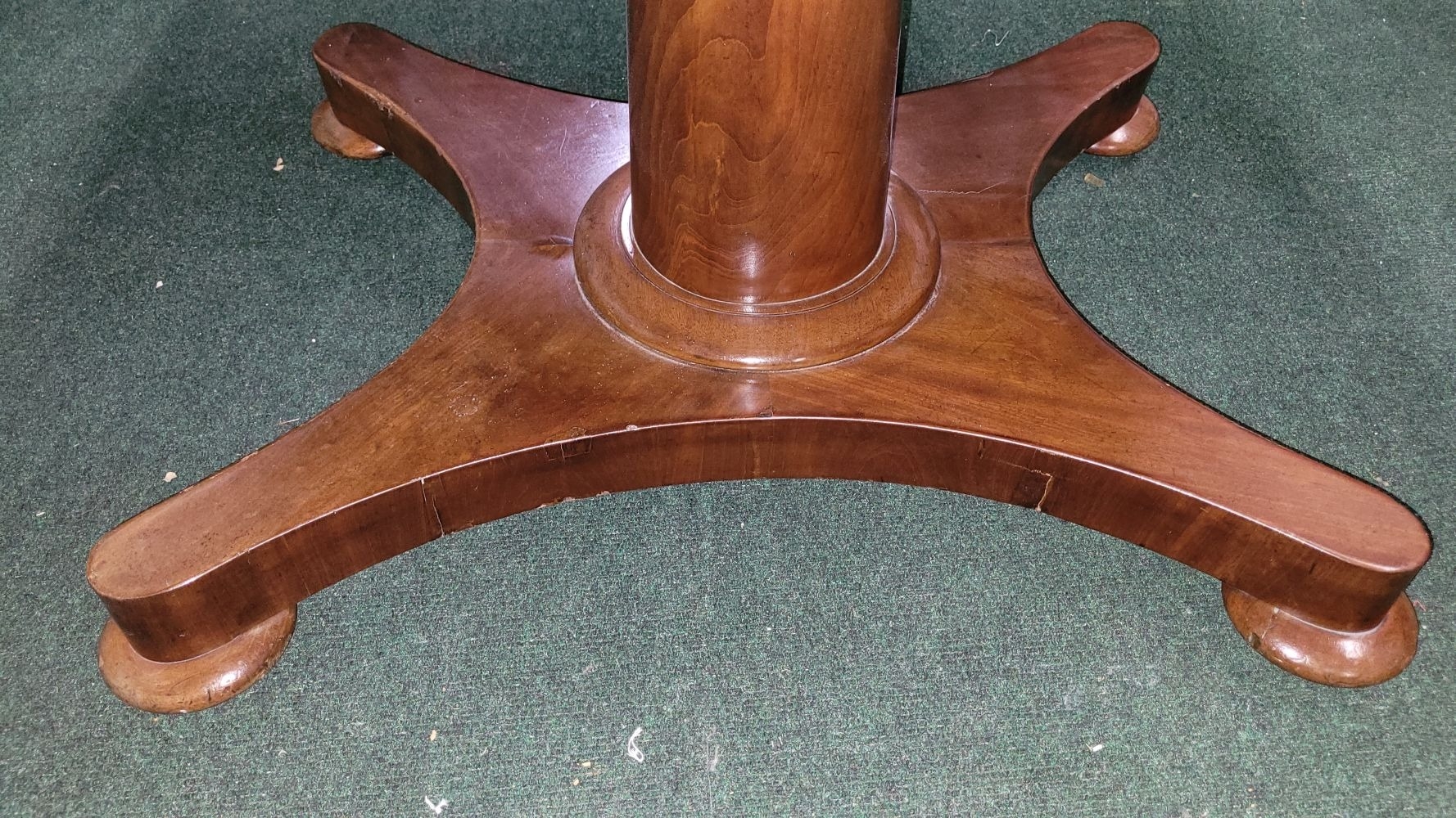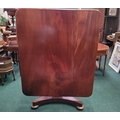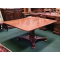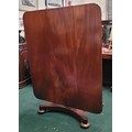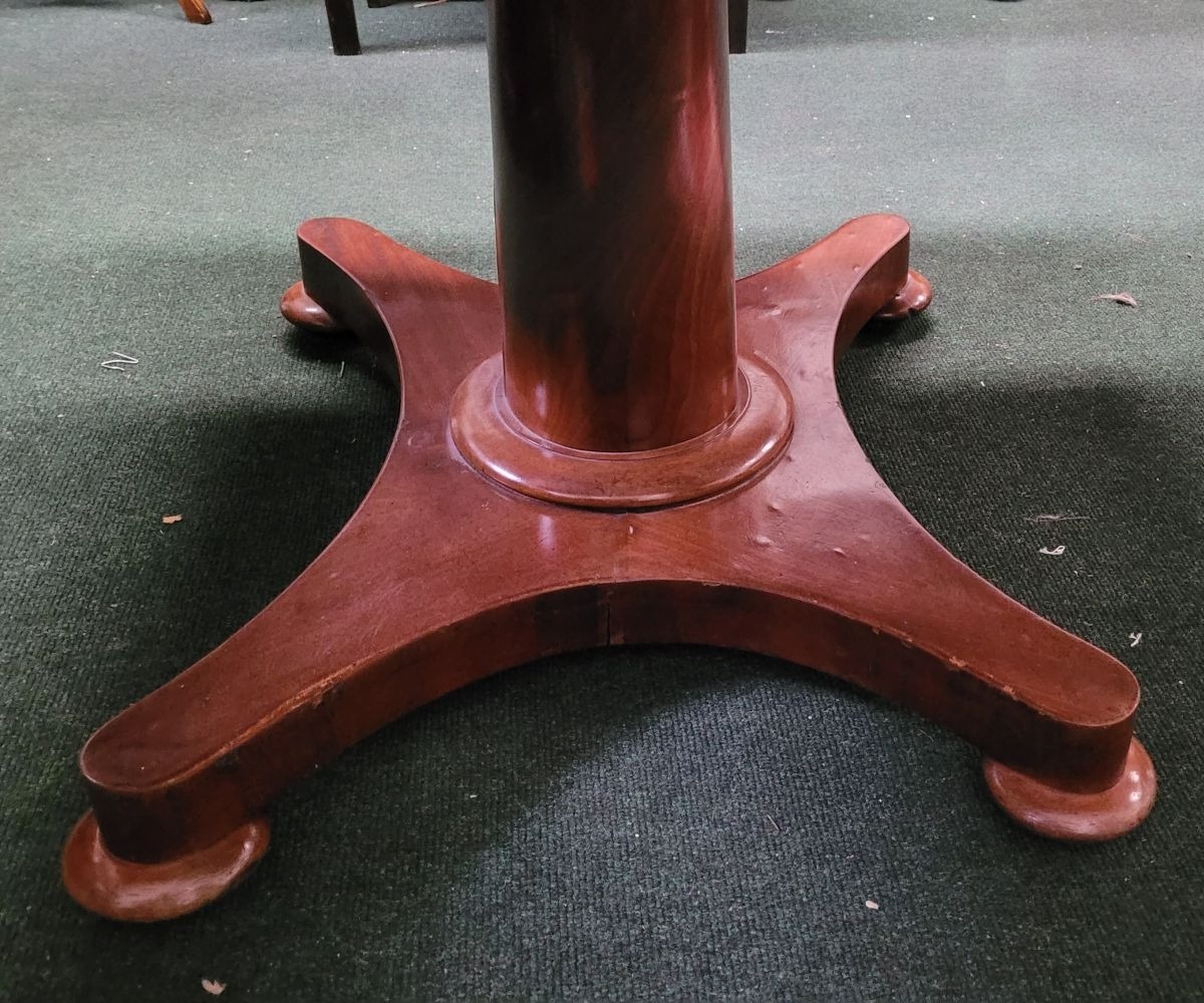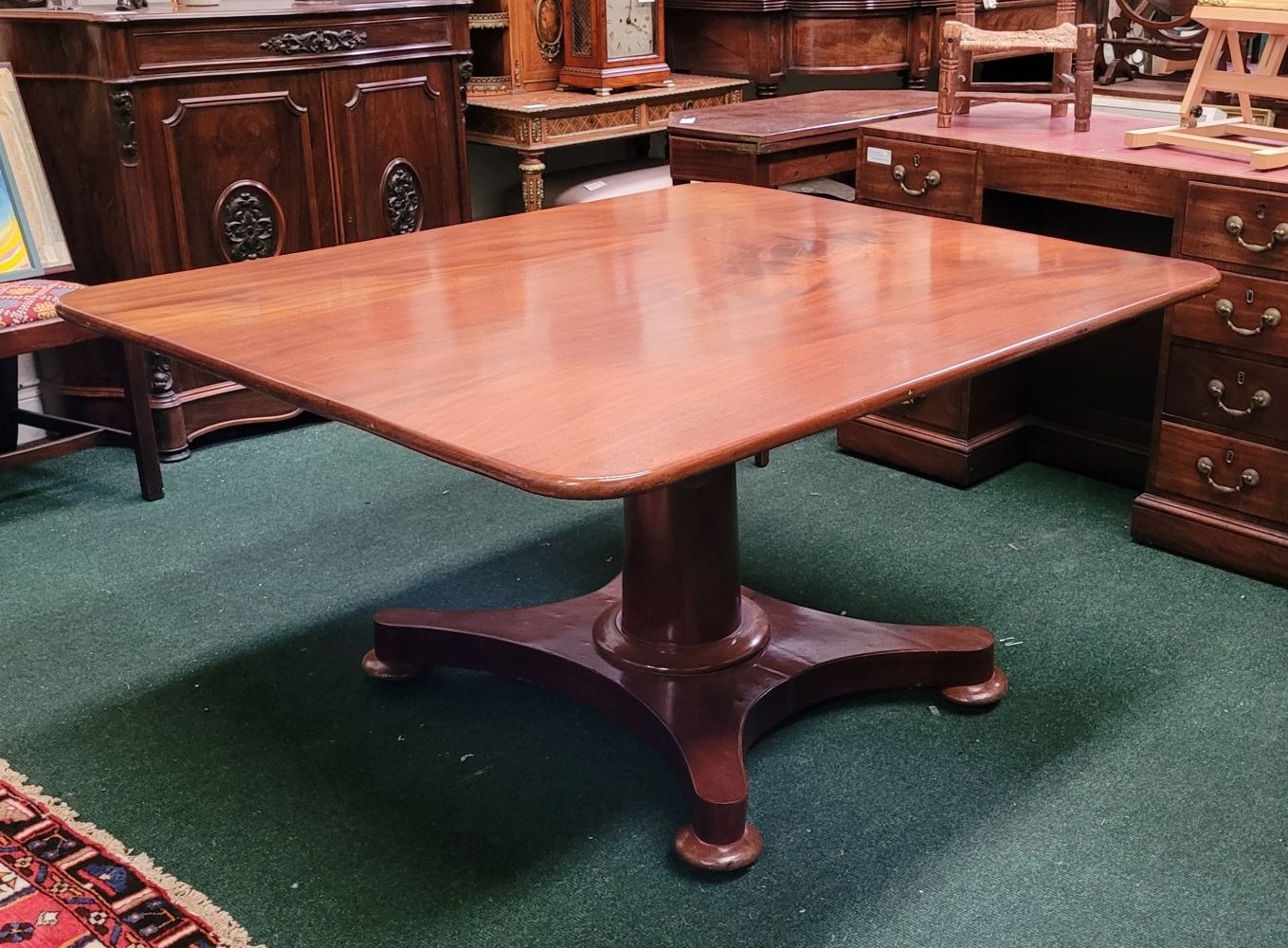 A LARGE IRISH REGENCY MAHOGANY TIP-UP DINING TABLE, the table top made from two pieces of stunning mahogany has a wrought iron handle beneath that allows you to tip the table top on two brass twist fittings. This makes the table easy to store while not in use and so takes up less space in the home. This finely crafted Irish mahogany dining table can sit 10. The base has an impressive canon shaped upright support on a quadra form base with bun feet on castors. Condition: in over all very good condition; the joining of the two table surface pieces does need attention, and there is a old surface damage as photographed. The base veneer has a little lifting that needs mending. Dimensions when down: 138 x 118 x 72cm (W x D x H). Dimensions when up: 118 x 71 x 157cm (W x D x H).