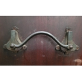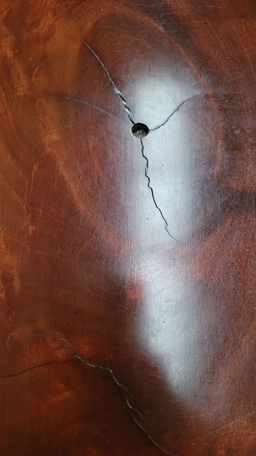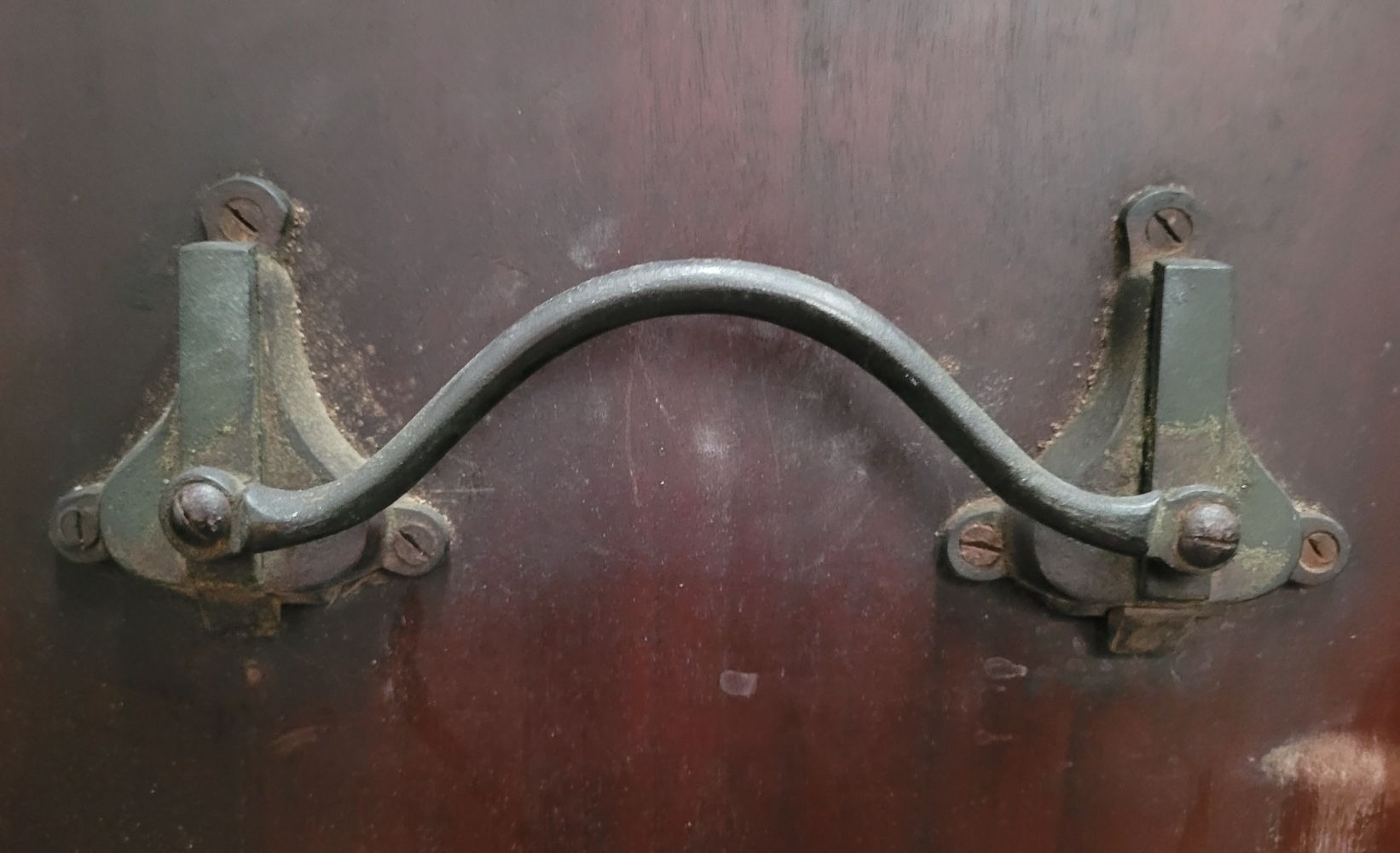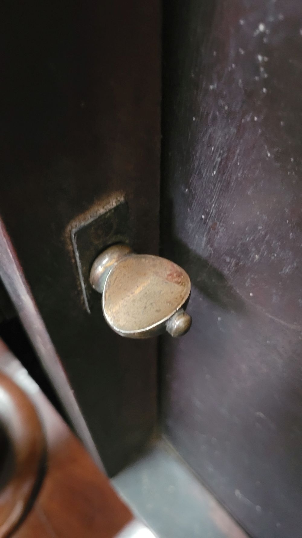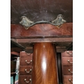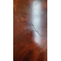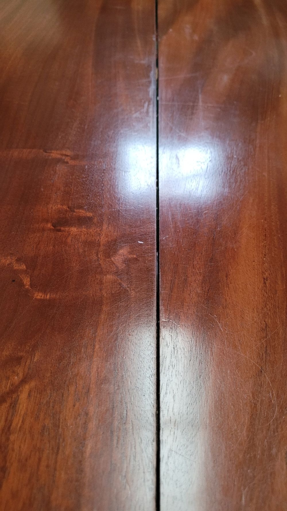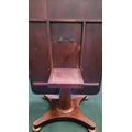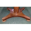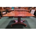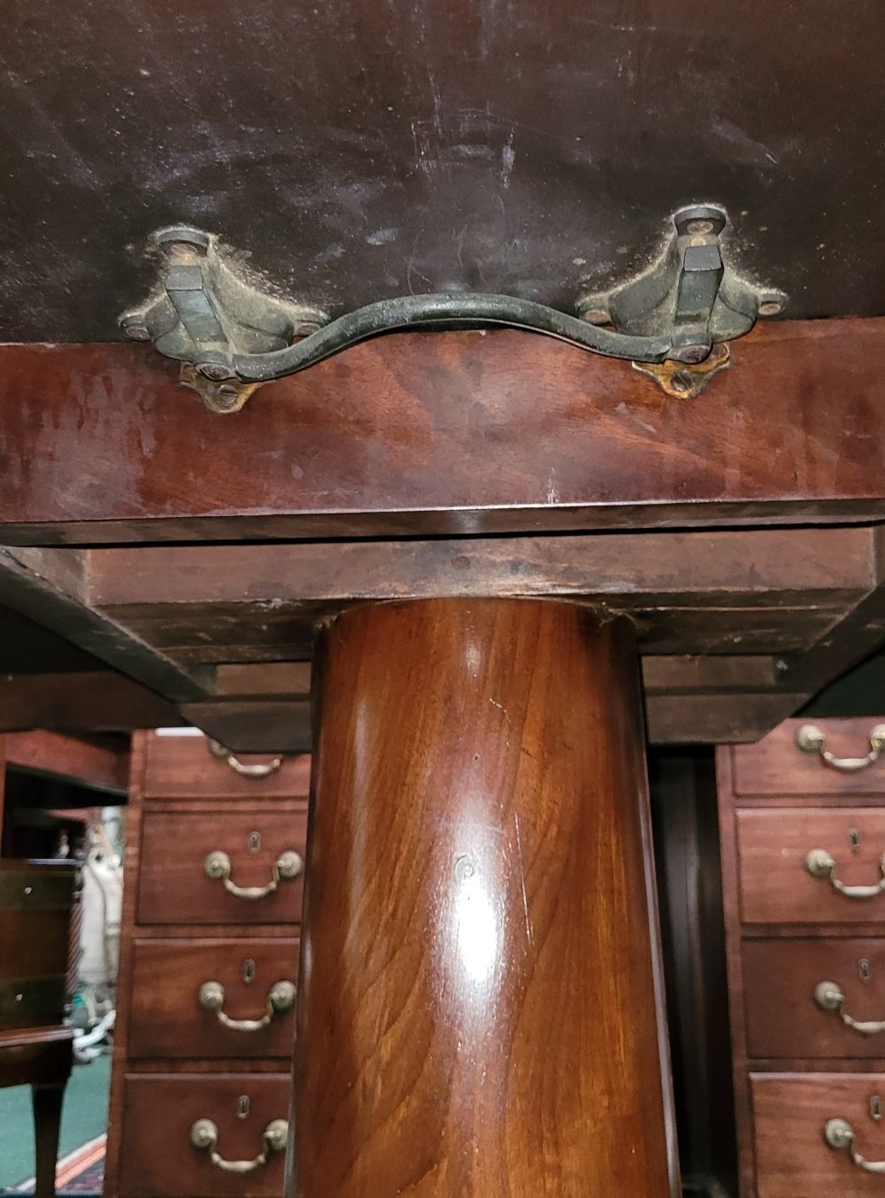 A LARGE IRISH REGENCY MAHOGANY TIP-UP DINING TABLE, the table top made from two pieces of stunning mahogany has a wrought iron handle beneath that allows you to tip the table top on two brass twist fittings. This makes the table easy to store while not in use and so takes up less space in the home. This finely crafted Irish mahogany dining table can sit 10. The base has an impressive canon shaped upright support on a quadra form base with bun feet on castors. Condition: in over all very good condition; the joining of the two table surface pieces does need attention, and there is a old surface damage as photographed. The base veneer has a little lifting that needs mending. Dimensions when down: 138 x 118 x 72cm (W x D x H). Dimensions when up: 118 x 71 x 157cm (W x D x H).