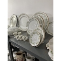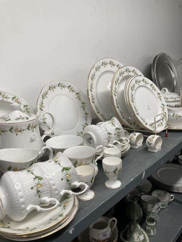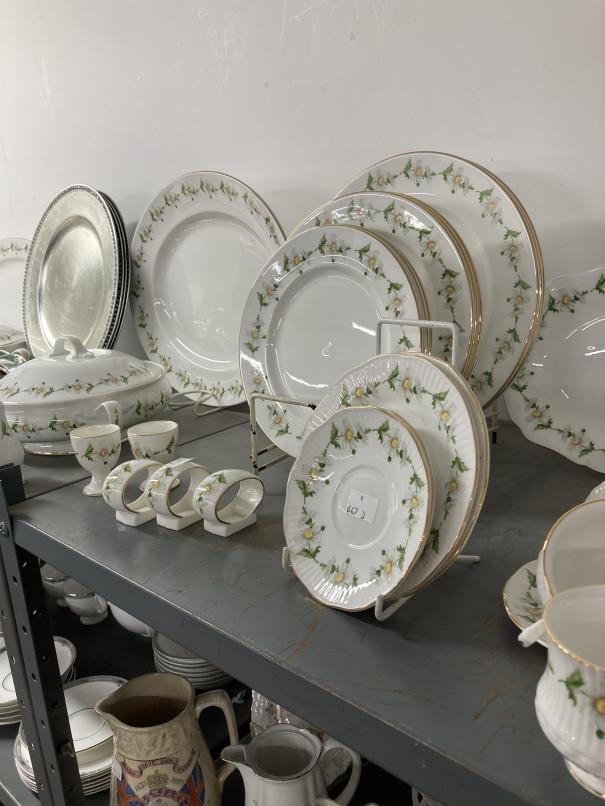 20th cent. Ceramics: Berkshire English bone china six place dinner, tea and coffee set, having daisy pattern, plus six display plates with glass and white metal animal figures napkin rings A/F.