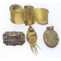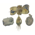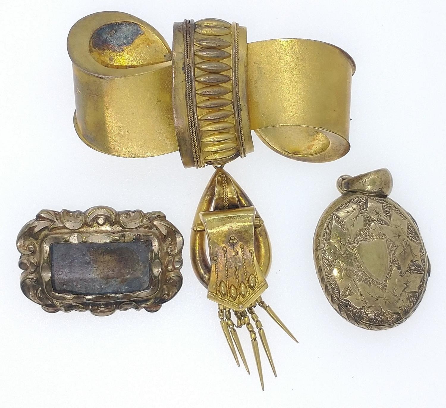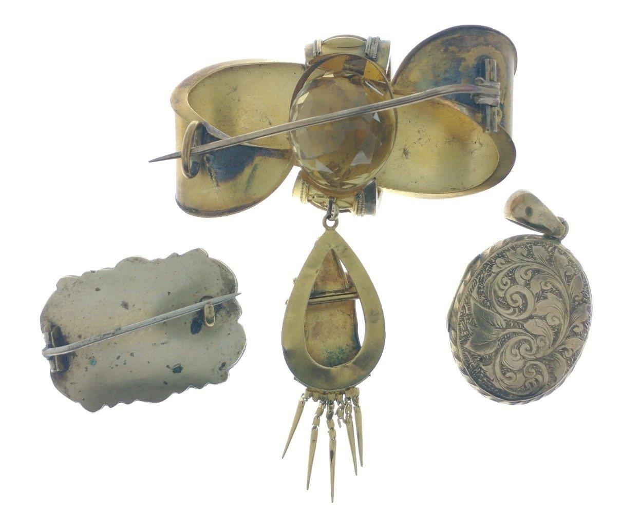 2 Vintage yellow metal booches and a yellow metal oval engraved locket