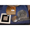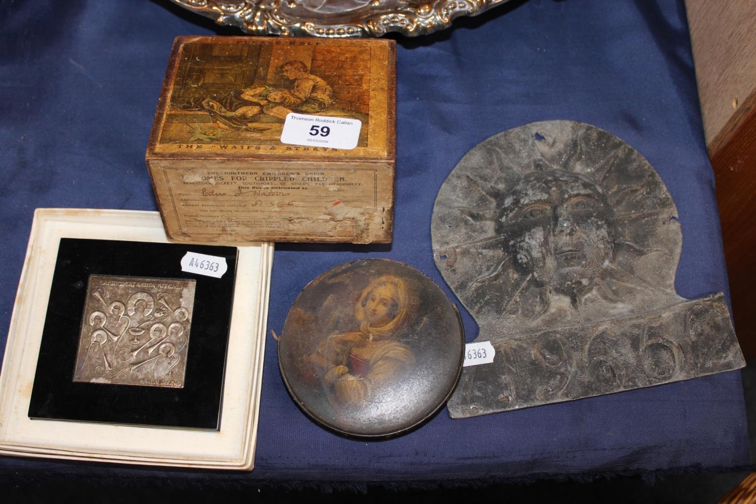 Silver Egyptian style panel, an antique trinket box and cover, a Please Help the Waifs and Strays treen money box, and a Sun Fire Insurance building plaque.