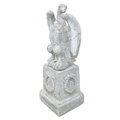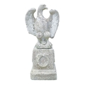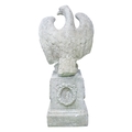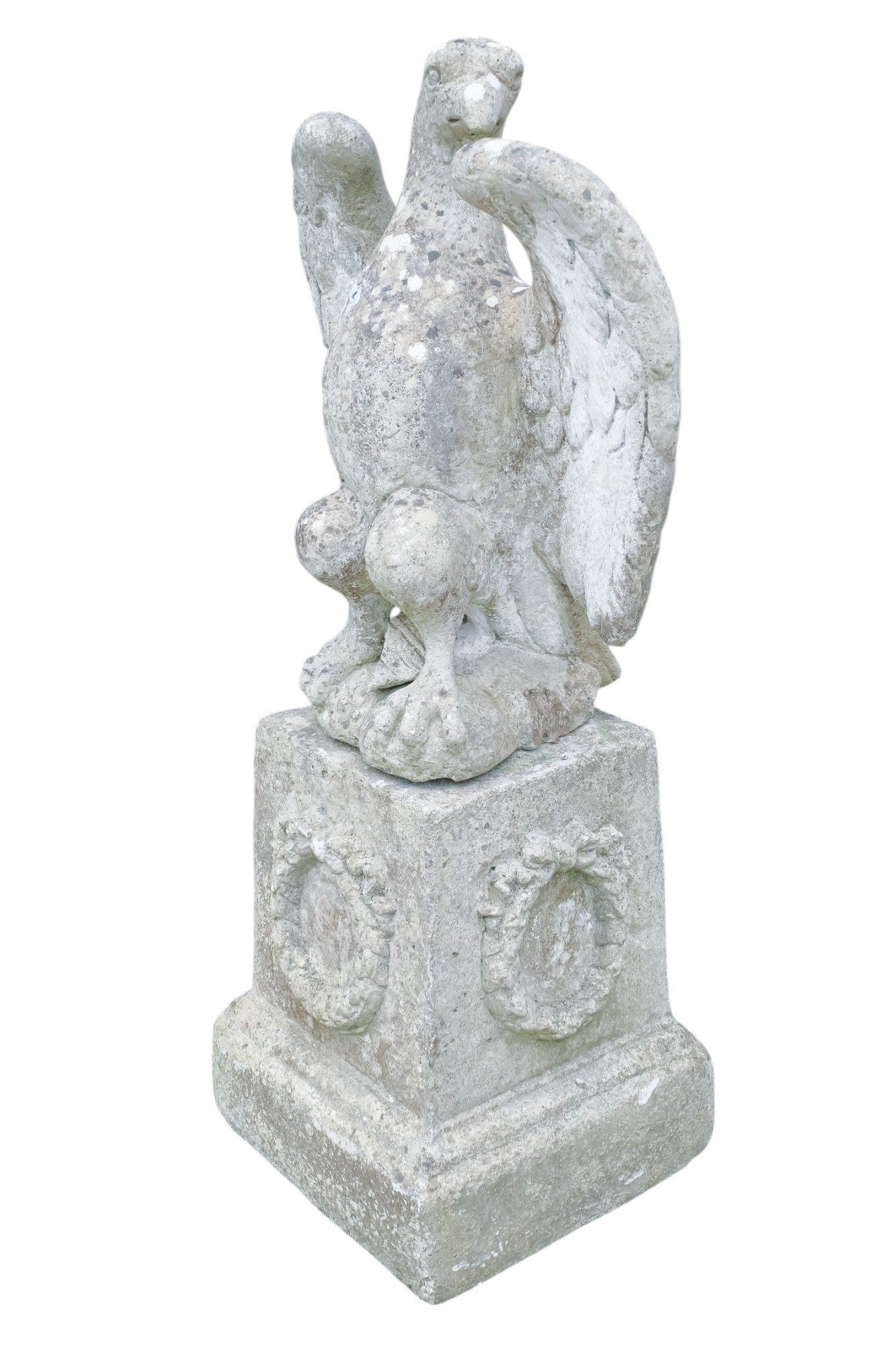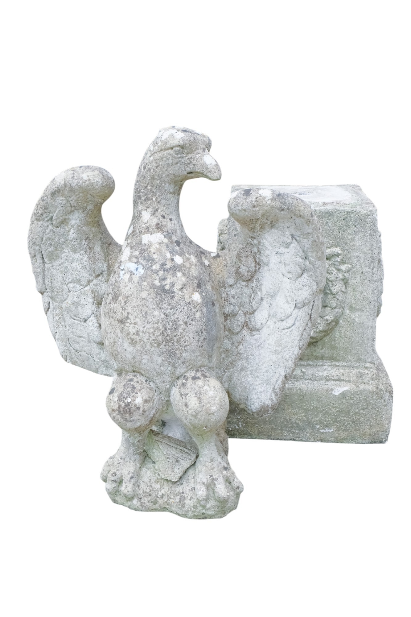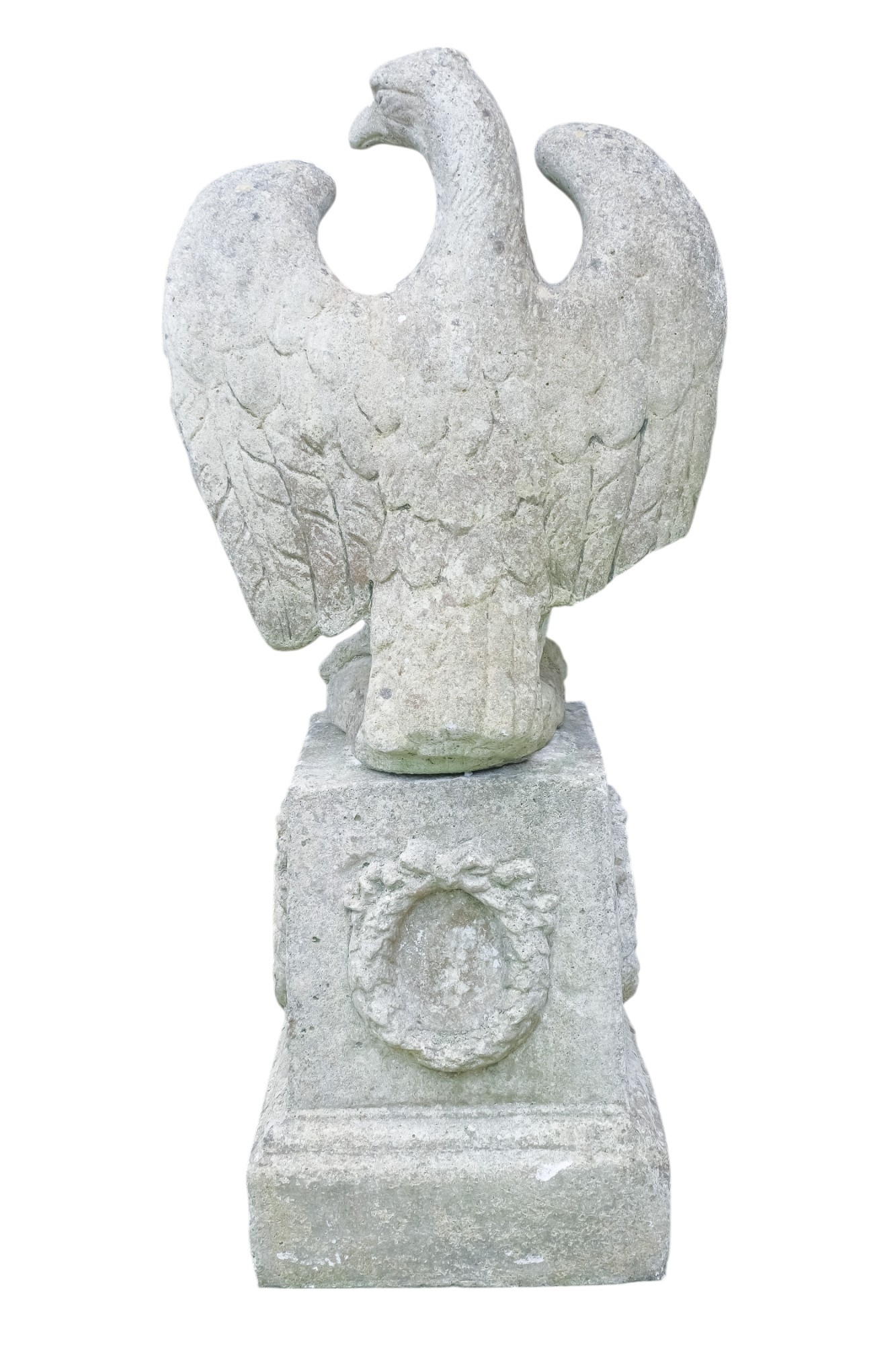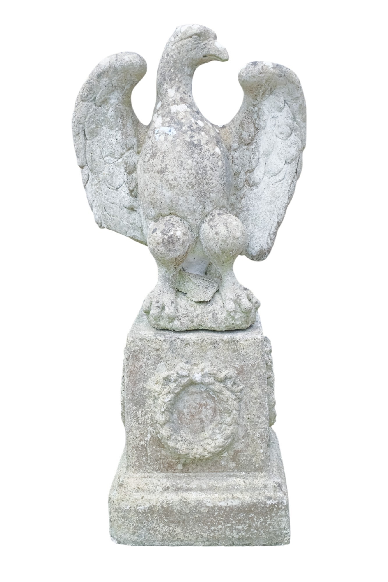 A reconstituted stone eagle - with wings outstretched, height 56cm, width 45cm, raised on a plinth decorated with laurel wreaths, overall height 98cm.