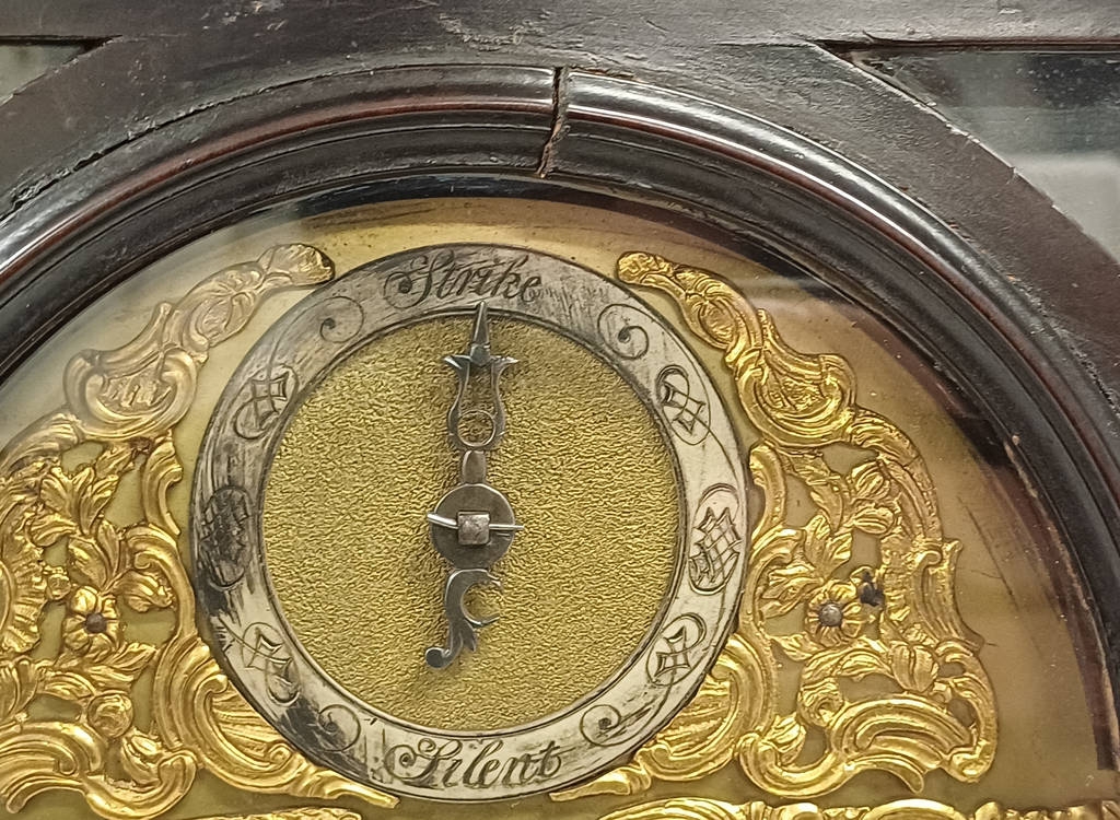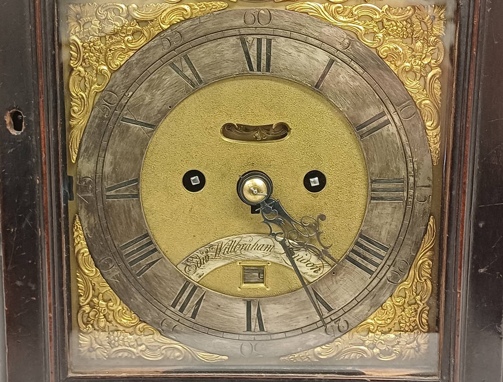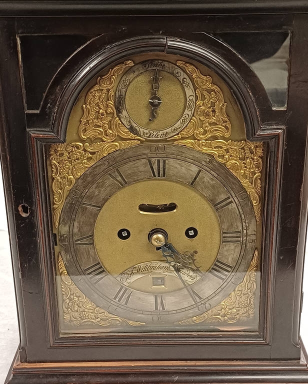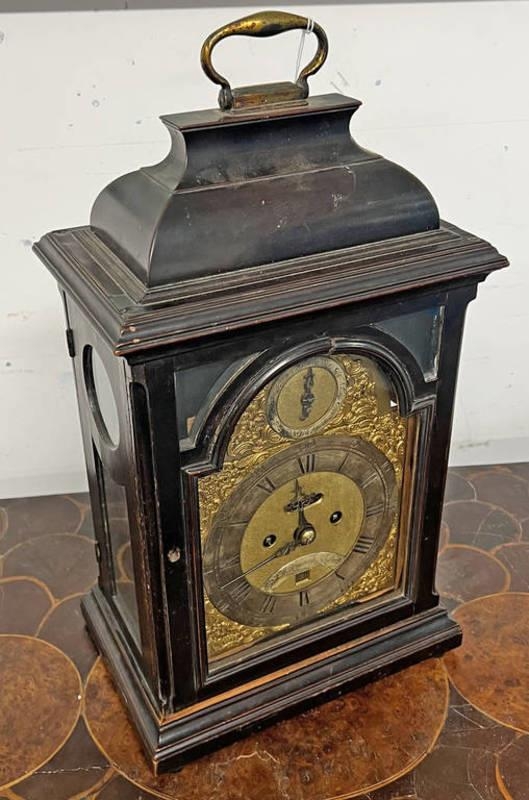 19TH CENTURY BRACKET CLOCK WITH TWIN FUSEE MOVEMENT WITH GILT BRASS AND SILVERED DECORATED DIAL, STRIKING ON A BELL, DIAL MARKED EDWARD WILBBRAHAM LONDON WITH BRASS CARRY HANDLE, 51CM TALL