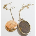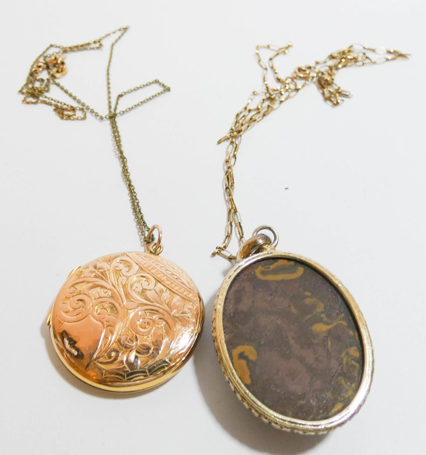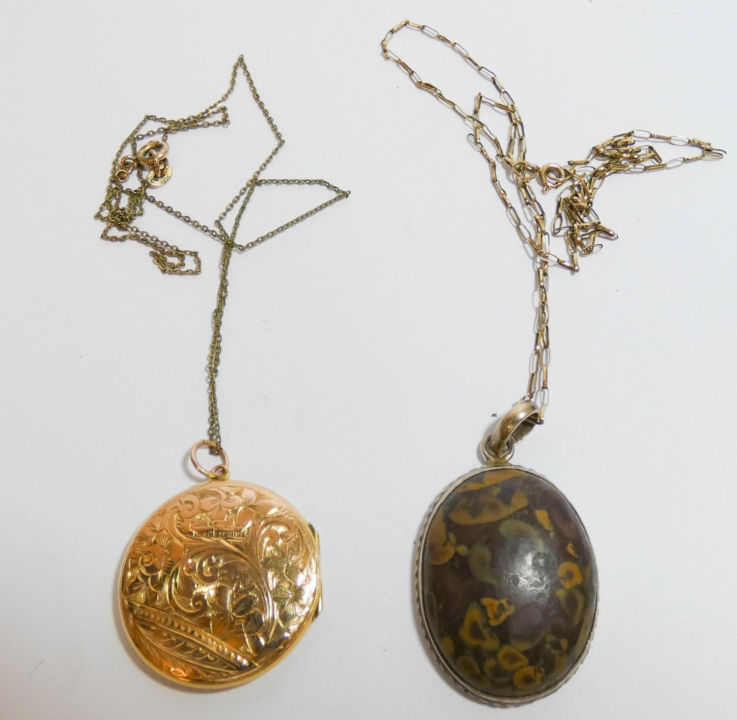 Agate pendant on a 9ct gold chain together with a gilt metal circular locket