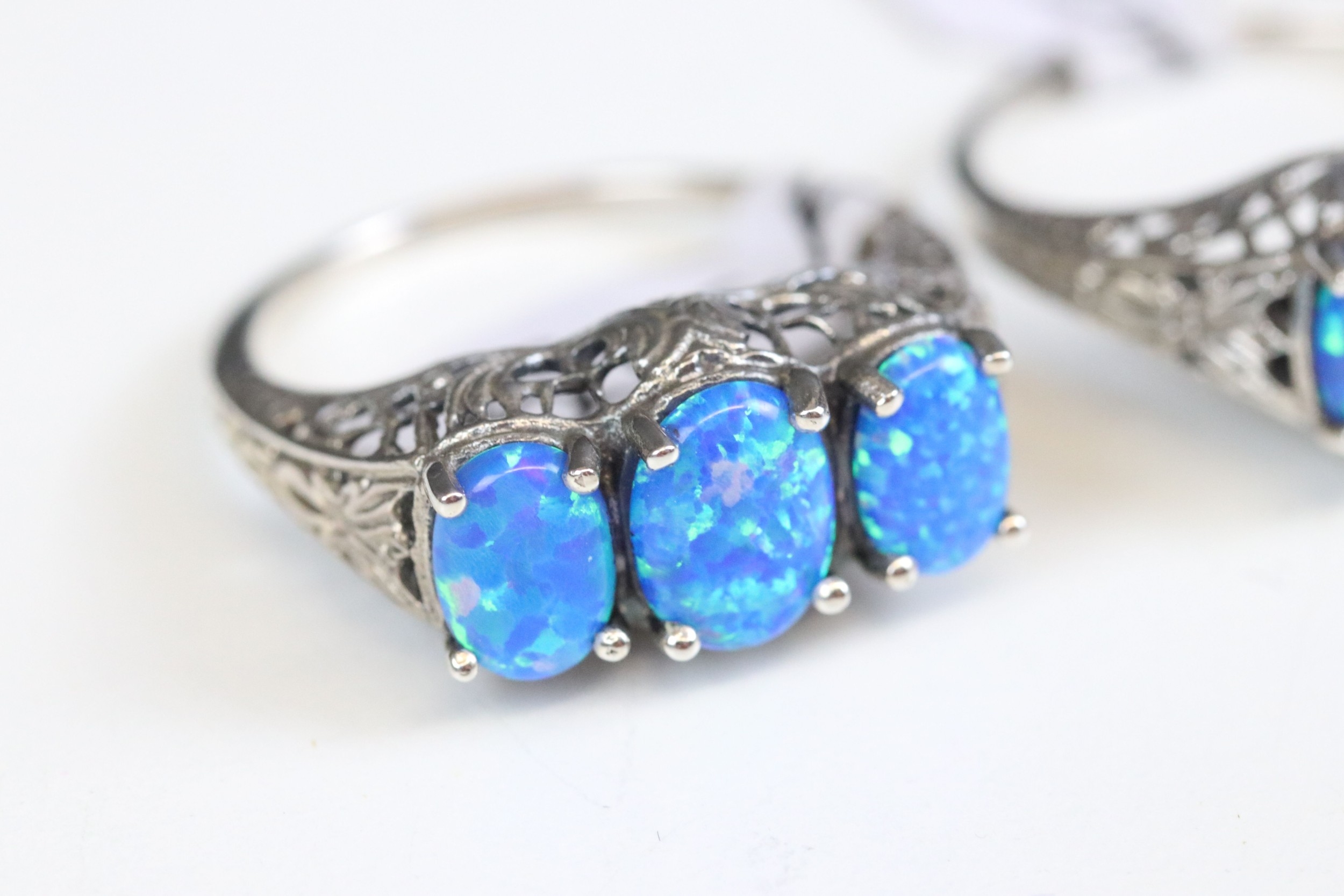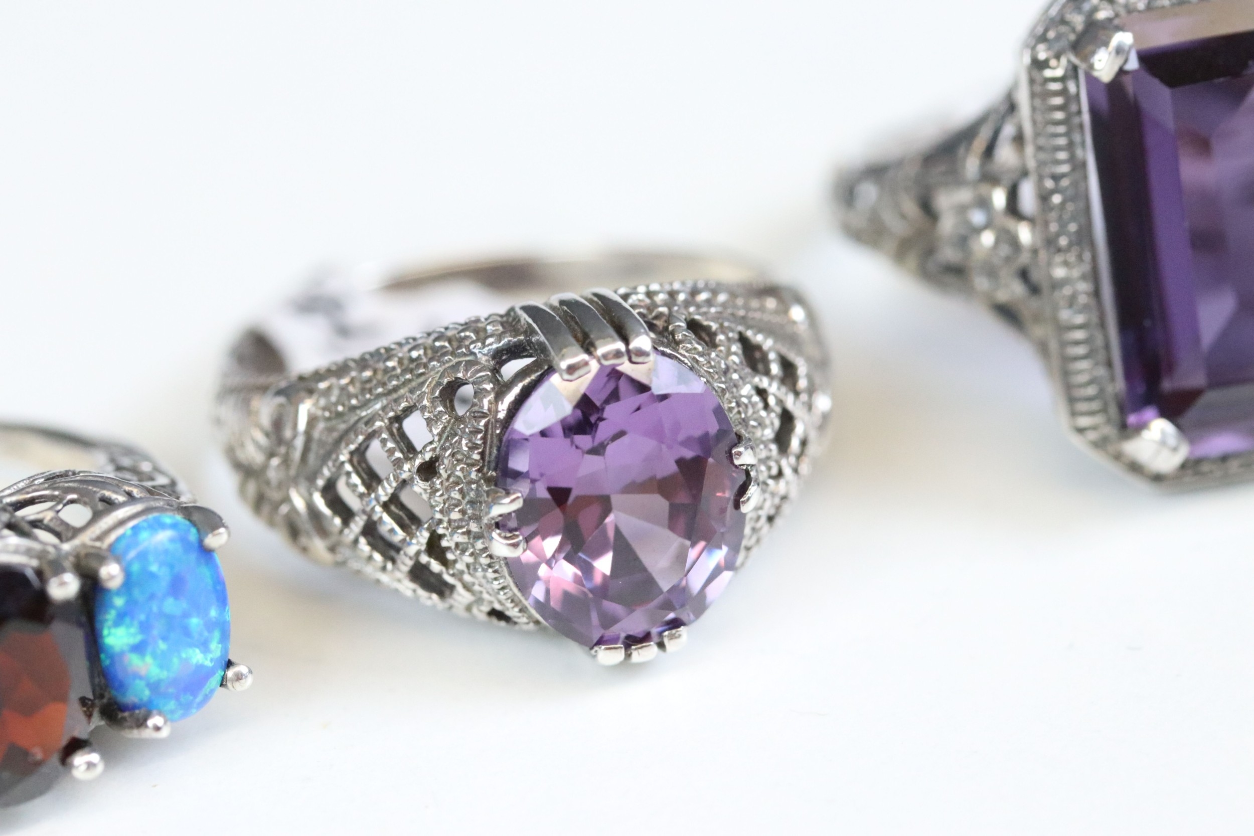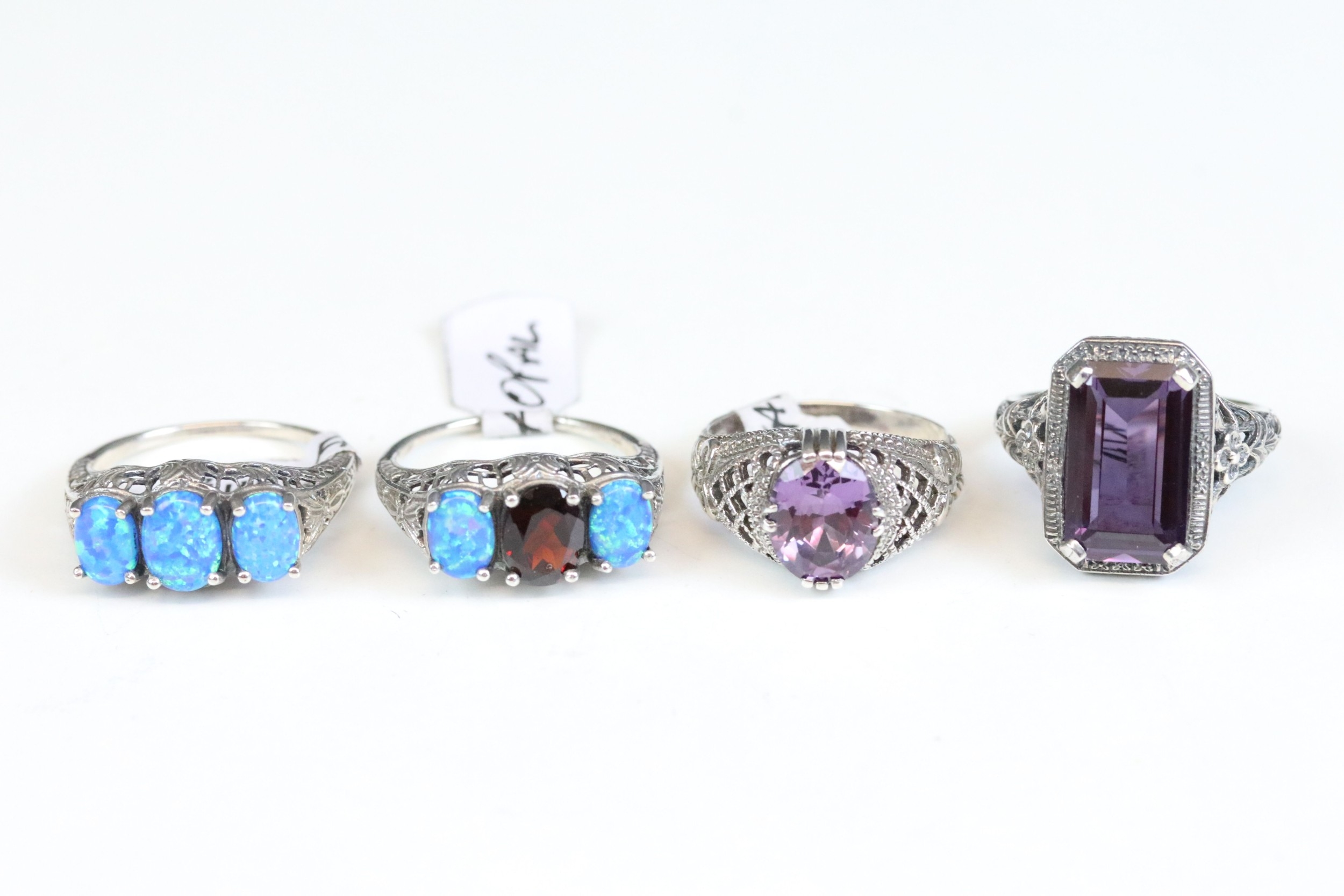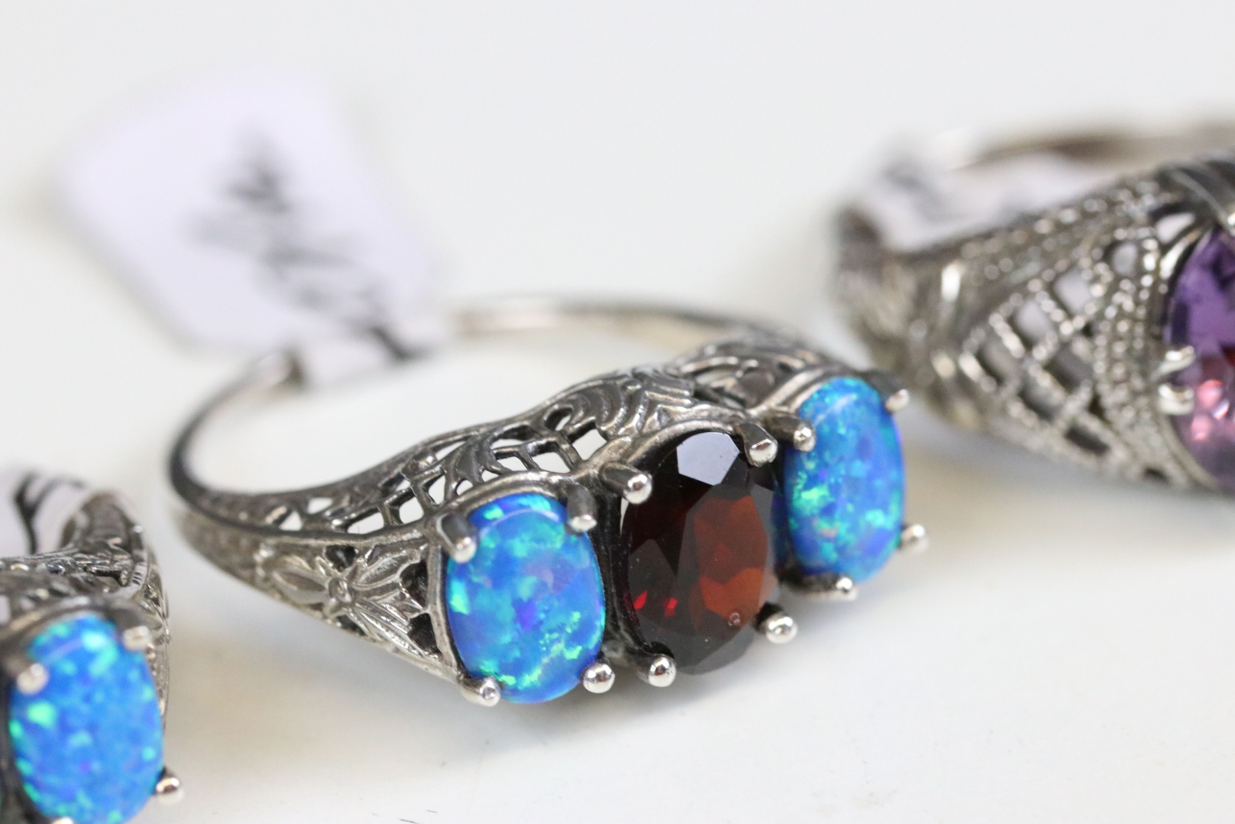 Silver 925 ring with three oval cut blue synthetic opals with filigree surround, together with a similar synthetic opal and red stone example and emerald cut and oval cut purple stone rings with silver filigree detailing (4)