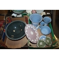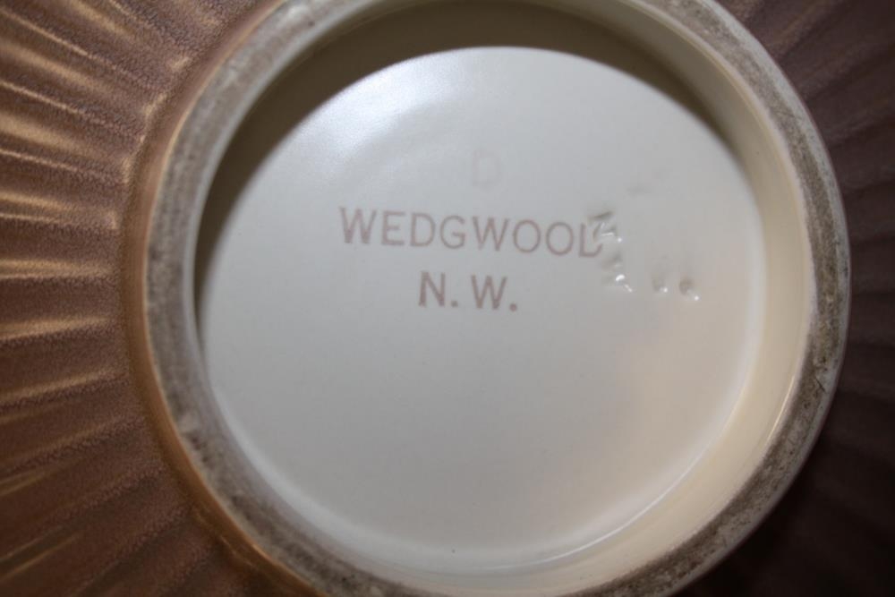 A SMALL TRAY OF WEDGWOOD JASPERWARE TO INCLUDE A LILAC CABINET PLATE TOGETHER WITH A WEDGWOOD N.W. BOWL WITH GLAZED INTERIOR (SLIGHT DAMAGE)