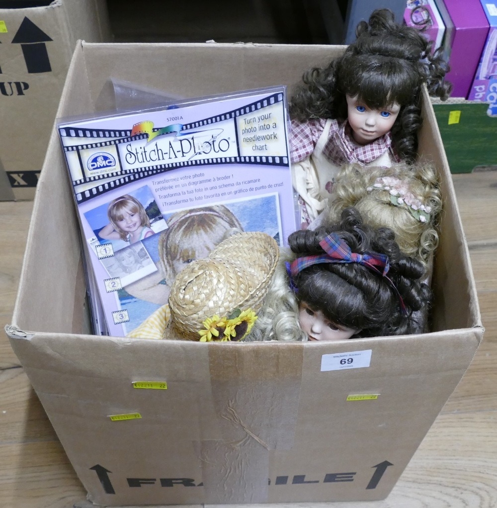 Four porcelain collectors' dolls and Stich-a-Photo needlework kits