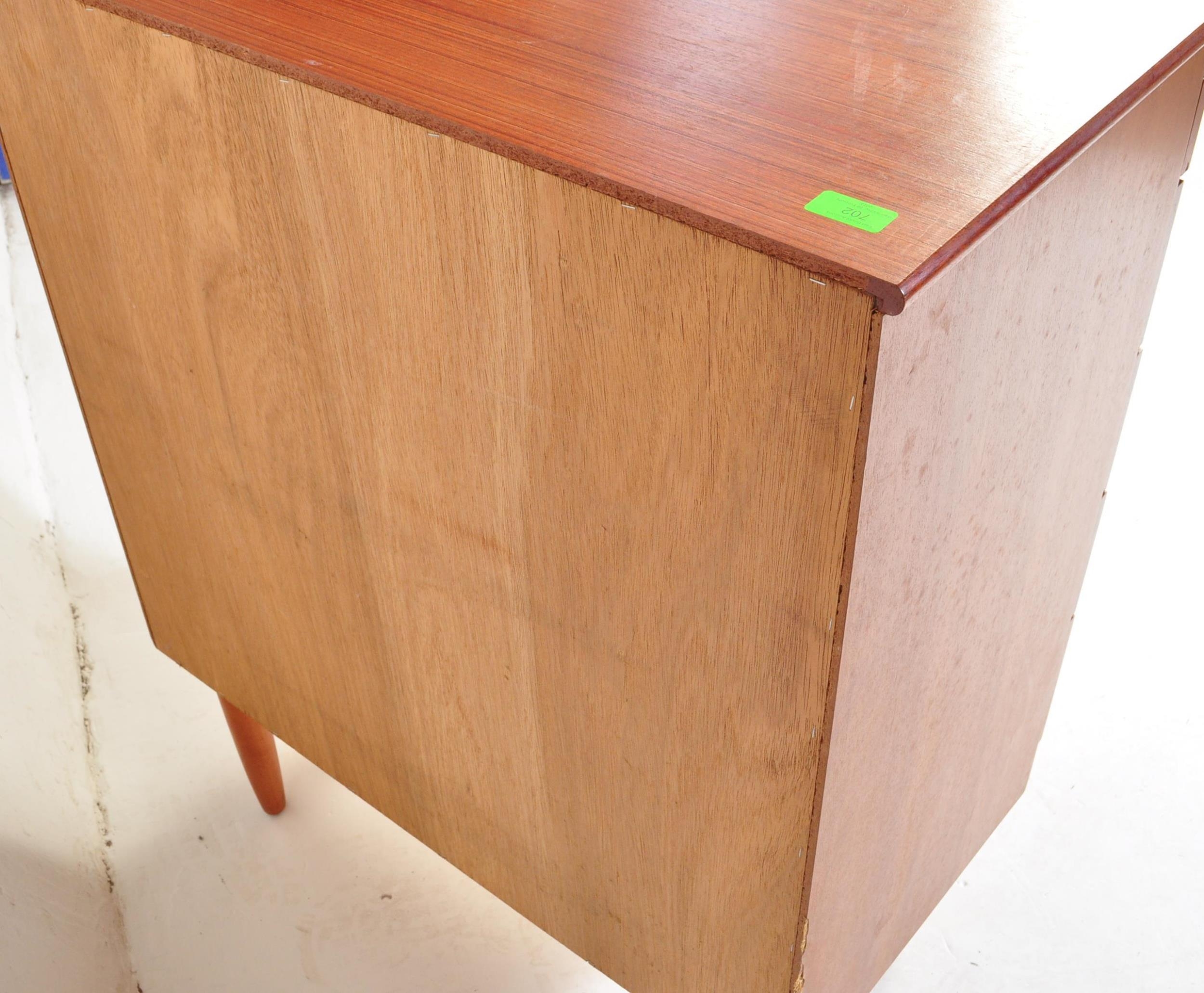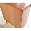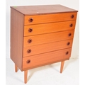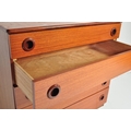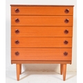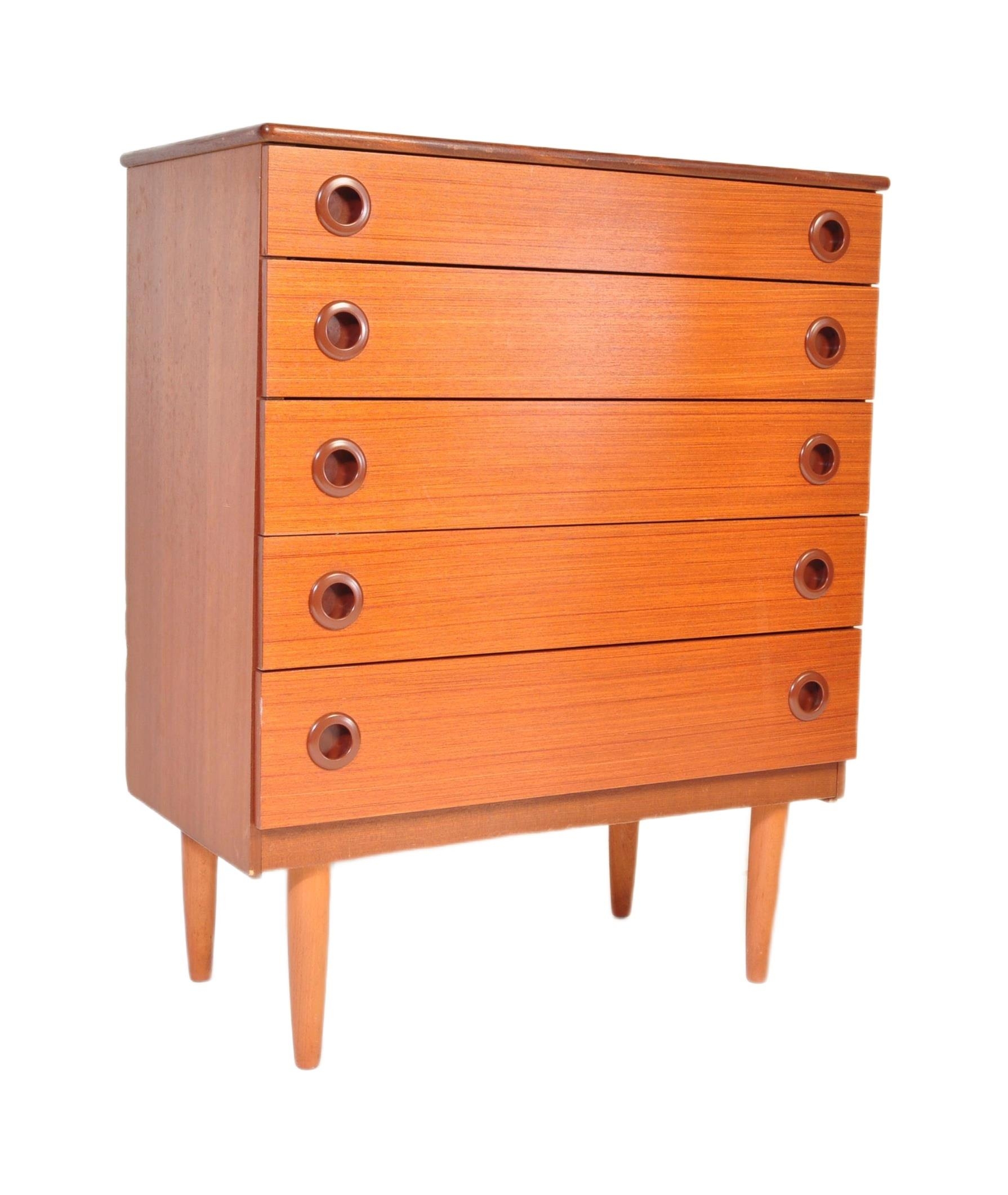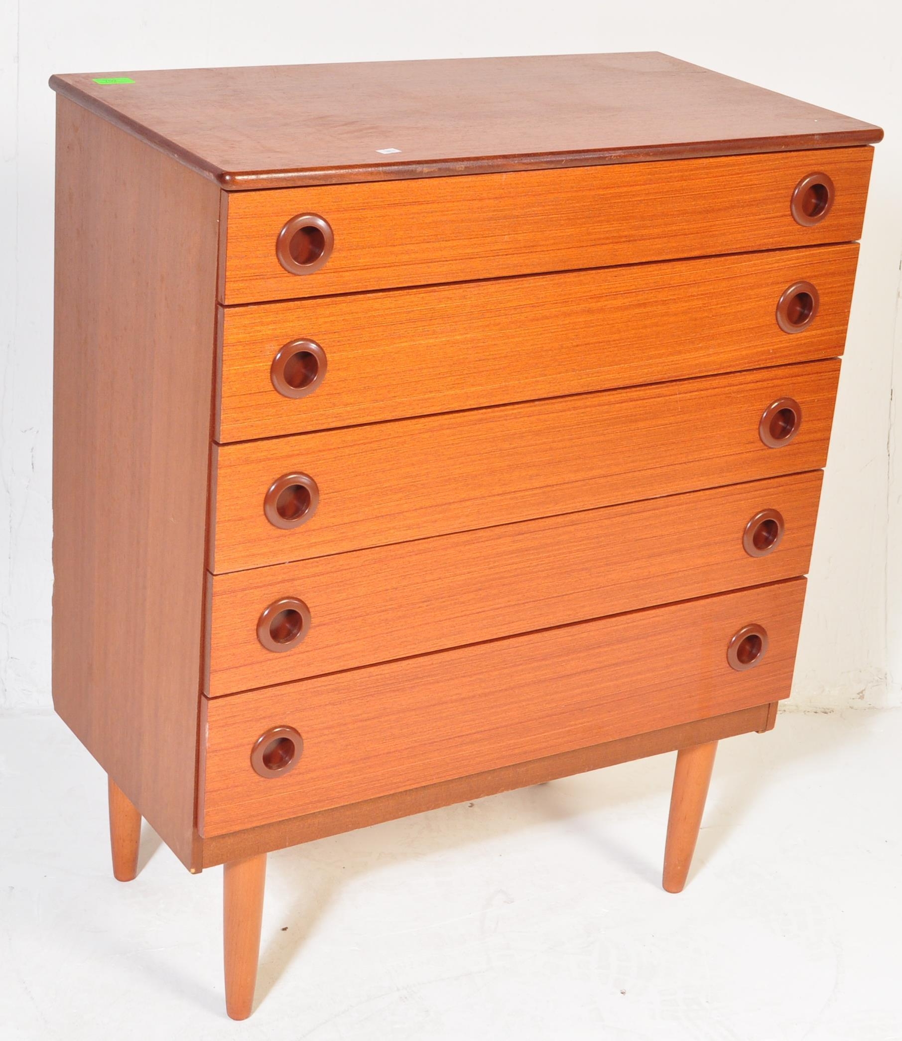 A retro mid 20th century Danish inspired teak chest of drawers having a bank of five drawers each with concave handles, raised over tapering supports. Measures approx; 93cm x 75cm x 40cm.