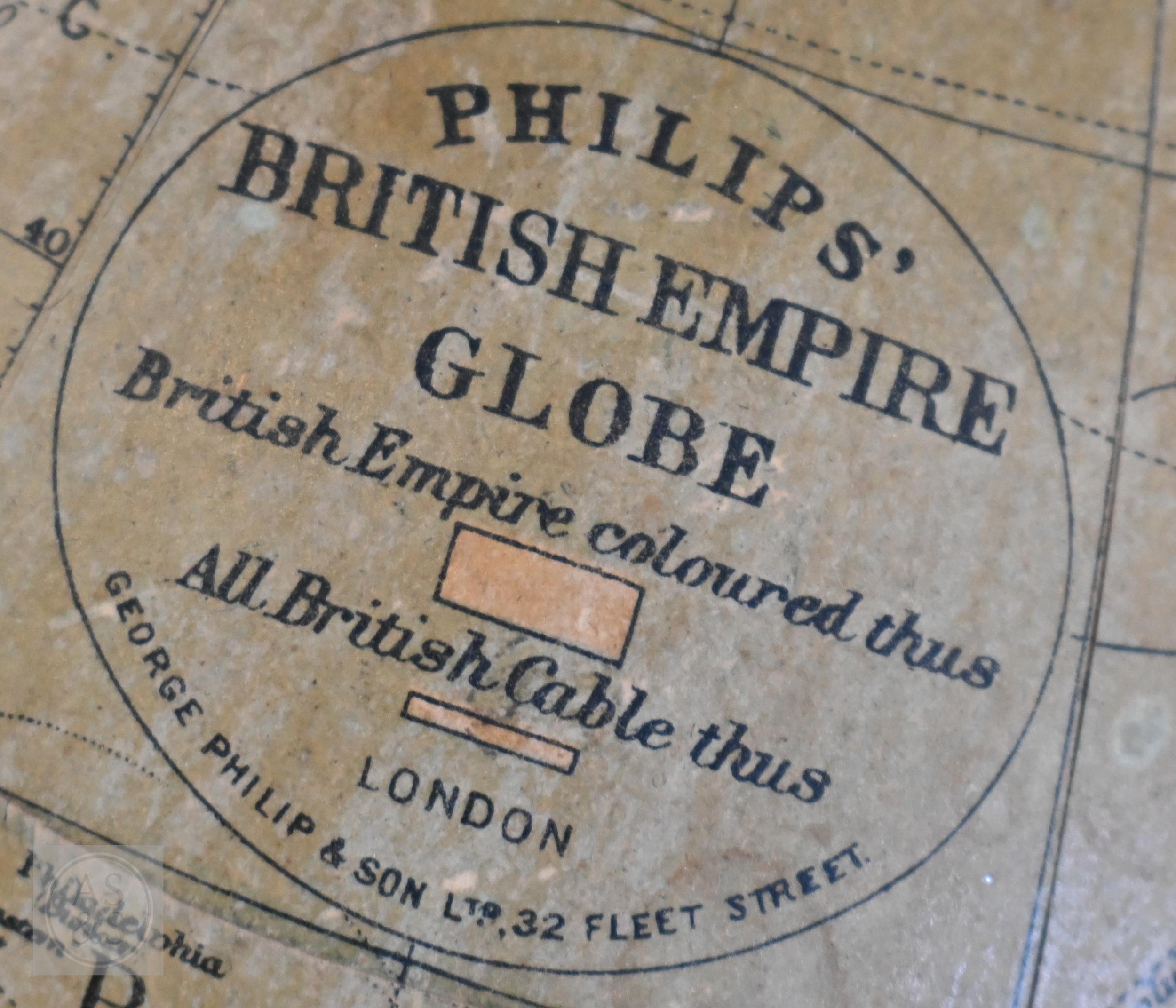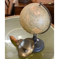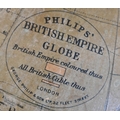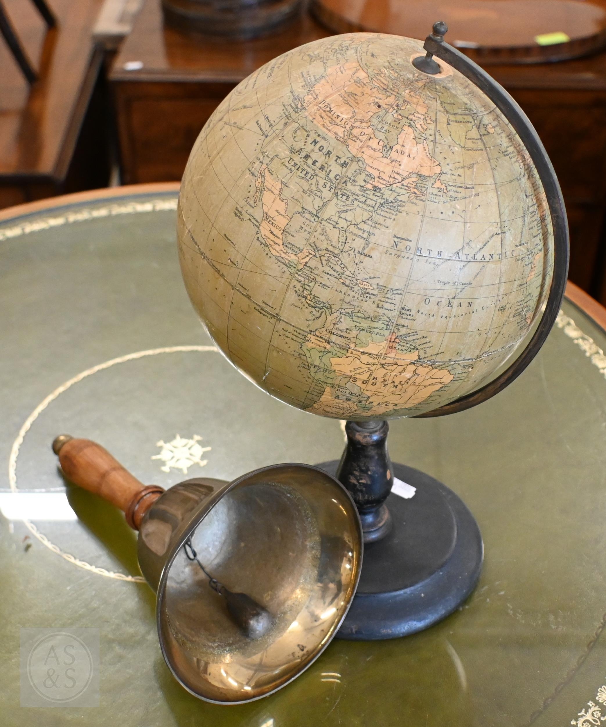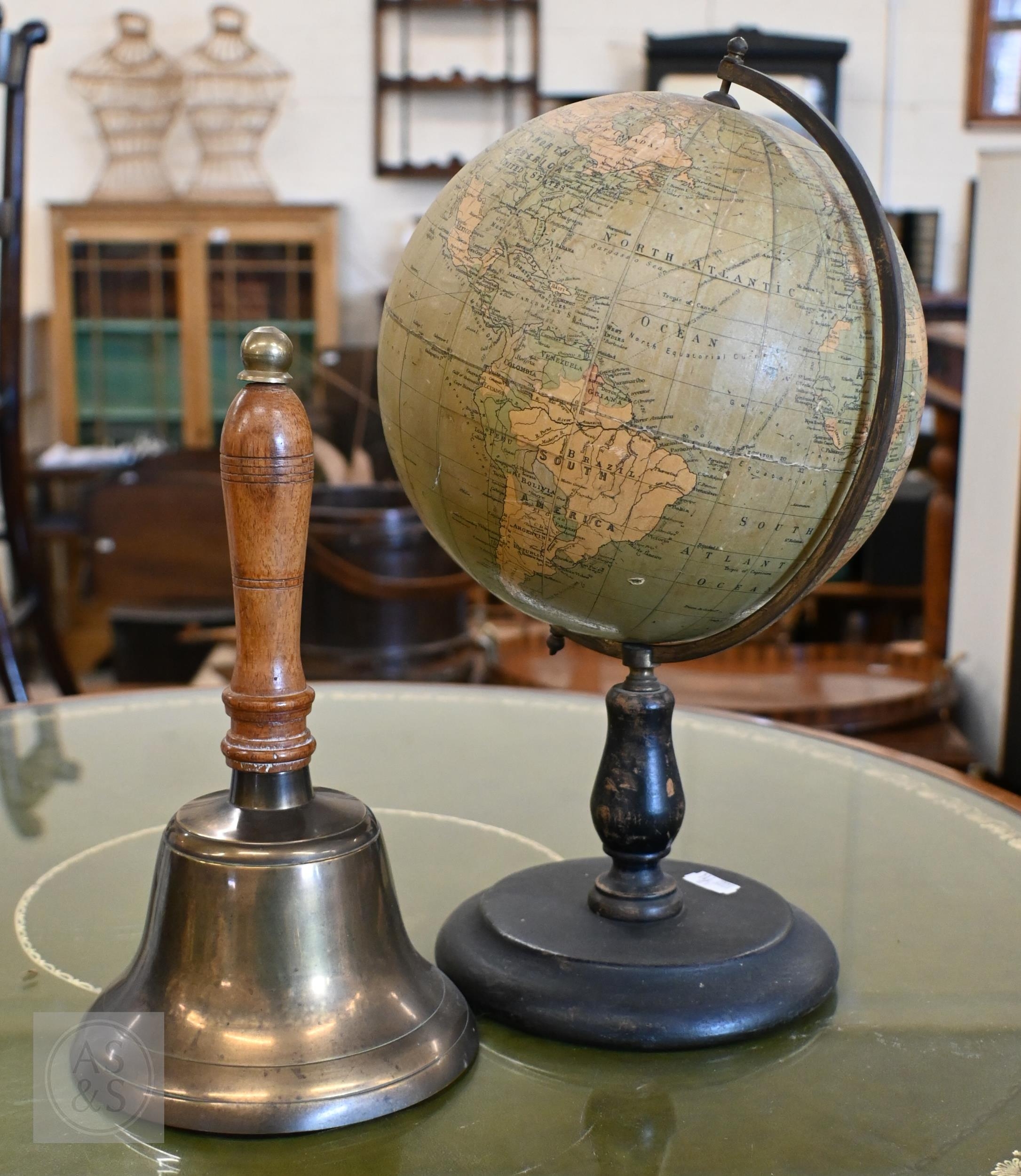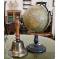 A vintage Philips' British Empire Globe 19cm diam on metal and turned wood base, to/w a brass hand-bell (2)
