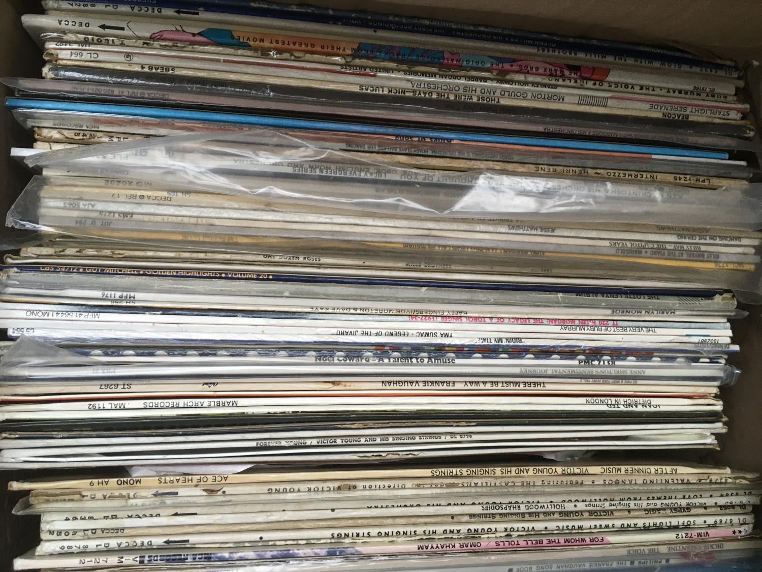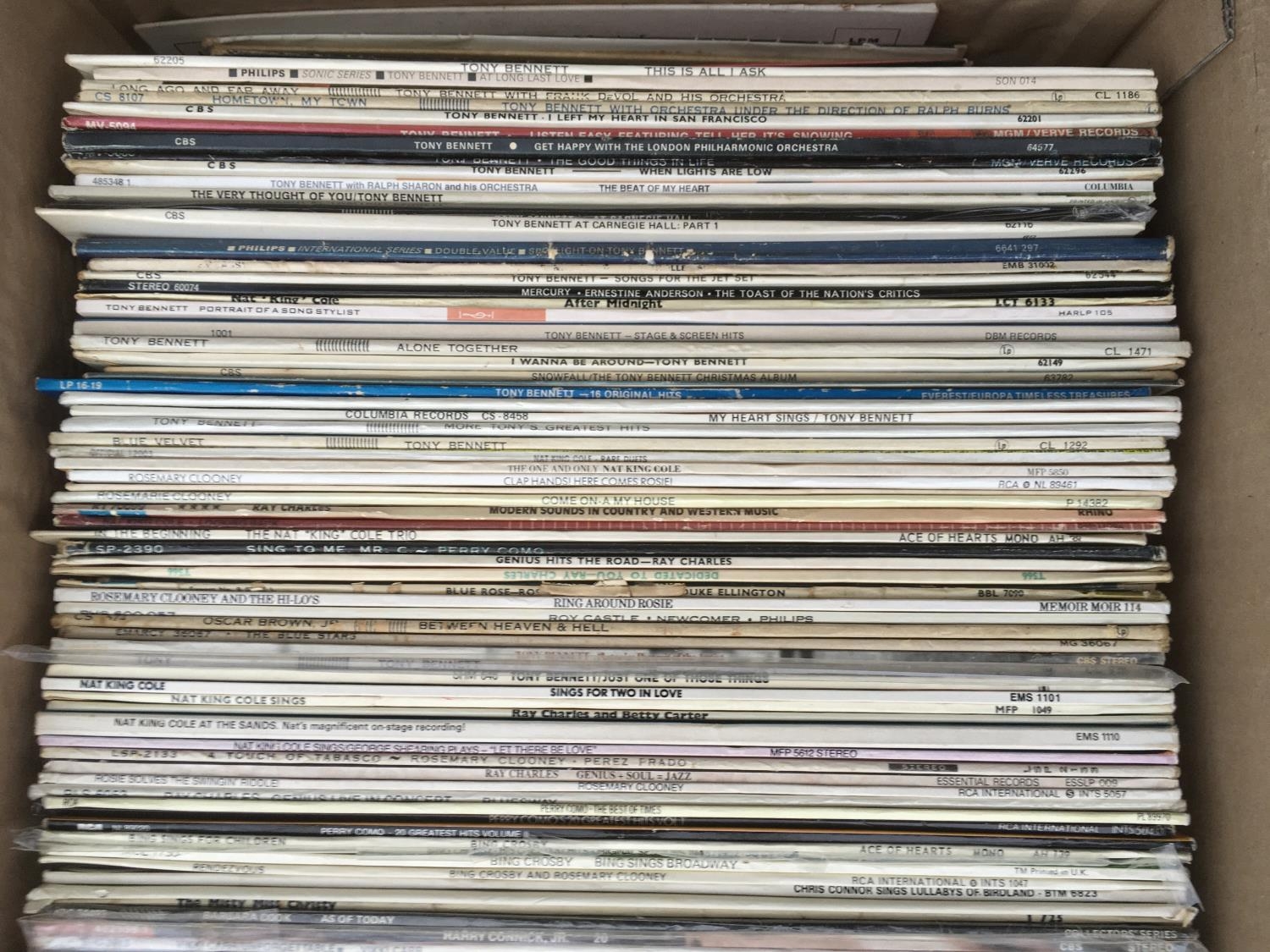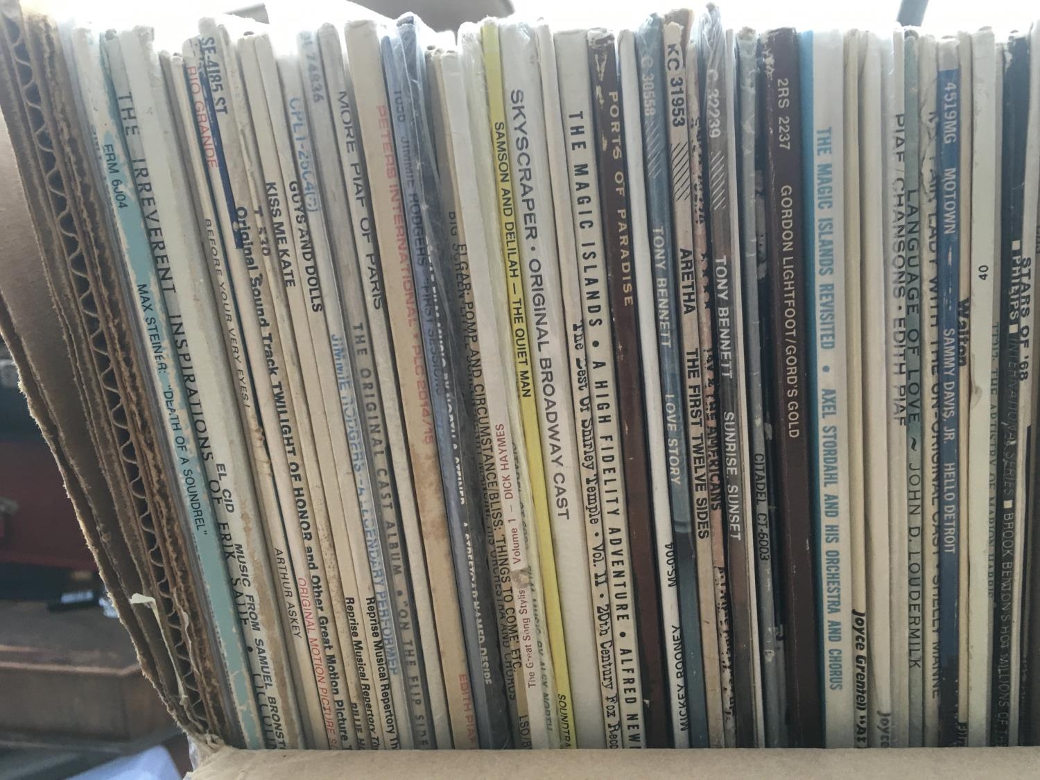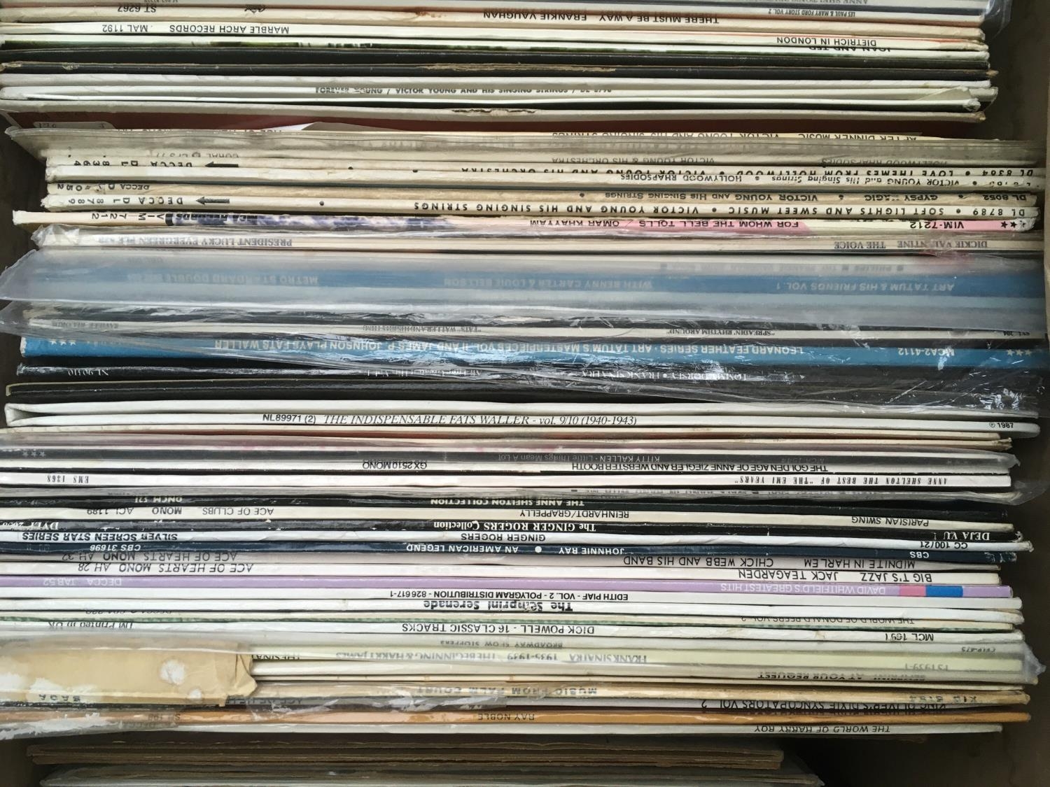 Four boxes of LPs and 10 inch records including jazz titles and popular shows of the 1940s/50s and 60s.